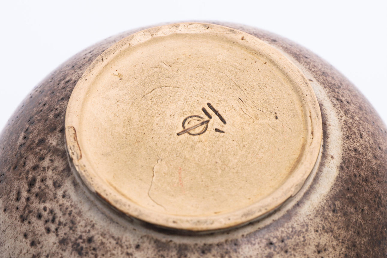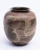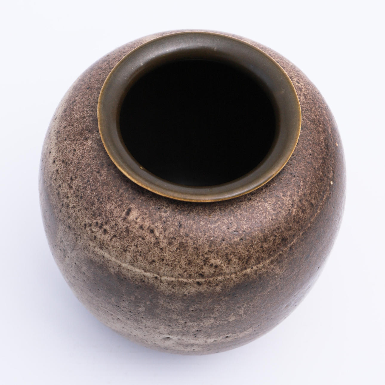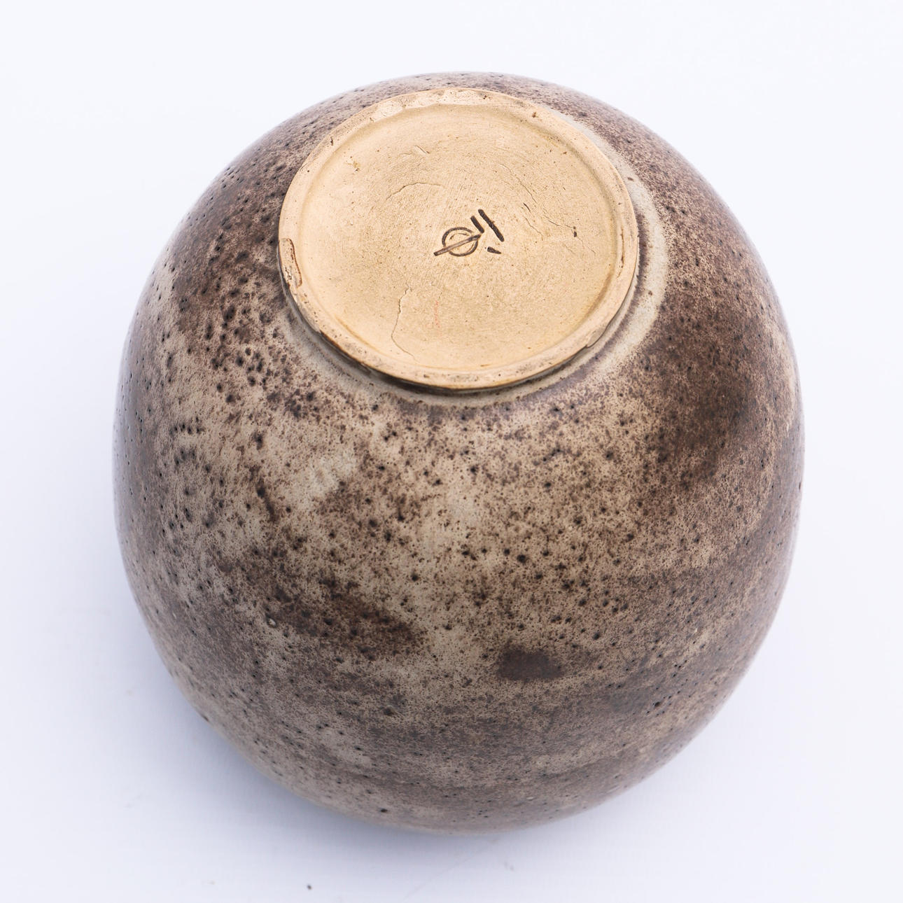 Vase. stoneware. Translucent brown, cloudy glaze over a stone-grey ground. Inside matt olive. H. 16.5 cm. Marked on the bottom with workshop mark OL with underline and small additional notch lower left (scratched).