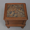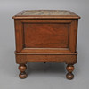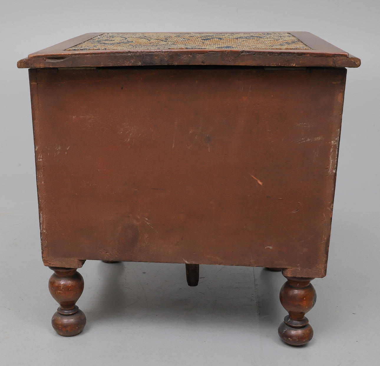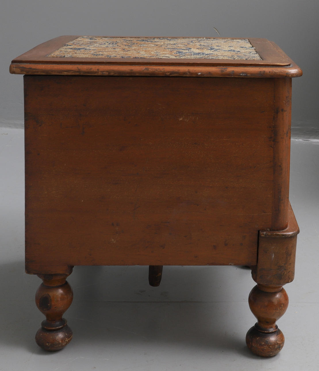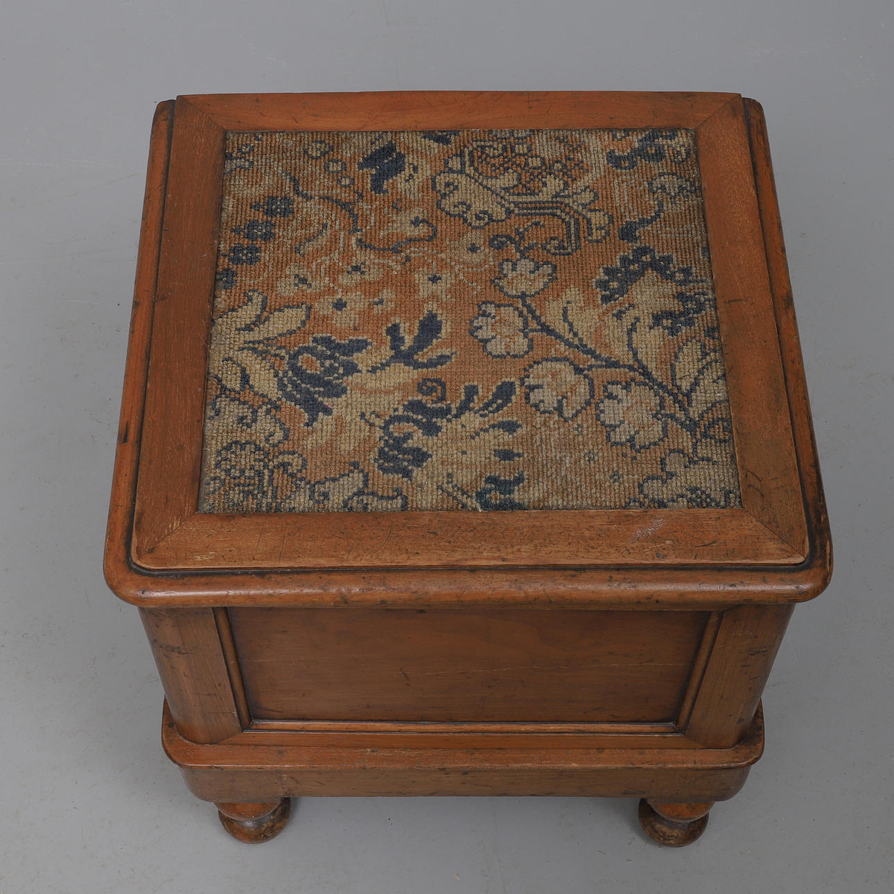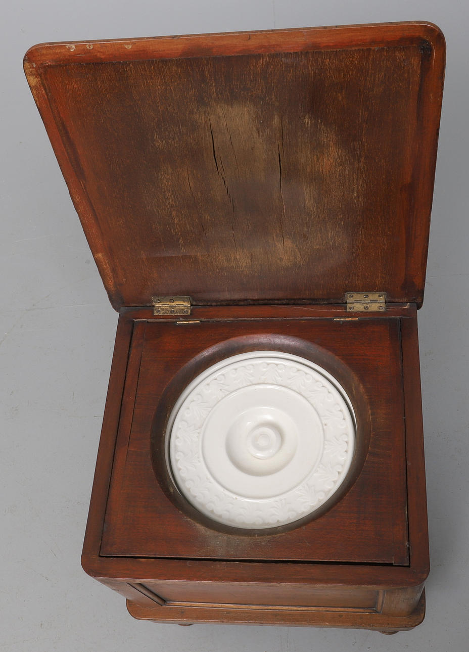 with carpet inset moulded hinged top and pull-out step, cream ceramic liner with lift-off cover, on turned legs, 44cm wide x 40cm deep x 40cm high.