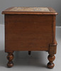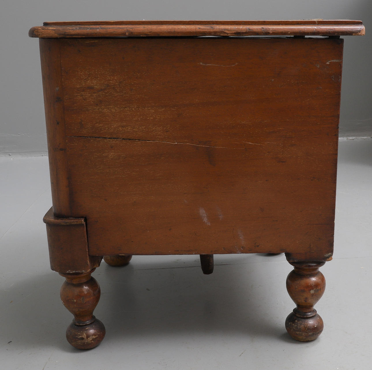 knocked, marked, scratched and stained, uneven colour, inside of hinged cover with veneers split and rippled, splits in the sides.