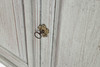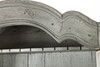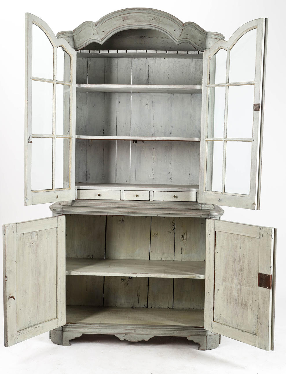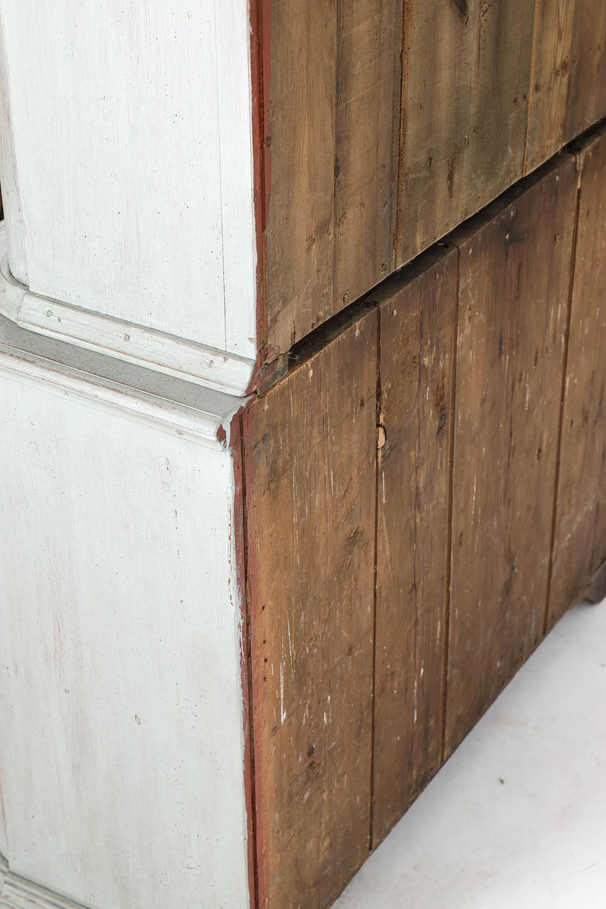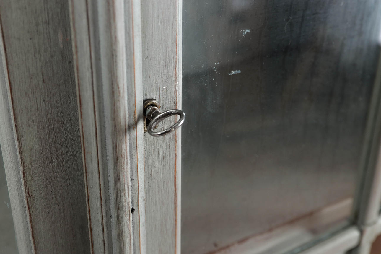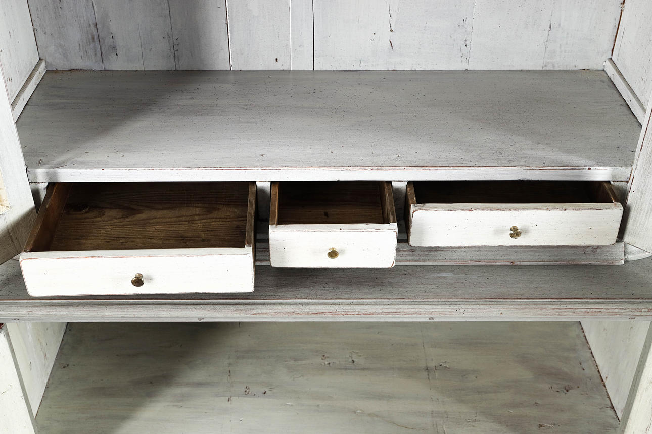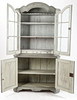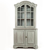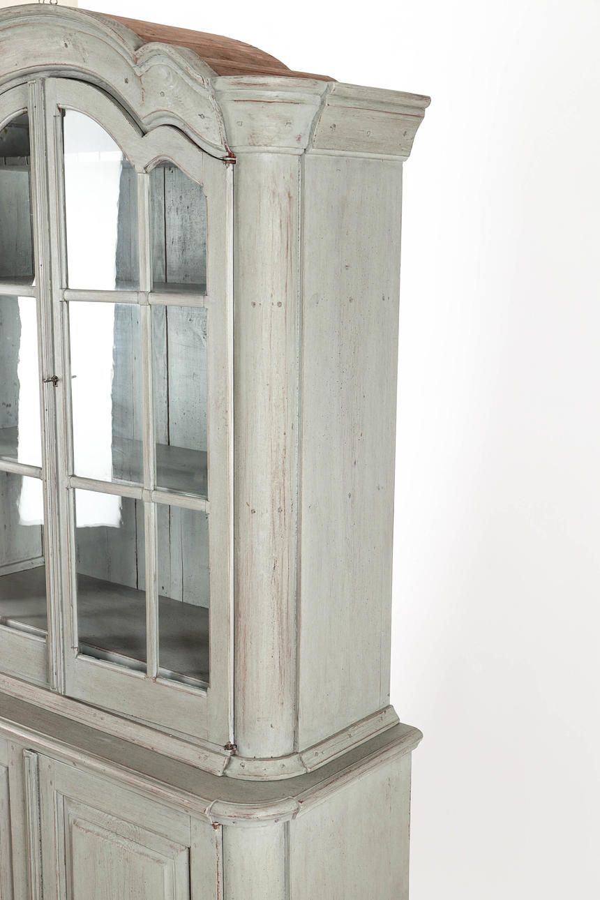 Grey-lacquered, upper part with glazed door pair behind which shelf decor and drawers. Bottom pair of doors with shelf decoration. Divisible. 106x44, height 204 cm.