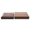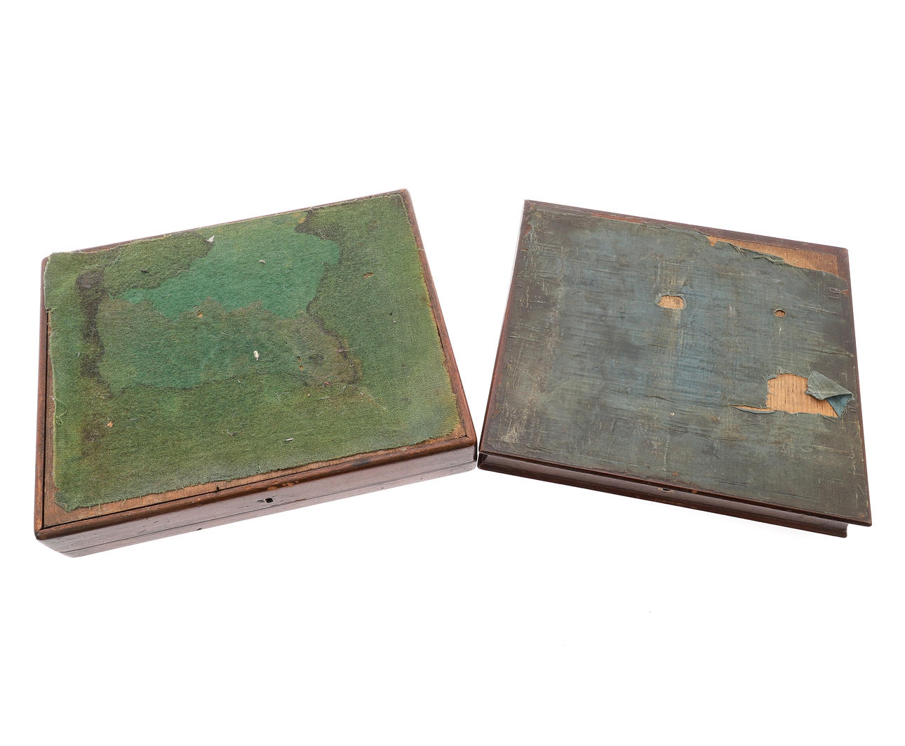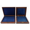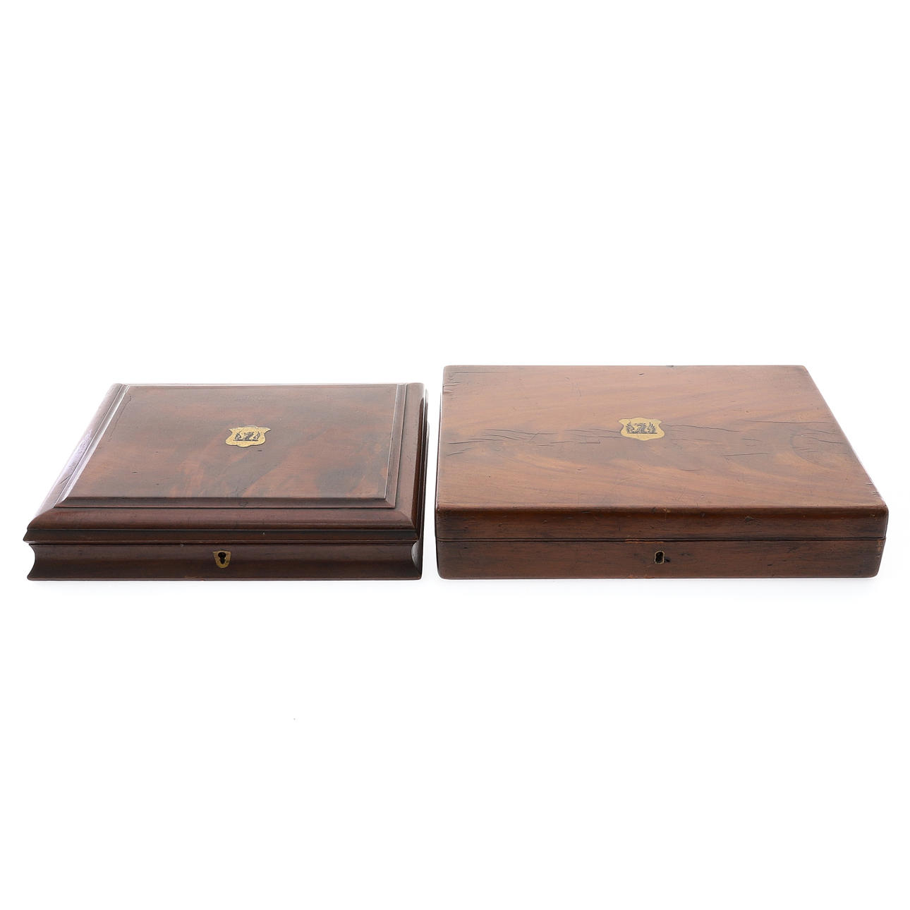 both with hinged covers centred by a brass cartouche engraved with a crest, each enclosing a blue baize lined lift-out tray, one, 33.5cm x 26cm x 6.5cm, the other, 29cm x 26cm x 6cm (2)