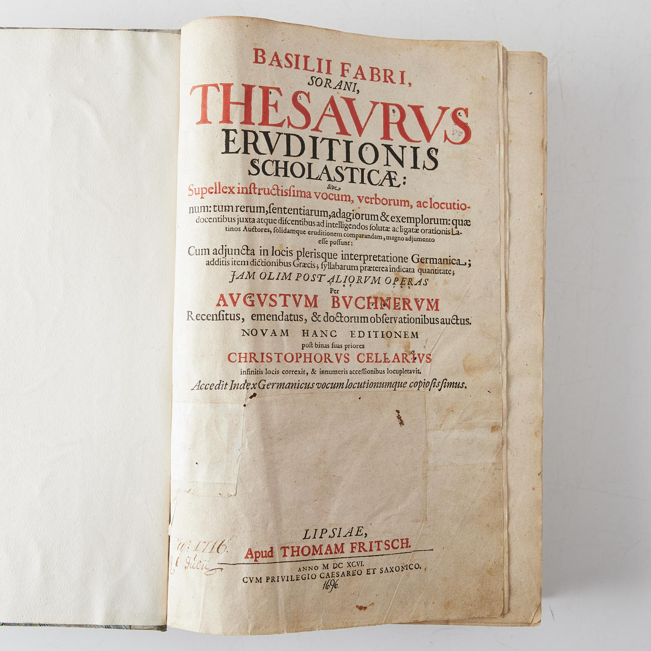FABRI, BASIL. Thesaurus eruditionis scholasticae: sive Supellex instructissima vocum, verborum, ac locutionum: tum rerum, sententiarum, adagiorum ac exemplorum[.... Jam olim post aliorum operas per Augustum Buchnerum... Novam hanc editionem pist binas suas priores Christophorus Cellarius... Accedit index Germanicus... Lipsiae, apud Thomam Fritsch, exudebat Immanuel Titius, 1696.