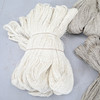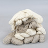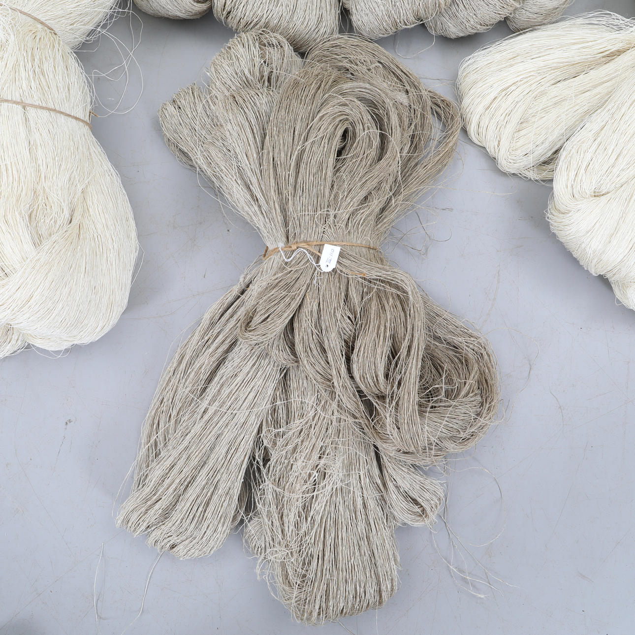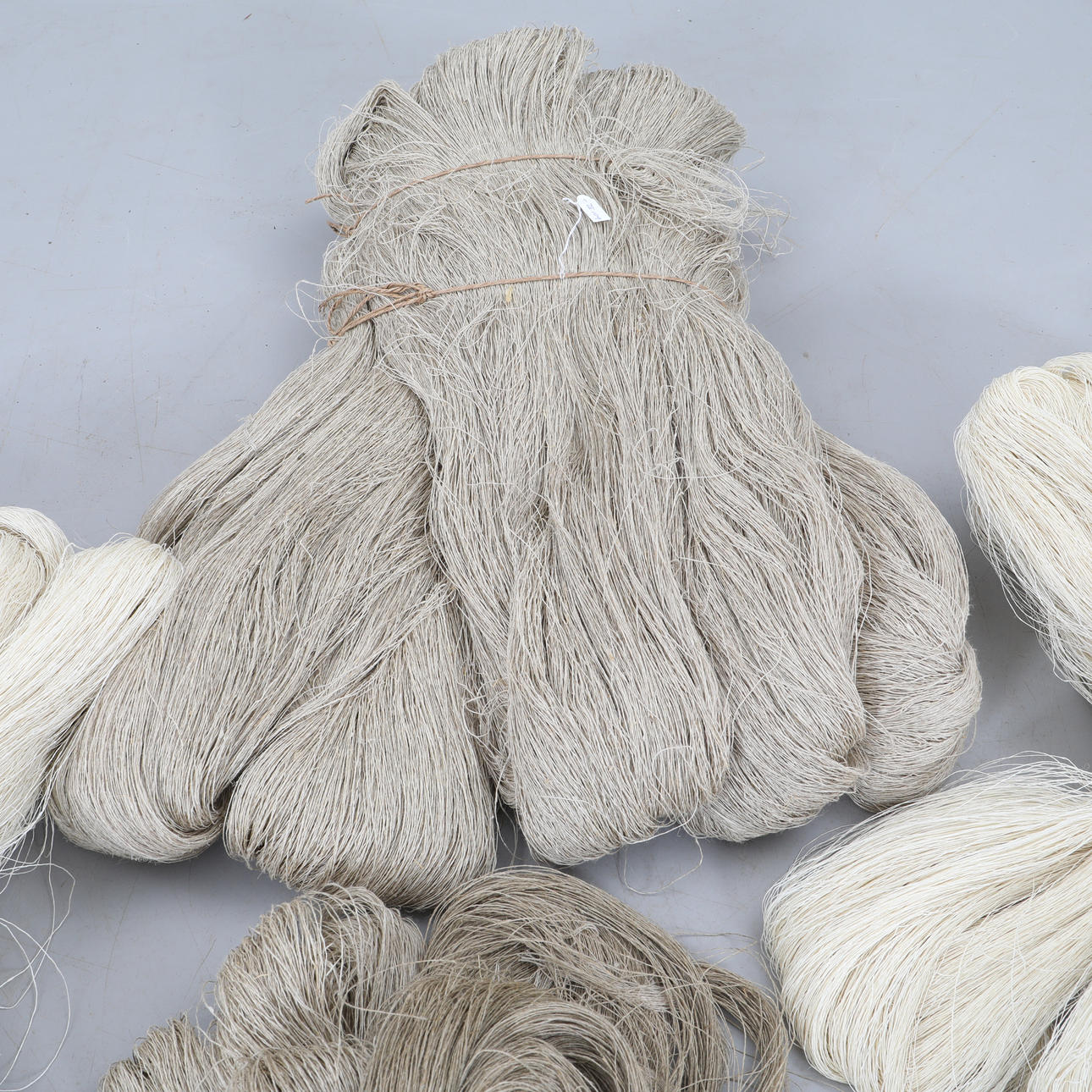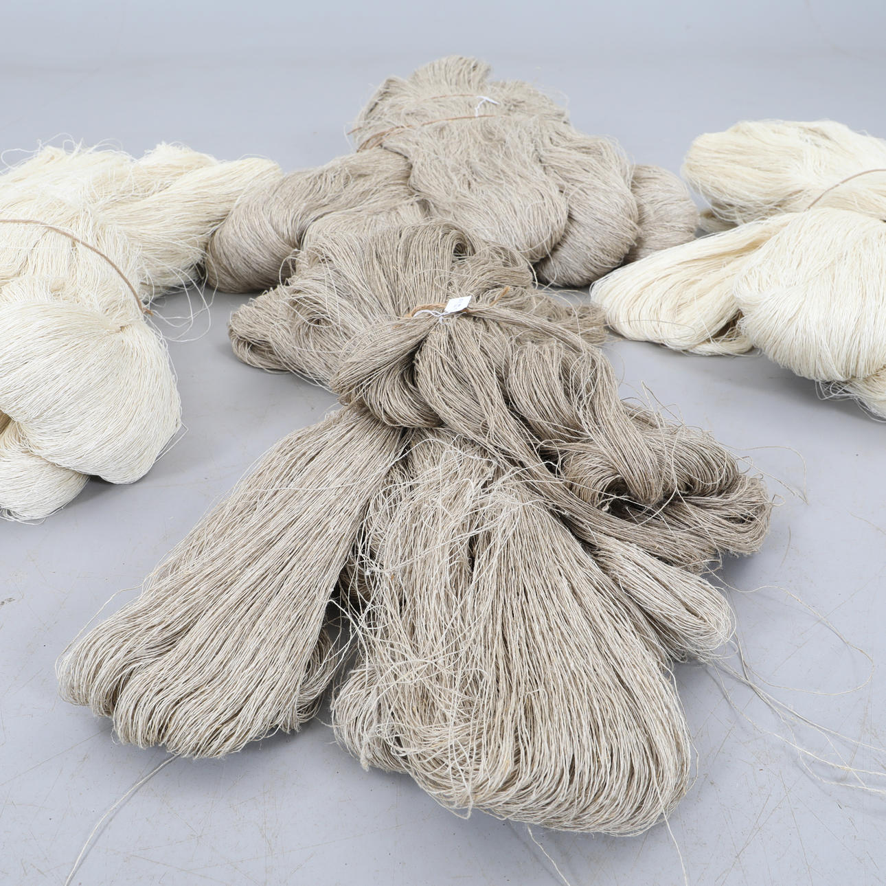 Large and smaller skeins, unbleached and bleached yarn.