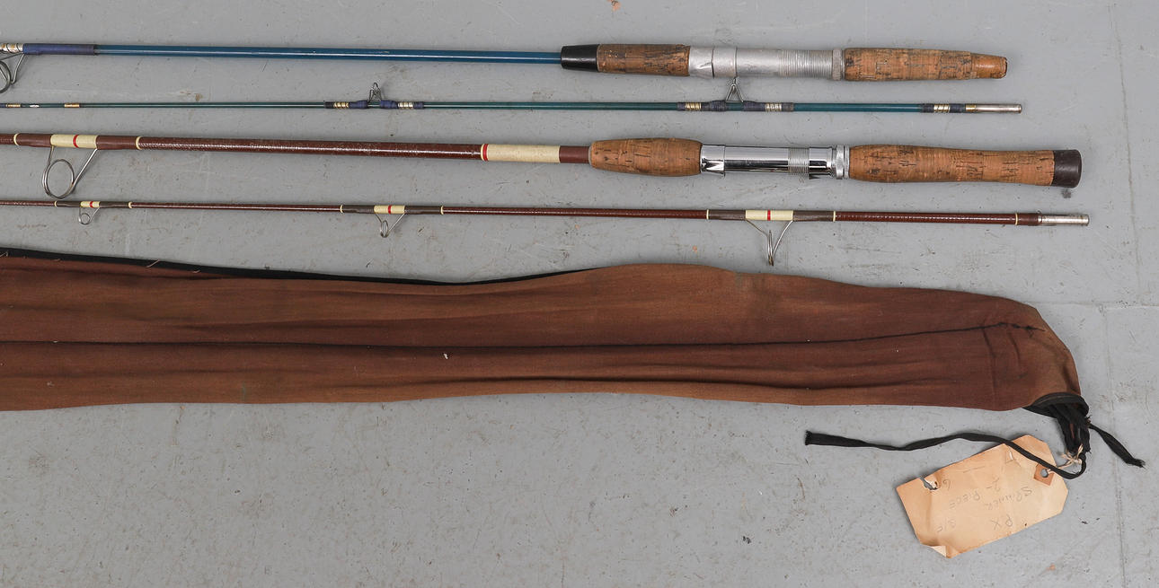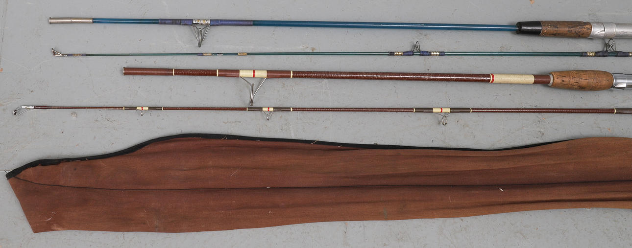 a two-piece 7' spinning rod, and another two-piece rod, two with canvas carrying bags (3).