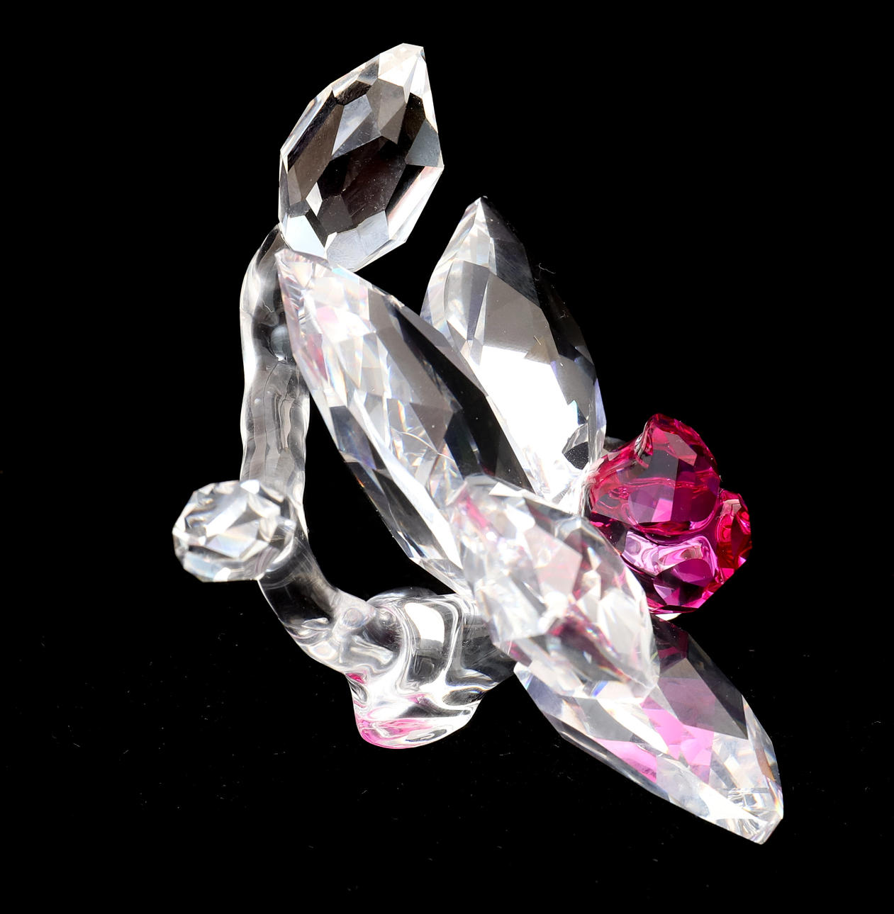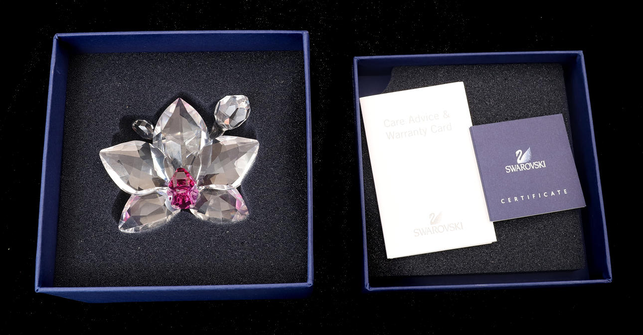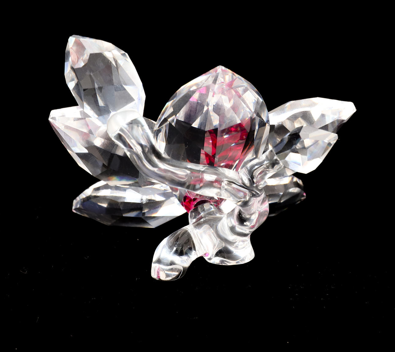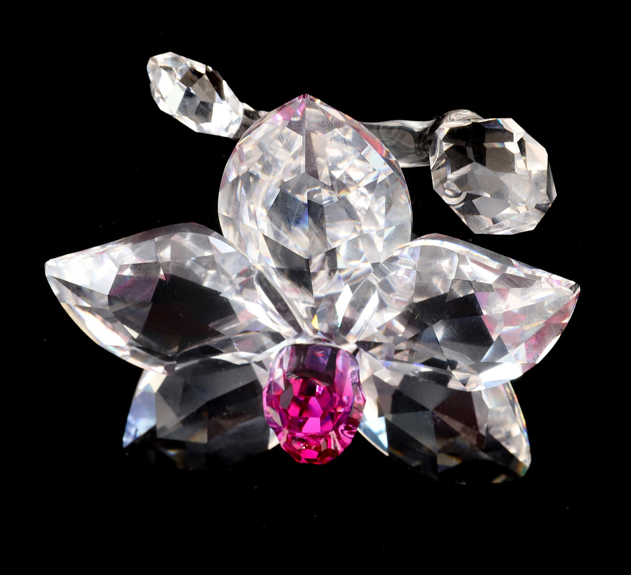 number 864464, the orchid blossom faceted in clear crystal the centre in fuchsia rain crystal, two small buds in faceted clear crystal on an non faceted stem, 5.5cm high x 8cm wide, with certificate and box and cardboard outer cover.