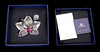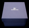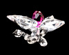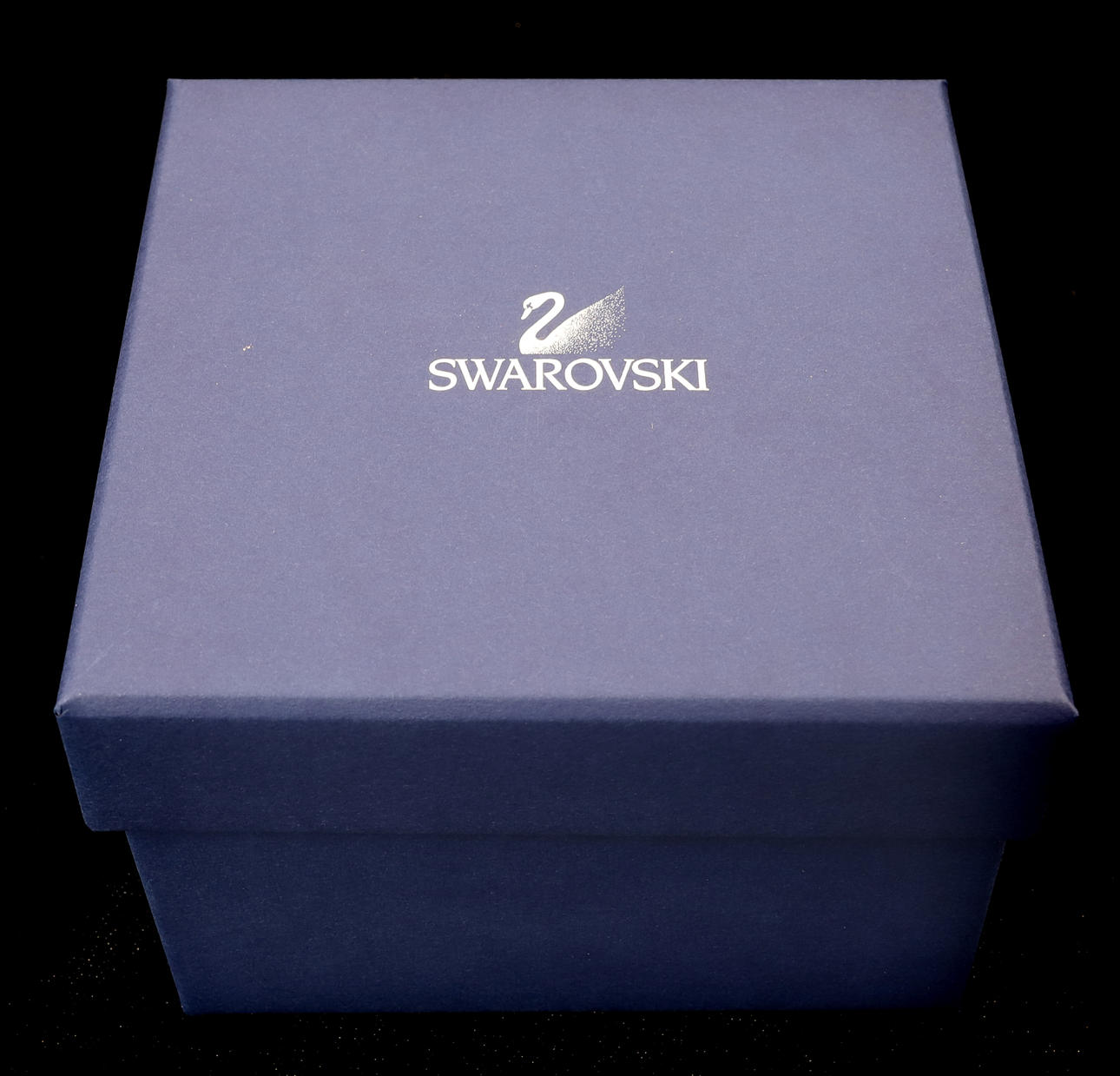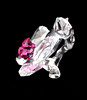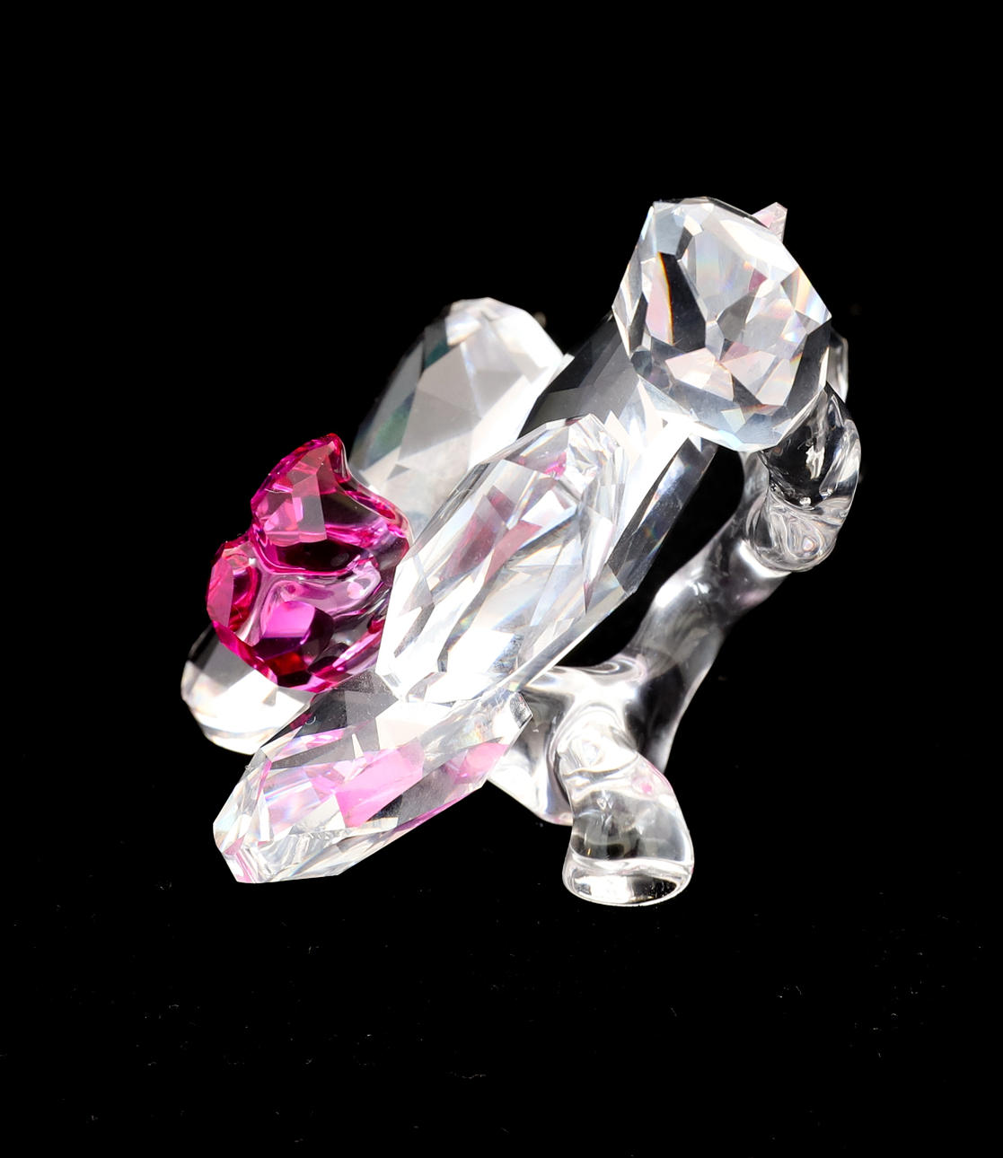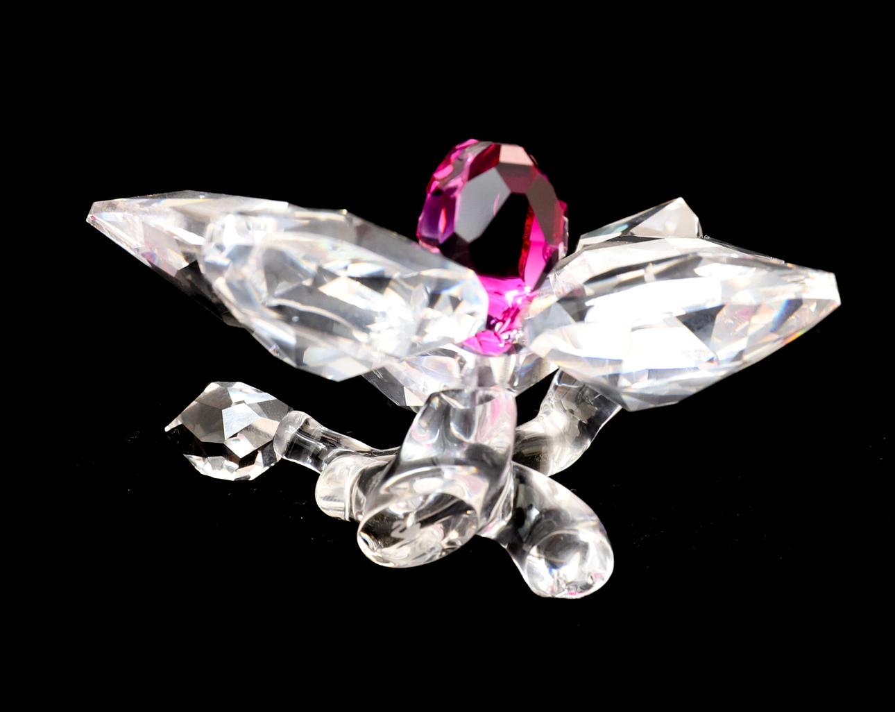 number 864464, the orchid blossom faceted in clear crystal the centre in fuchsia rain crystal, two small buds in faceted clear crystal on an non faceted stem, 5.5cm high x 8cm wide, with certificate and box and cardboard outer cover.