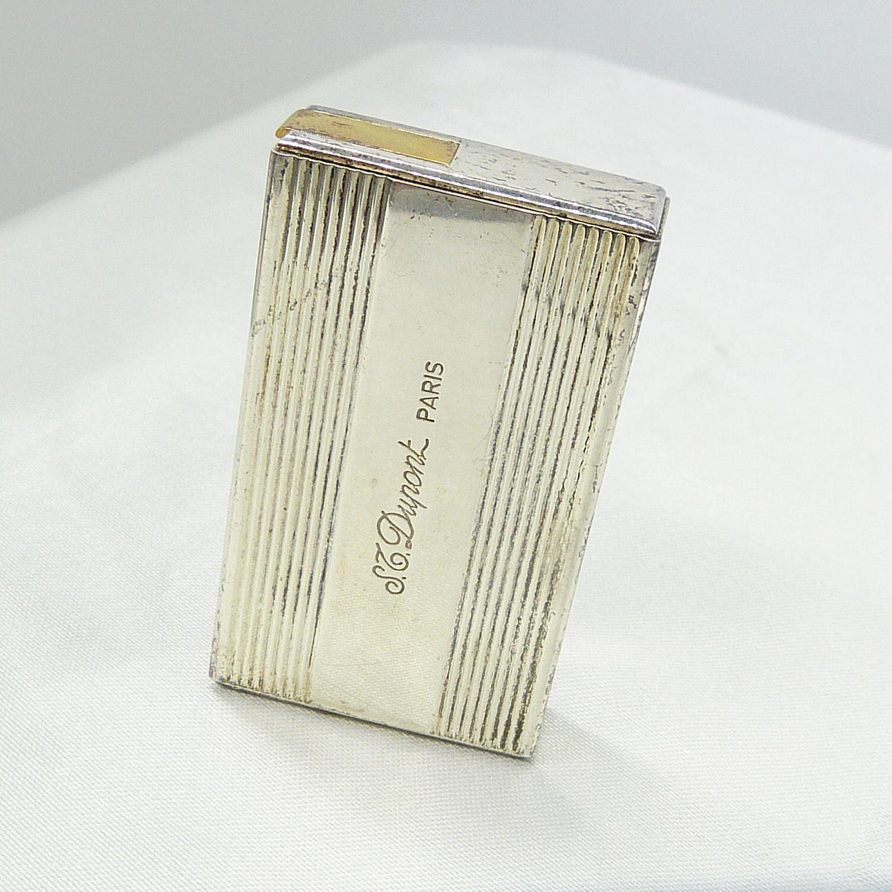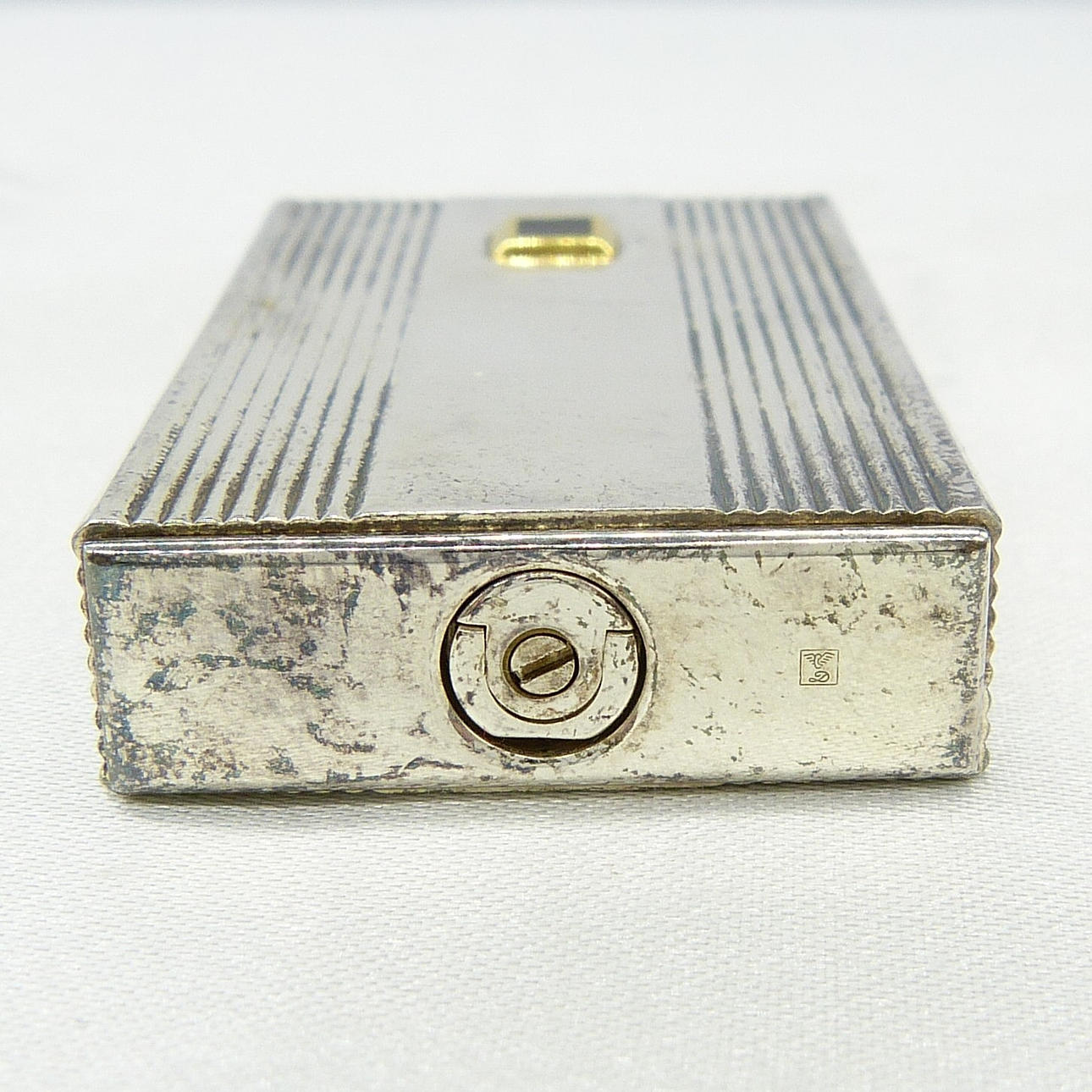 An original Dupont Paris matchbox or toothpick box in white metal, with gold tone embellishments..