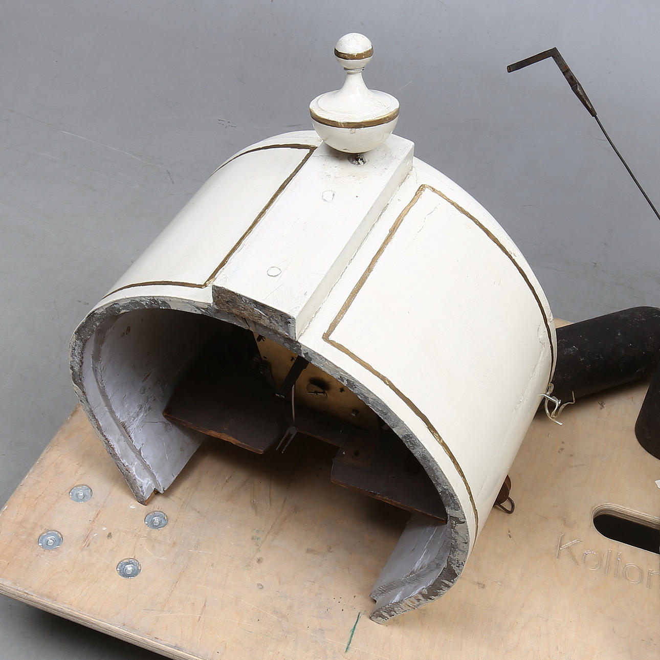 Age-related wear and tear. Later painting, loss of paint, rejection, later hinges. Glass for door mirror is missing.