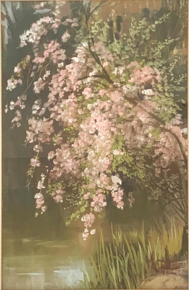 A framed watercolour entitled ' Weeping cherry' by Judy Hann, frame size 65 x 49.5cm.