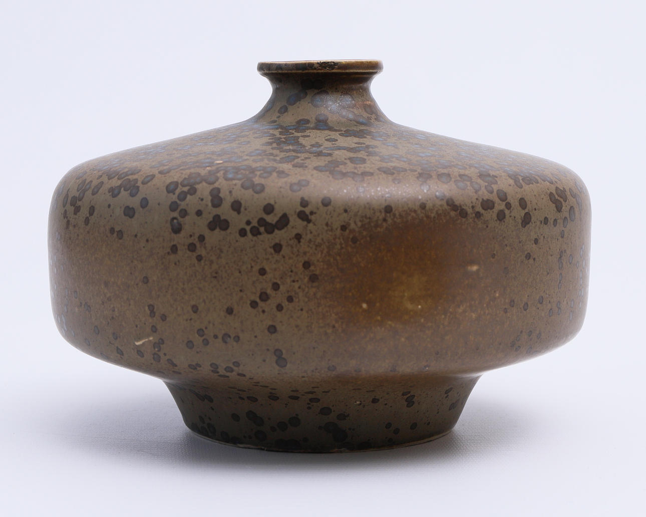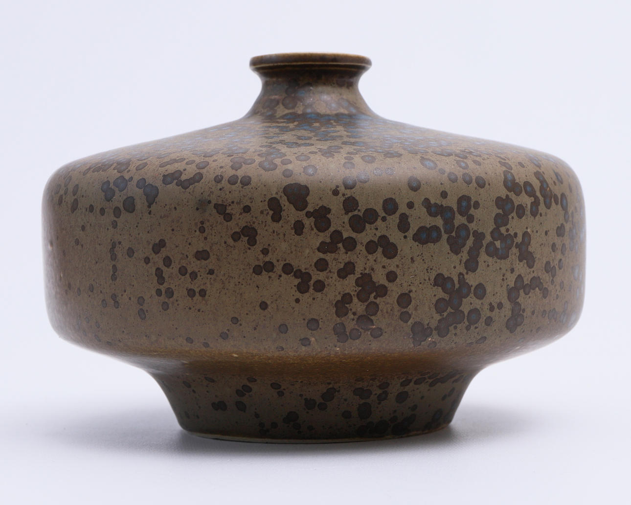 Vase. stoneware. crystal glaze. Matt multi-toned brown glaze with blue speckles. H. 15 cm, D. 23 cm. Marked on the bottom: workshop mark (embossed stamp/ Höhr-Grenzhausen) and brush mark.