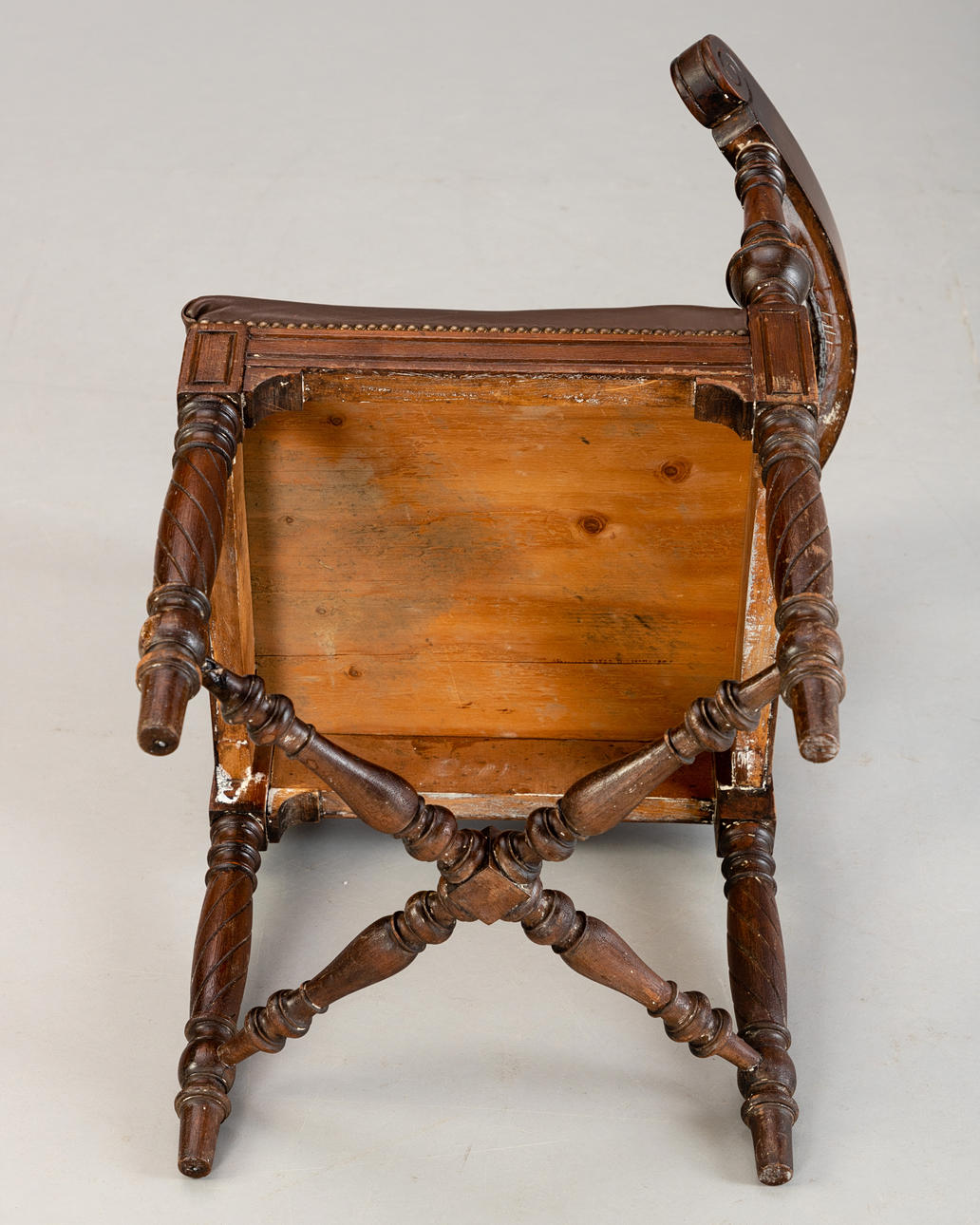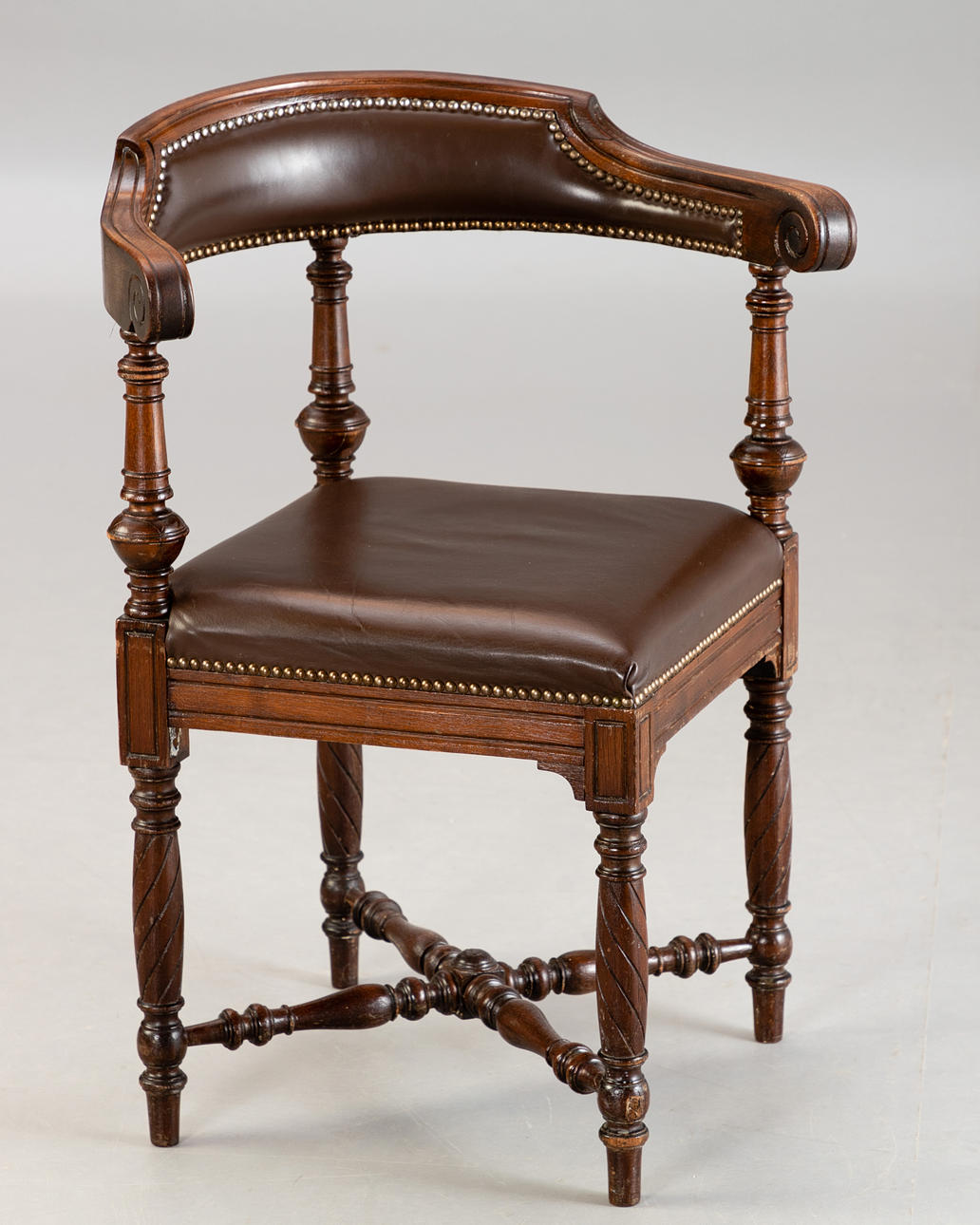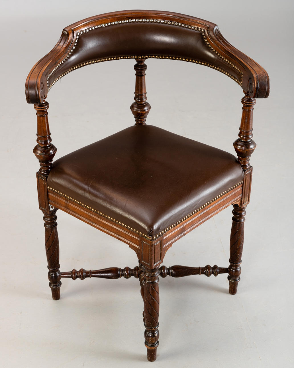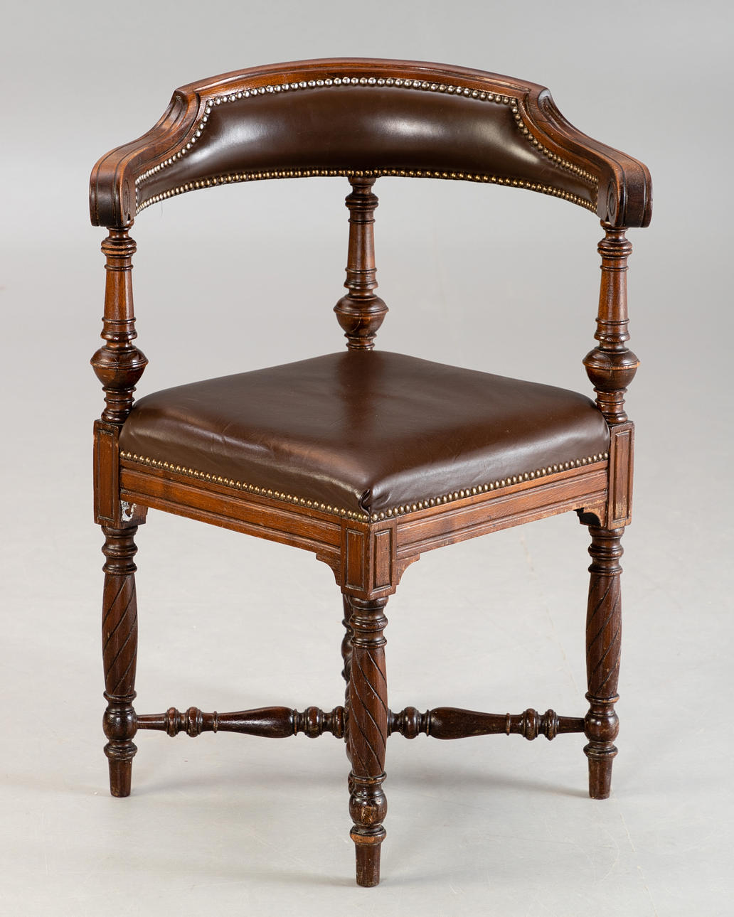Oak, turned and cut/brown leather. Turned cross braces between the articulated round legs. Square seat placed over a corner. The upholstered back rest on three balusted columns. HxShxWxD: approx. 85.5x49x65x62cm.
