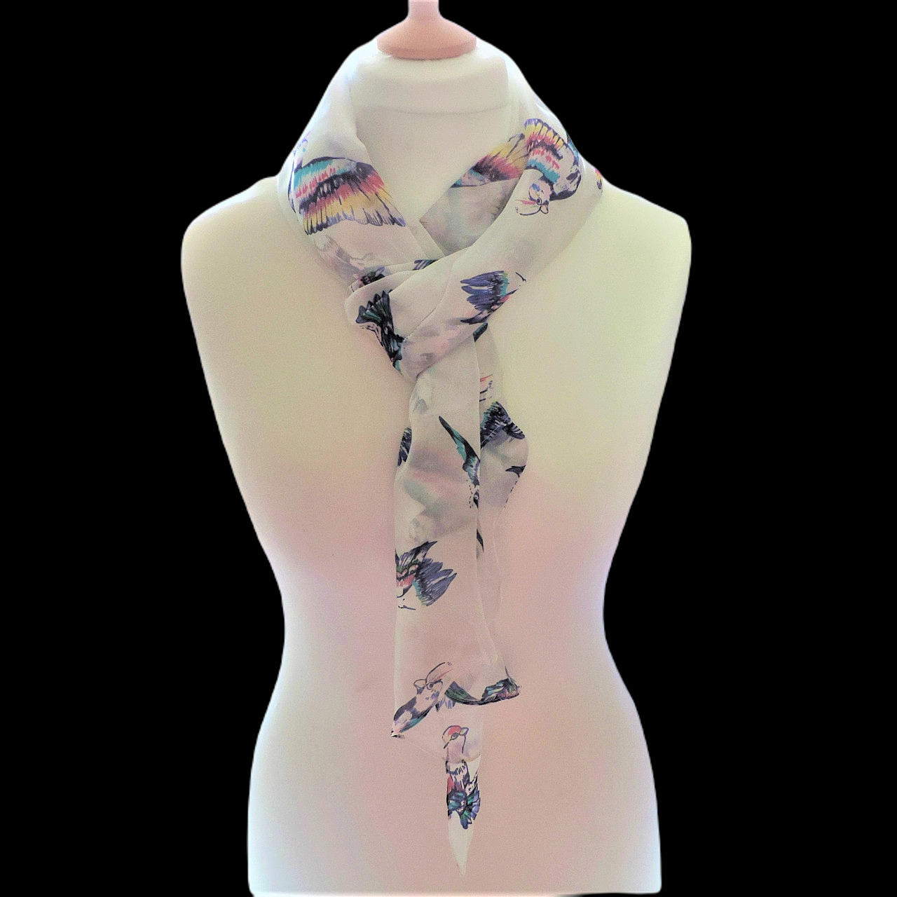 Tabitha Webb Humming Bird Silk Scarf 170cm Long. A lovely 100% silk scarf by Tabitha Webb with Humming Birds 170cm long and 40cm wide.