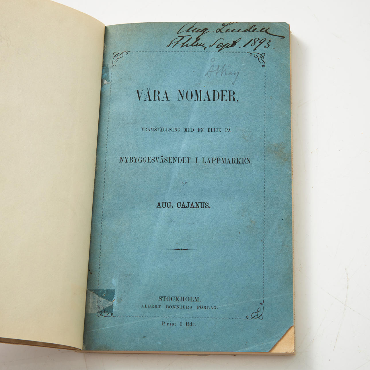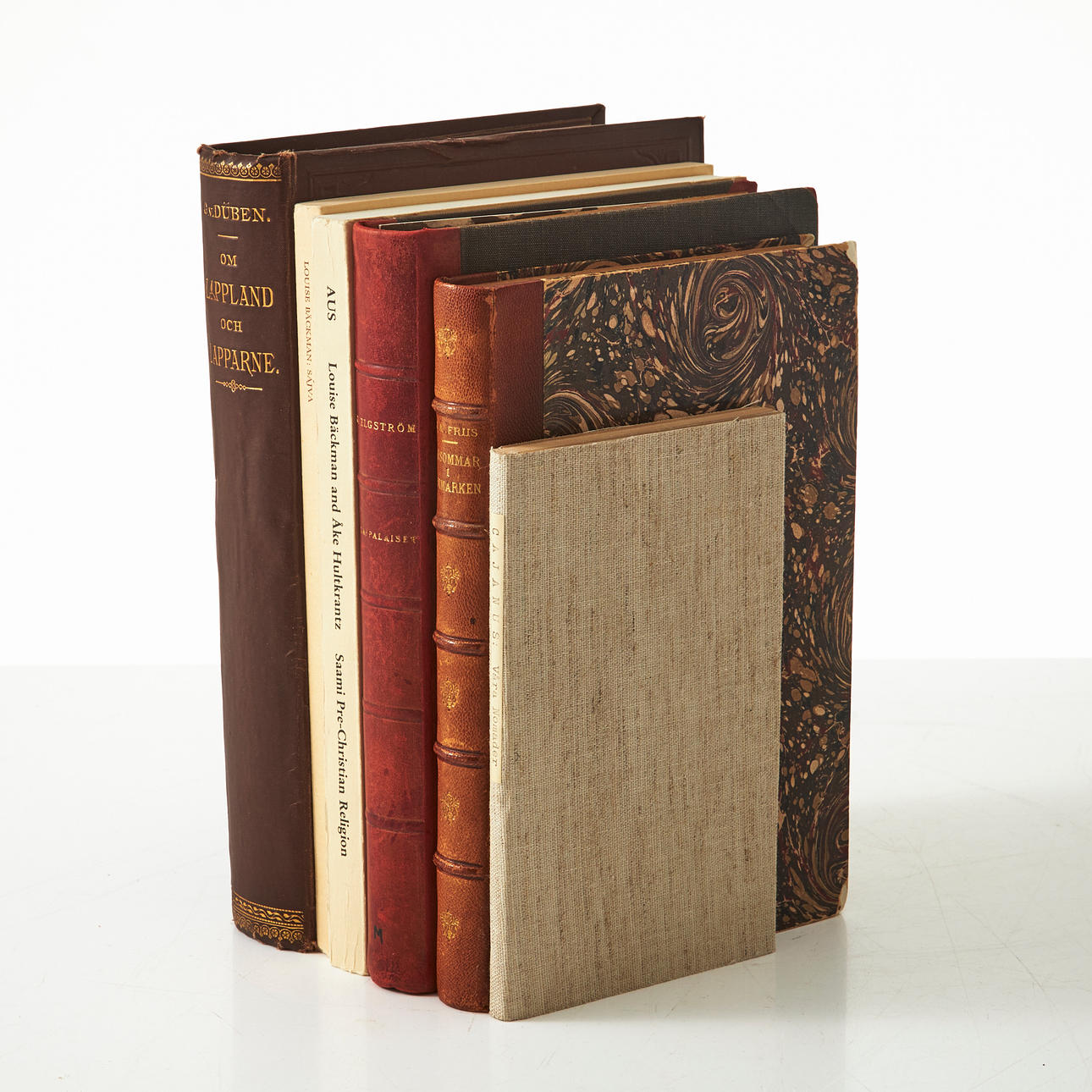 The party also includes: CAJANUS. Our nomads, presentation with a look at the new construction system in Lapland. Stockholm, 1870 (later linen band, bound front cover, some deletions); ELGSTRÖM. Lappalaiset. Travel in Lapland and Norway. Stockholm, 1919 (small spotted red half-French ribbon, Arne Lindgren's exlibris); FREE. A summer in Finnmark, Russian Lapland and North Karelia. Depictions of country and people. Christiania [Oslo], 1880 (slightly worn half-French band, signature on cover page); BÄCKMAN. Sájva. Performances about aid and protection in sacred mountains among the Sami. Ak. avh. Stockholm, 1975 (stapled, well-preserved copy); BÄCKMAN & HULTKRANTZ (eds.). Saami Pre-Christian Religion. Studies on the oldest traces of religion among the Saamis. Stockholm, 1985 (stapled, slightly worn).