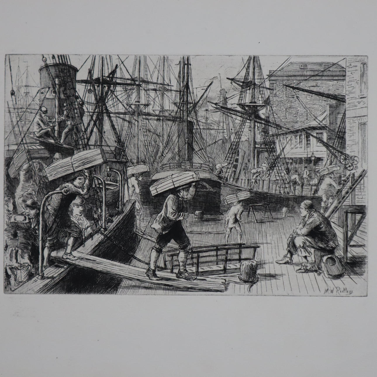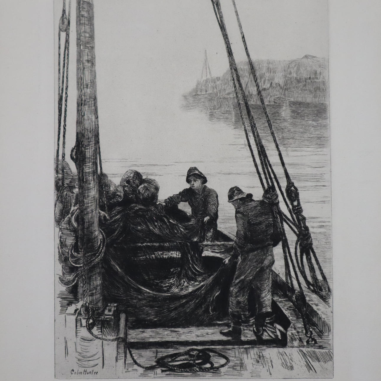 1x Matthew White Ridley (1837-1888), “London Bridge”, signed in the plate, plate dimensions approx. 15x22.5cm, sheet dimensions 26x36cm, 1x Colin Hunter (1841-1904), “Shaking the Nets”, signed in the plate, plate dimensions approx. 28x20cm, sheet dimensions 36x26cm, 1x unknown port scene with a three-master, unsigned, inscribed in lead on the back” The Etcher”, 1879: G.E.Hodgson, R.A. A Three-Decker at Her Last?“, plate dimensions approx. 15x20cm, sheet dimensions 27.5x37.5cm.