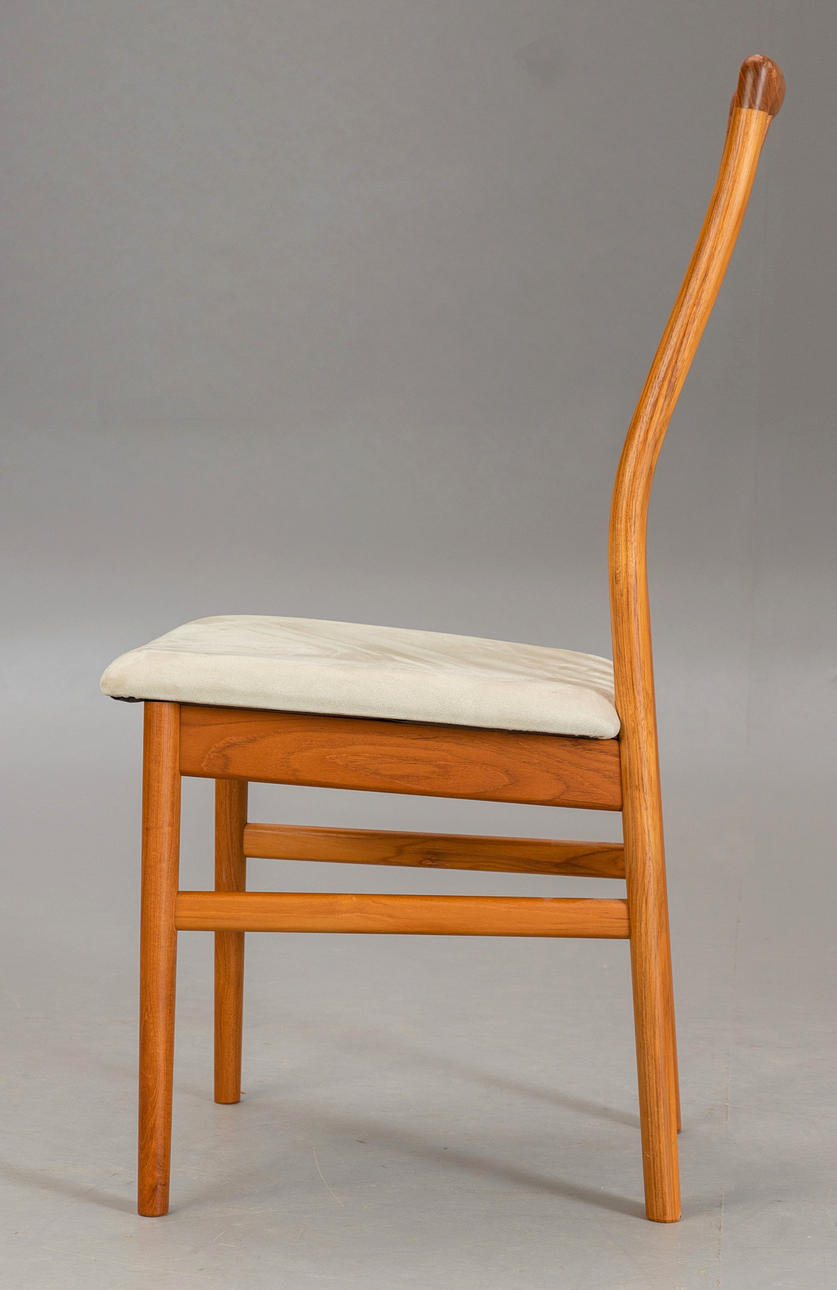 Teak dining chair by Schou Andersen, Danish design. High, sprout backrest, lightly upholstered seat and covered with light-colored Alcantara.