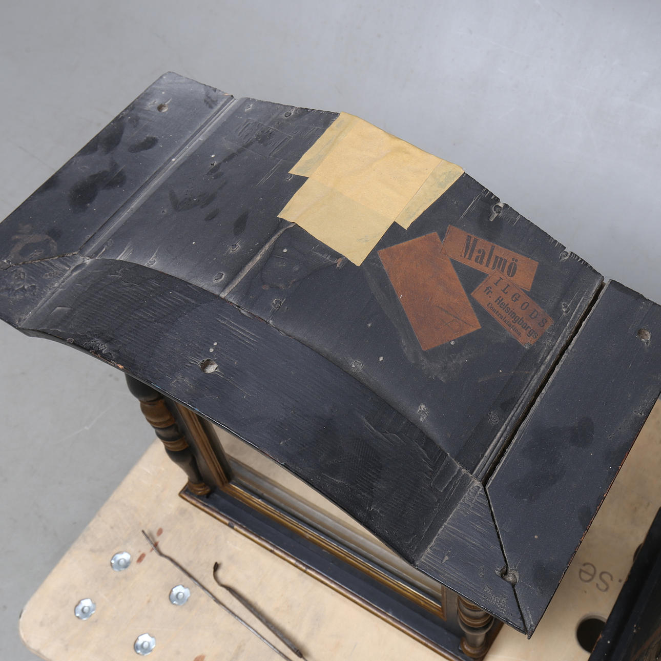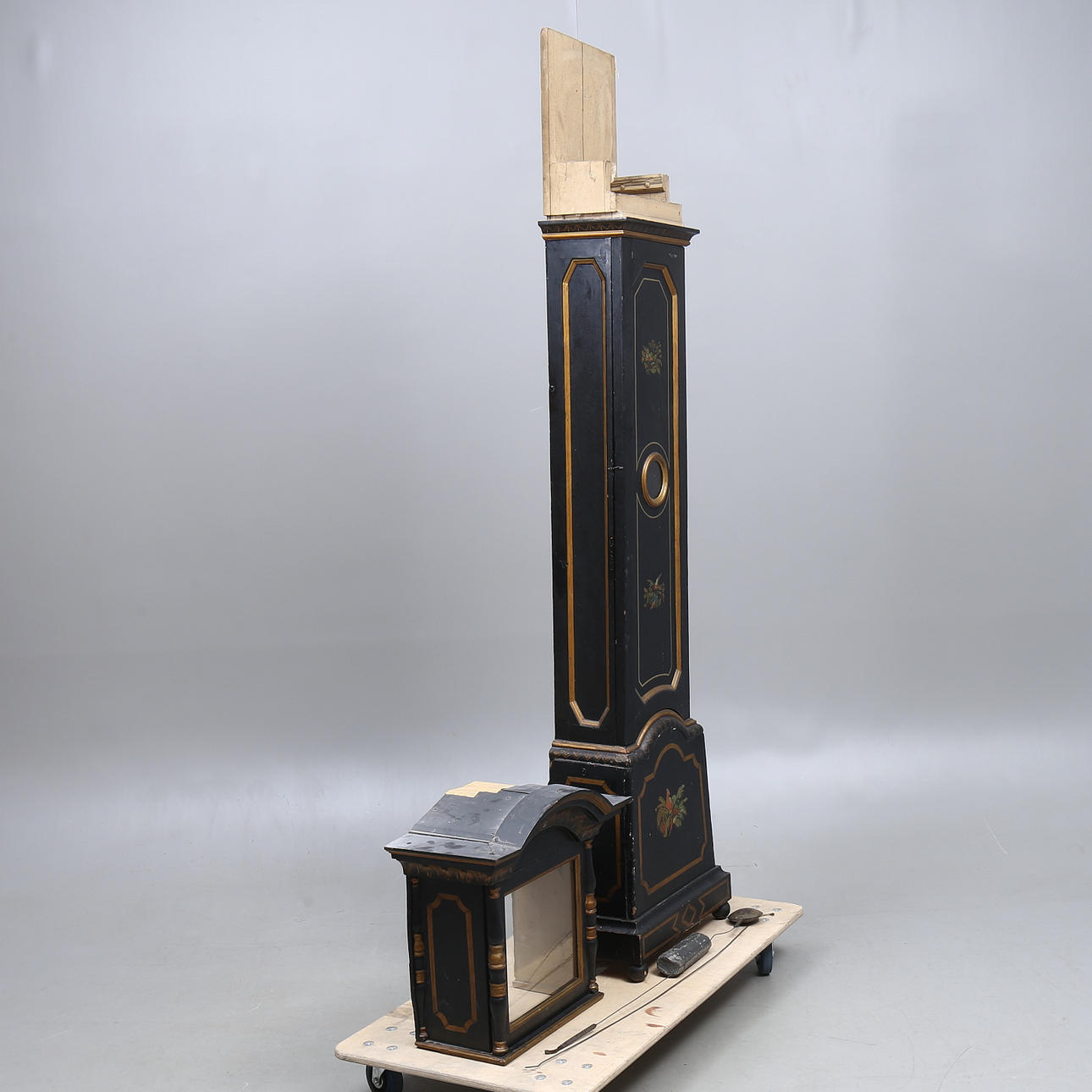 Wear, dry cracks, later painting with paint loss. Solder and pendulum are available. Not reviewed. Not function tested.