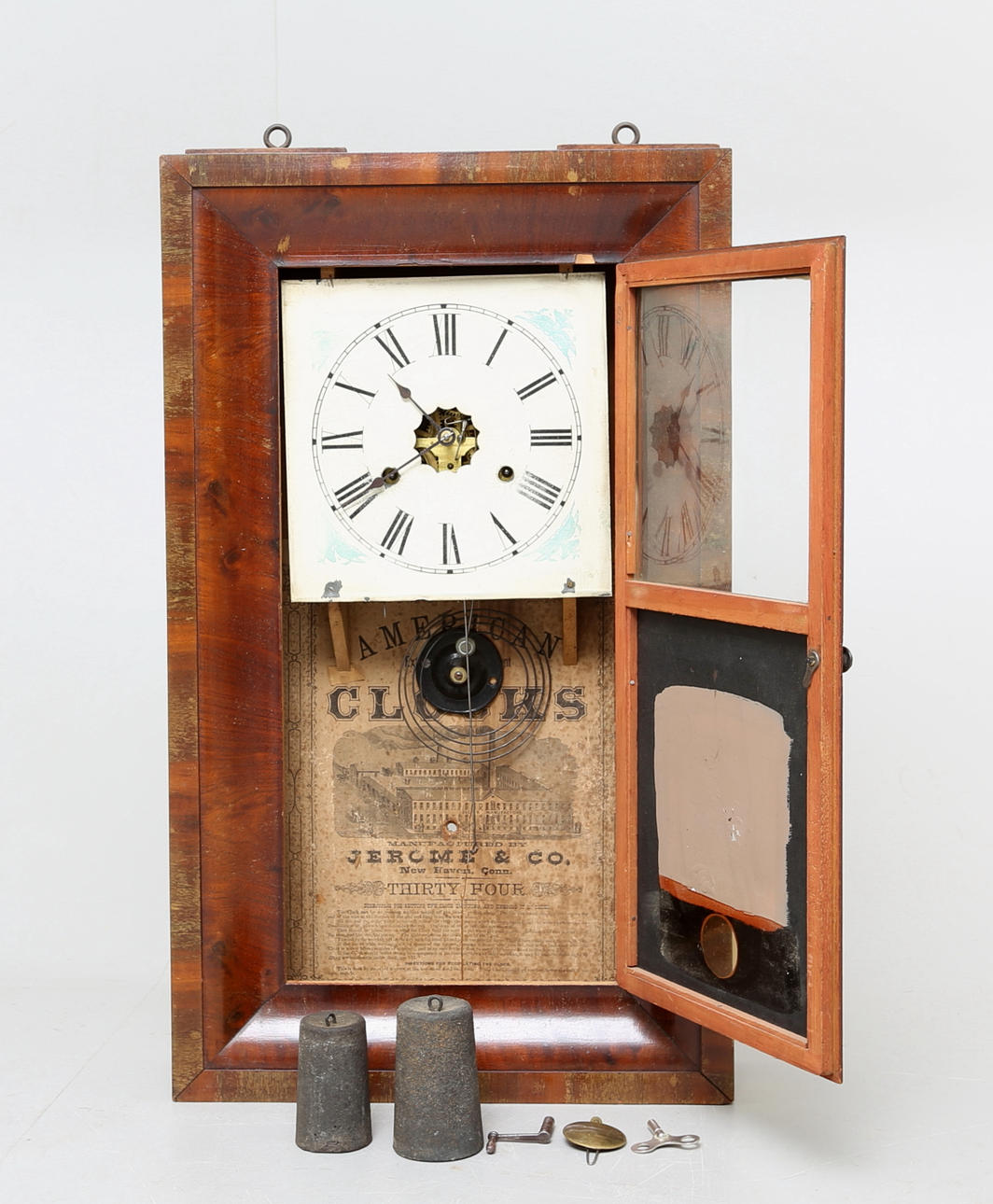 Drawer model with painted glass door, label on the inside: "American Clocks, Manufactured by Jerome & Co". Pendulum clock with two weights. H: 65.5 cm.