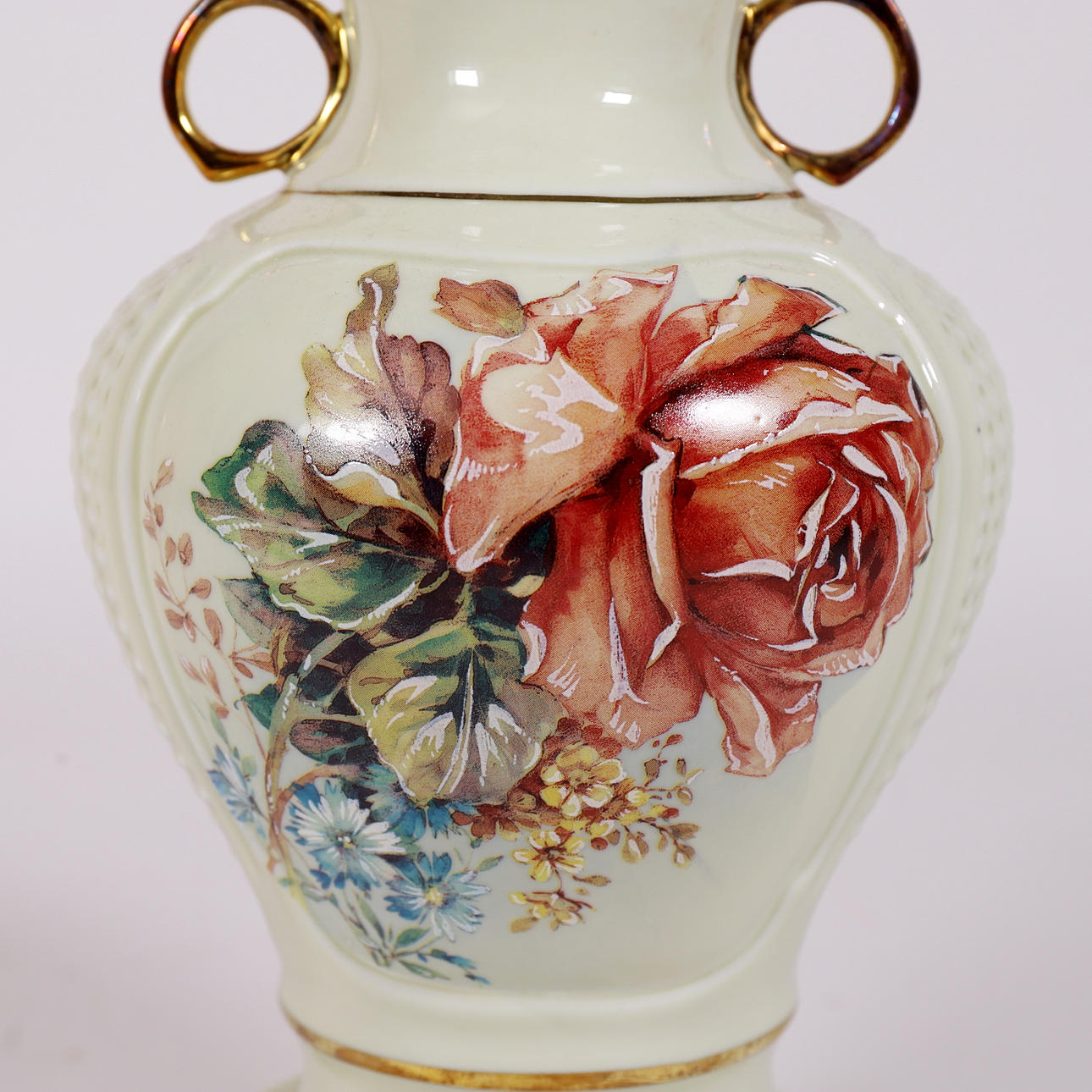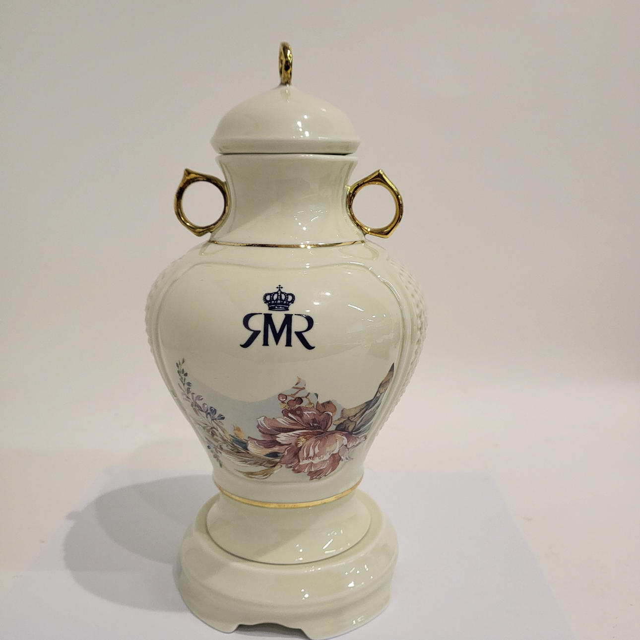 with hand-painted decoration of flowers and partly gilt. With initials. On porcelain base Total height: 30x16x16 cm.