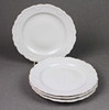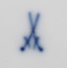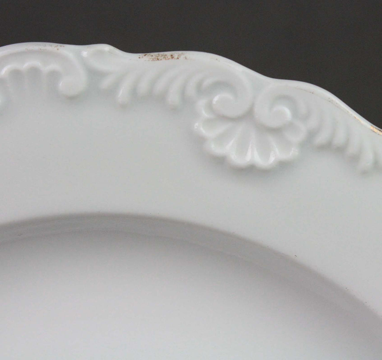 Porcelain with underglaze blue sword mark from the Meissen Porcelain Manufactory with pommel 19. Century, with 2 grinding strokes, pressed u. Painter no., set of 4 plates with palmettes in relief on the edge, gilding mostly worn, Ø approx. 22 cm.