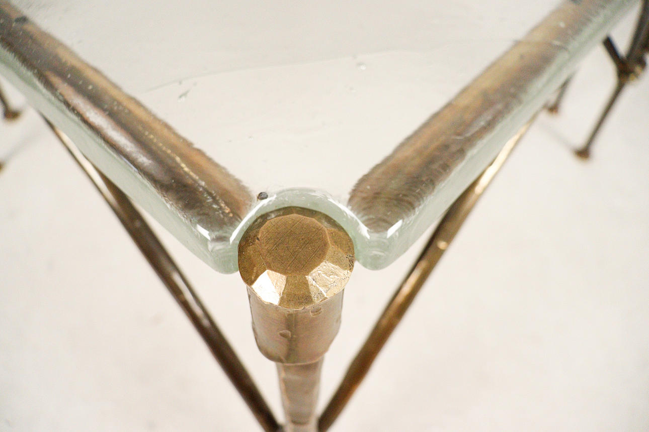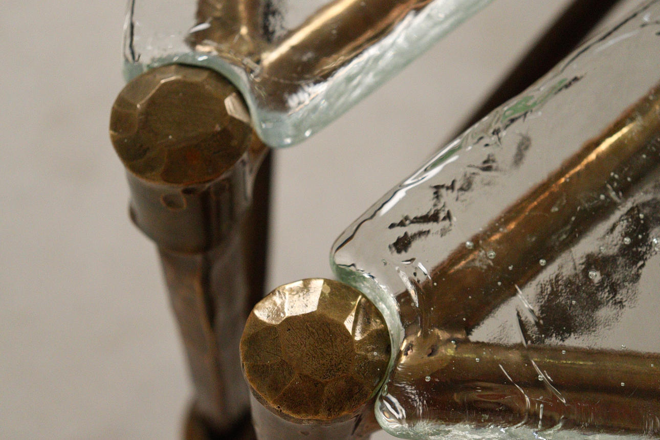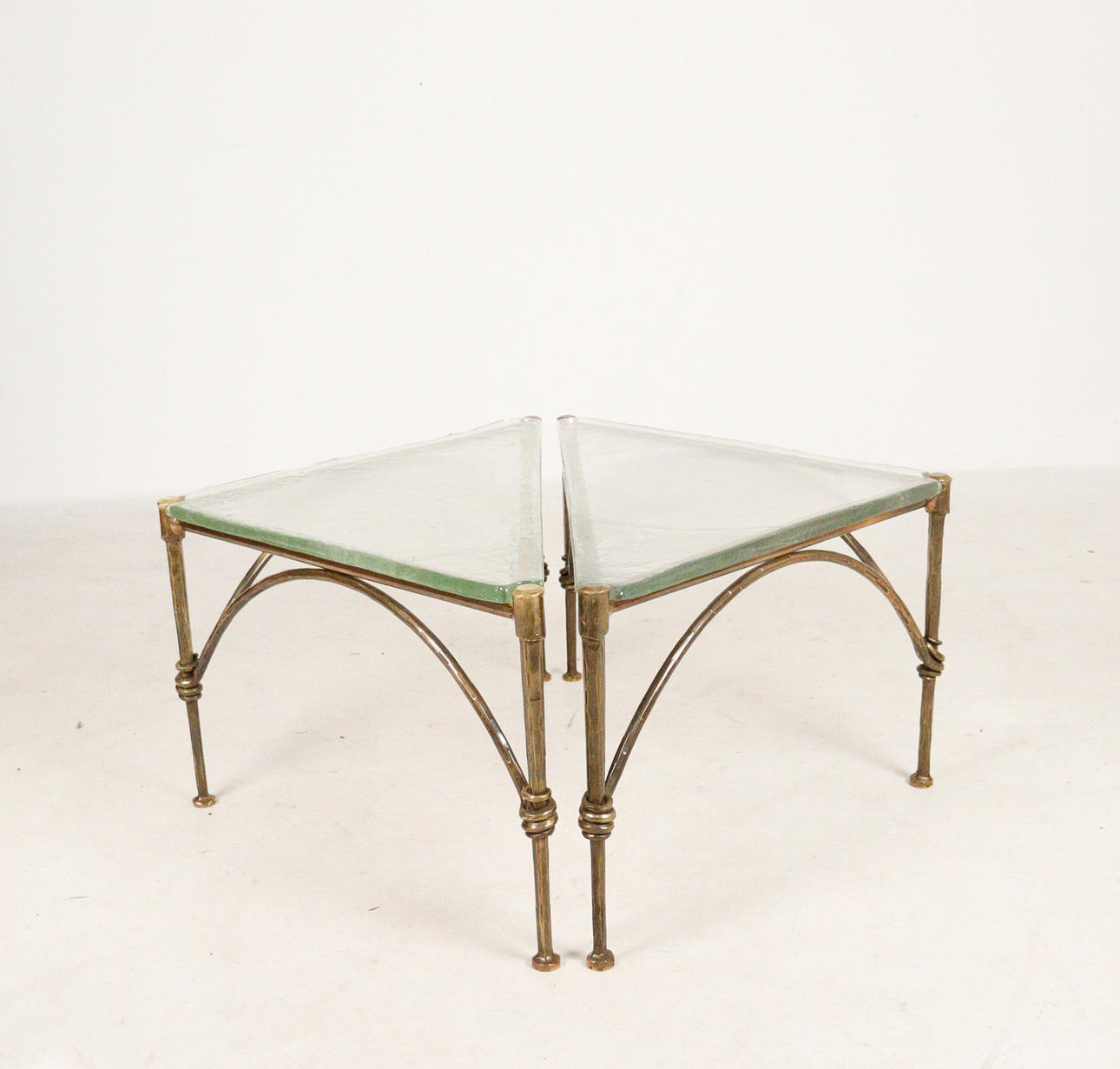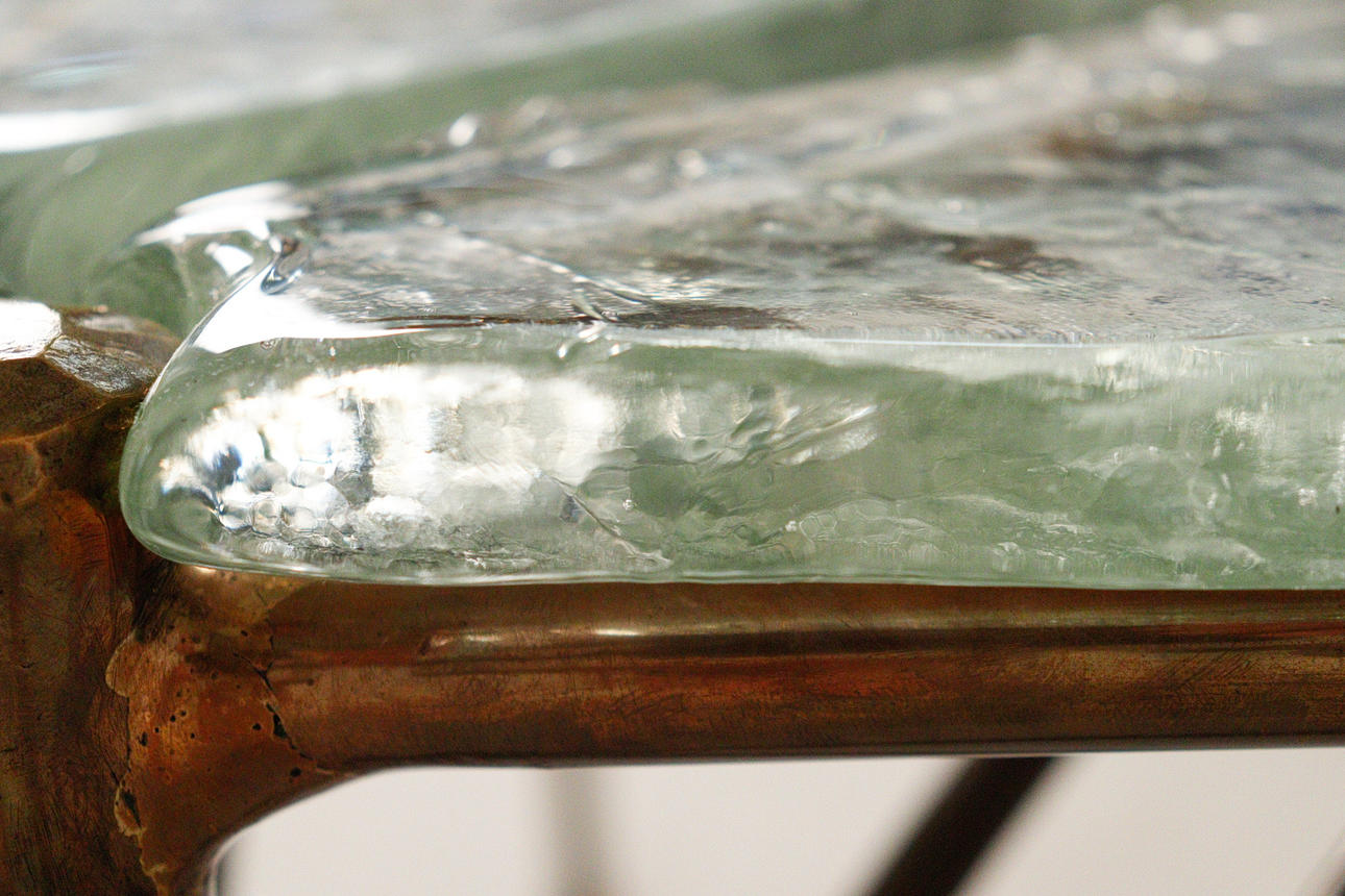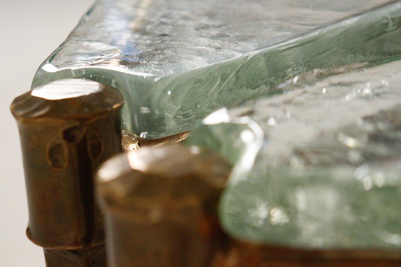 Lothar Klute, Brutalist side tables from the 1960s, solid construction made of hand-forged bronze with loose cast lead crystal plates, dimensions approx.: H. 48 cm, W: 80 x 80 cm.