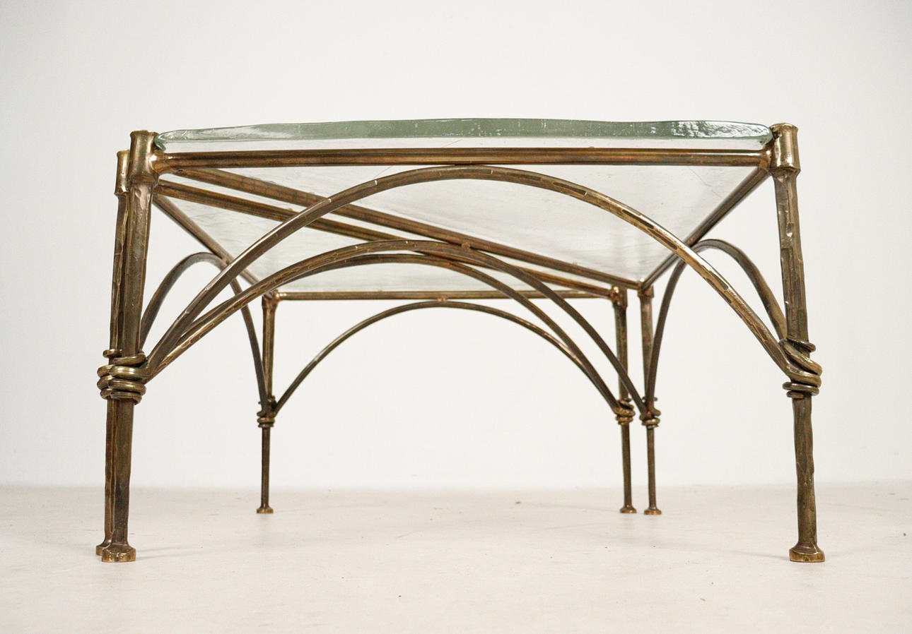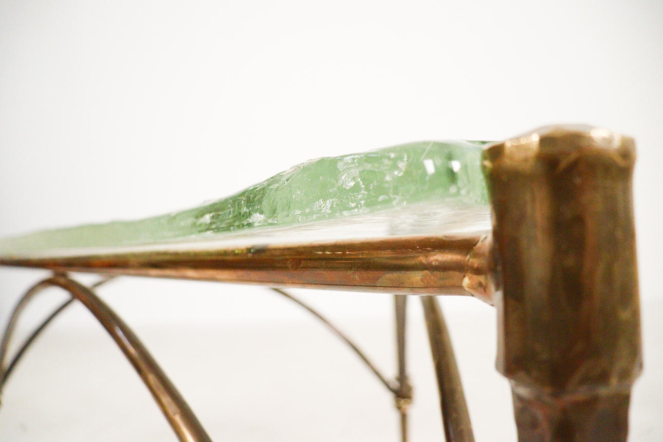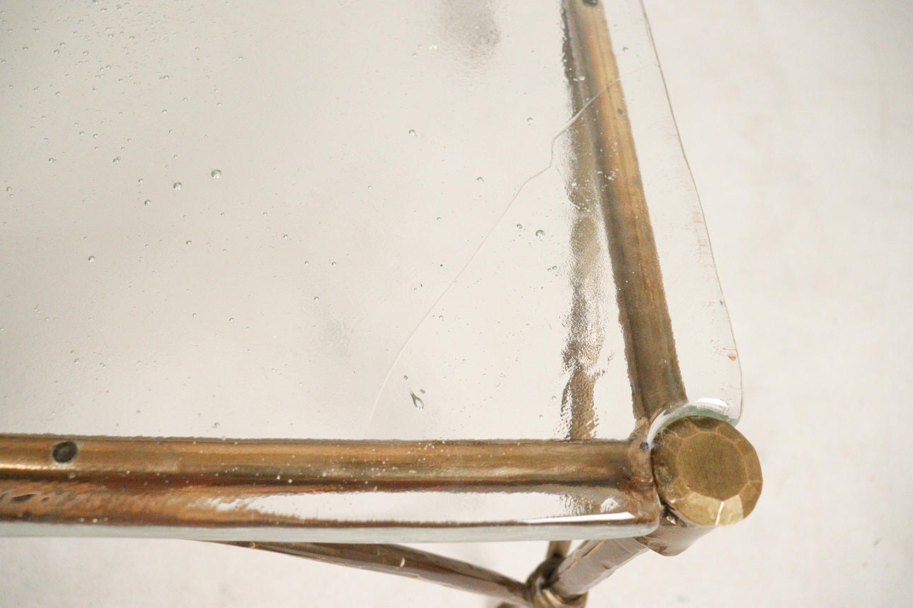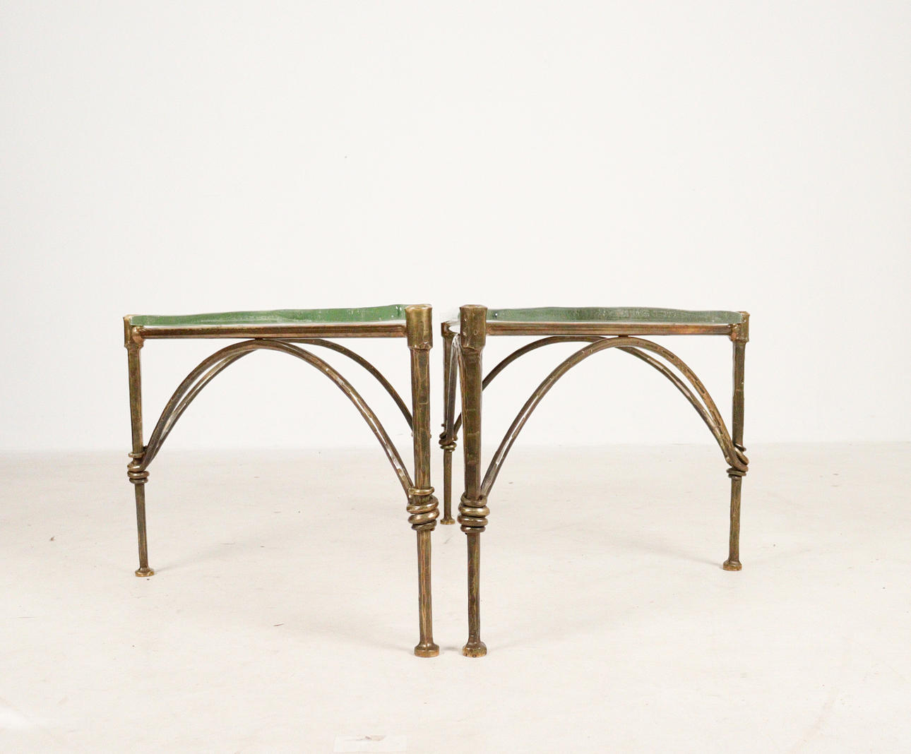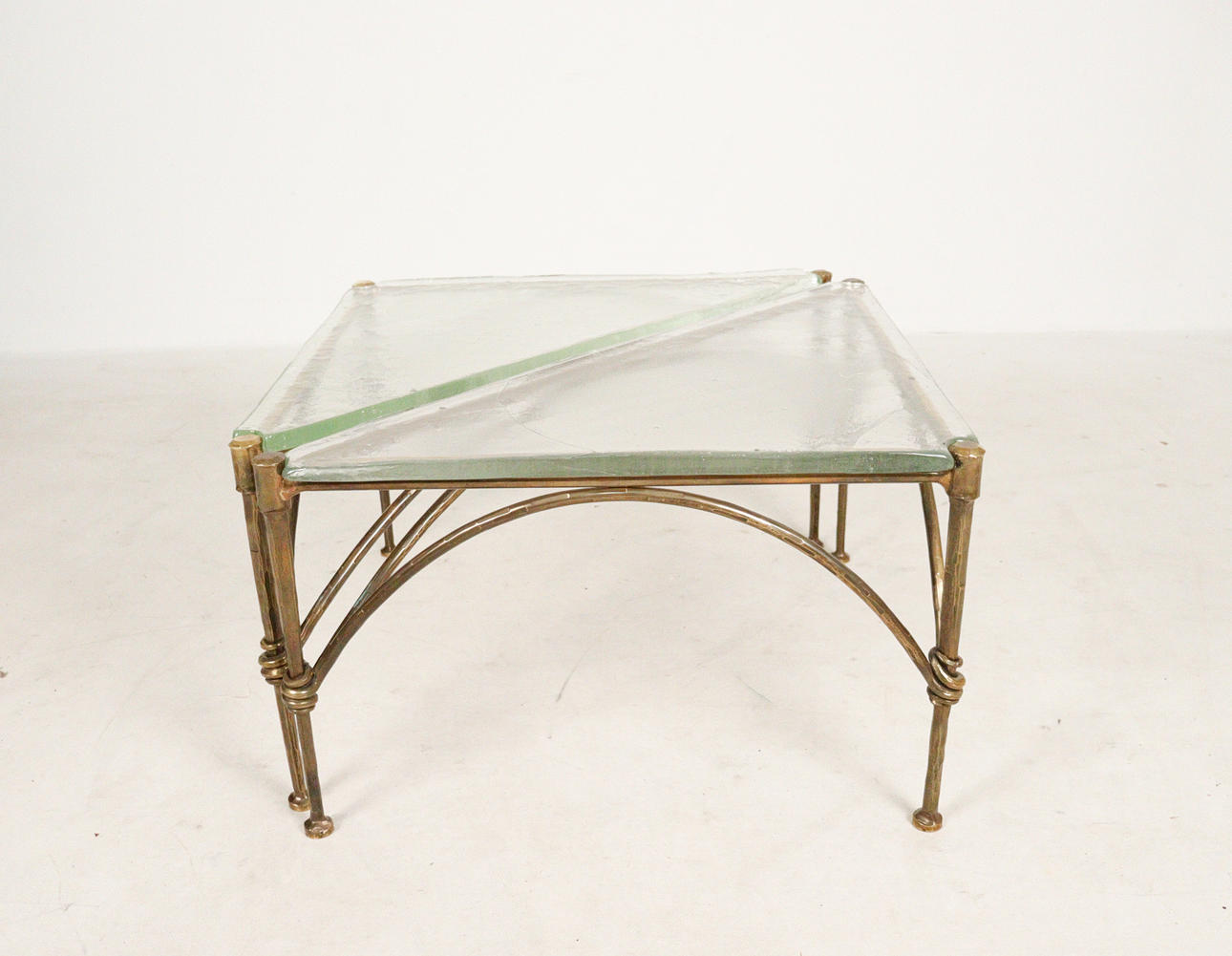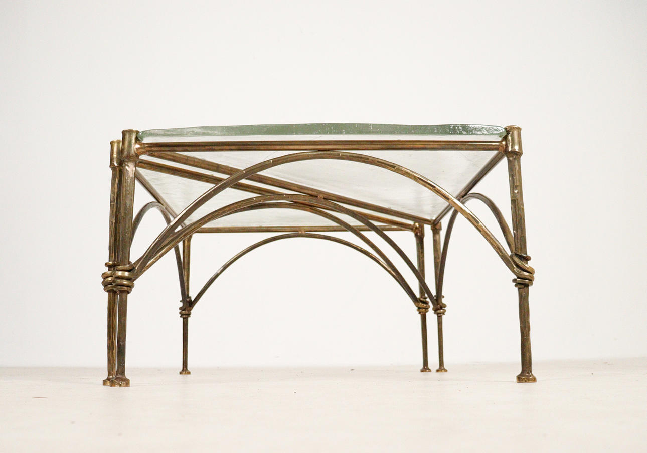 Lothar Klute, Brutalist side tables from the 1960s, solid construction made of hand-forged bronze with loose cast lead crystal plates, dimensions approx.: H. 48 cm, W: 80 x 80 cm.