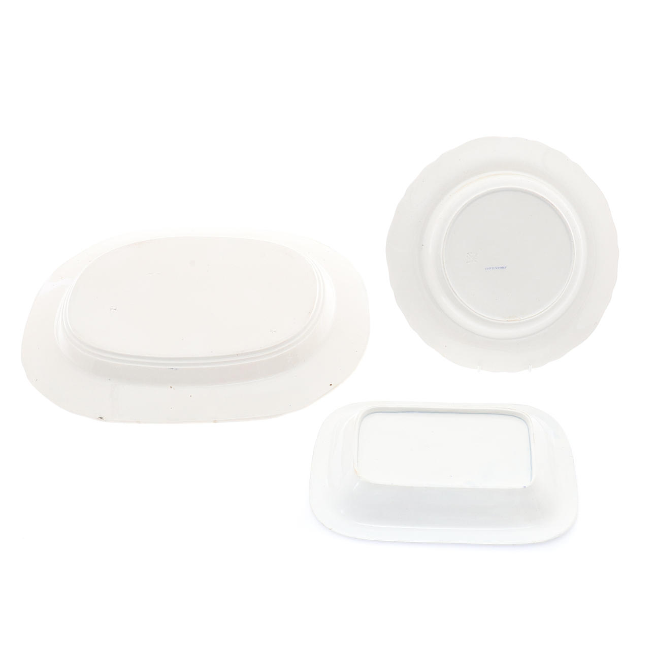 27cm x 19.5cm, impressed marks, an English creamware blue transfer printed meat plate, 40.5cm x 32cm, impressed 'G' twice, and a Davenport blue and white transfer printed soup plate, 26.5cm diameter, printed and impressed marks (3)