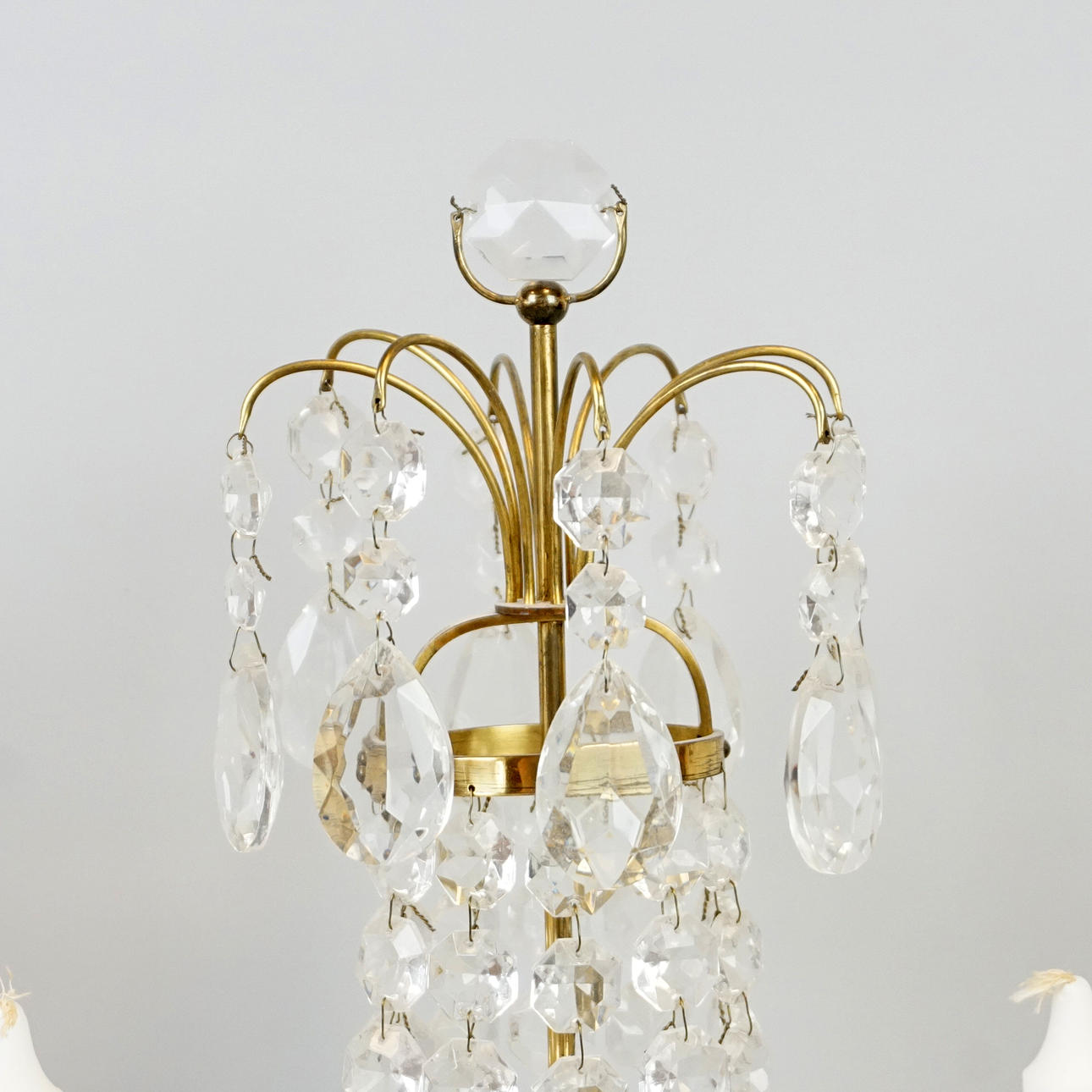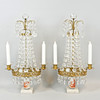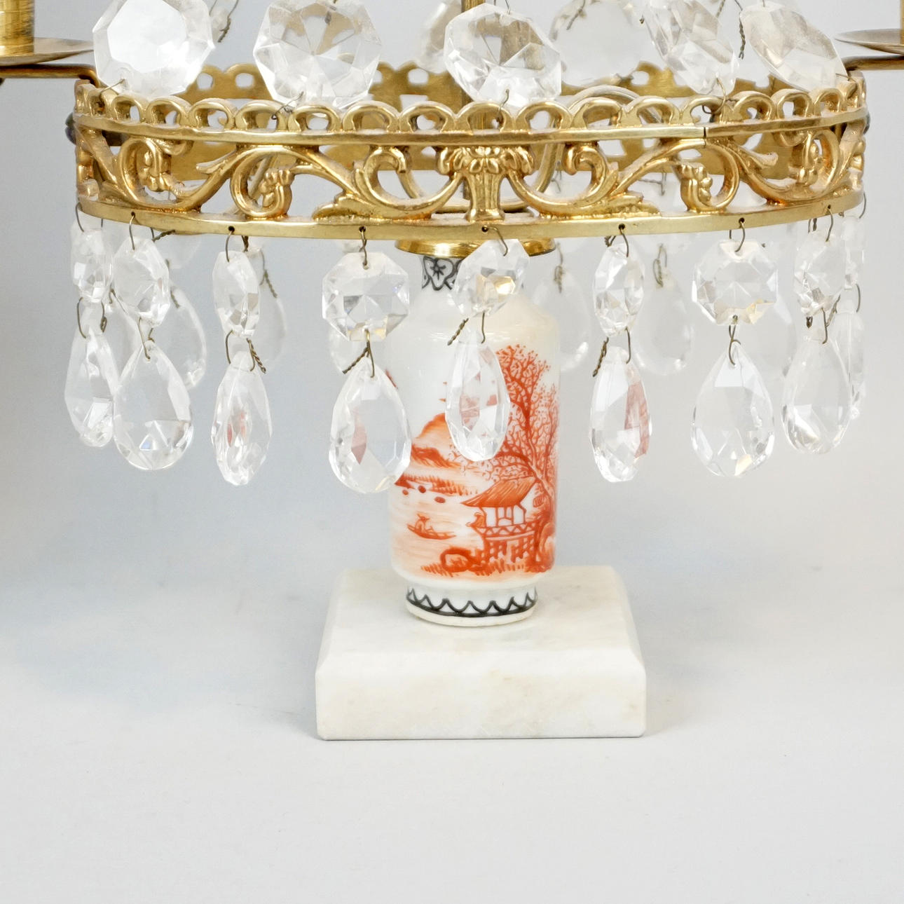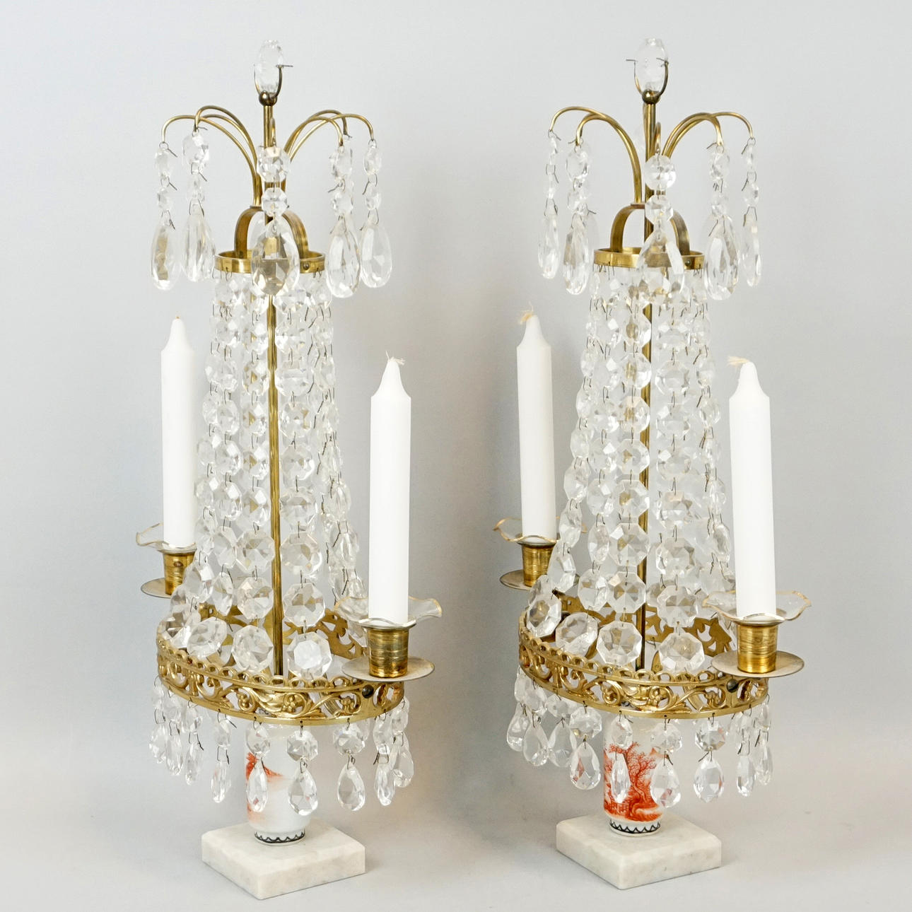 A pair of sconces, hung with prisms, part of porcelain frame with decoration of landscape, marble plinth. 2 candle holders each. Height 44 cm, width 24 cm 4 light cuffs in glass included.