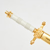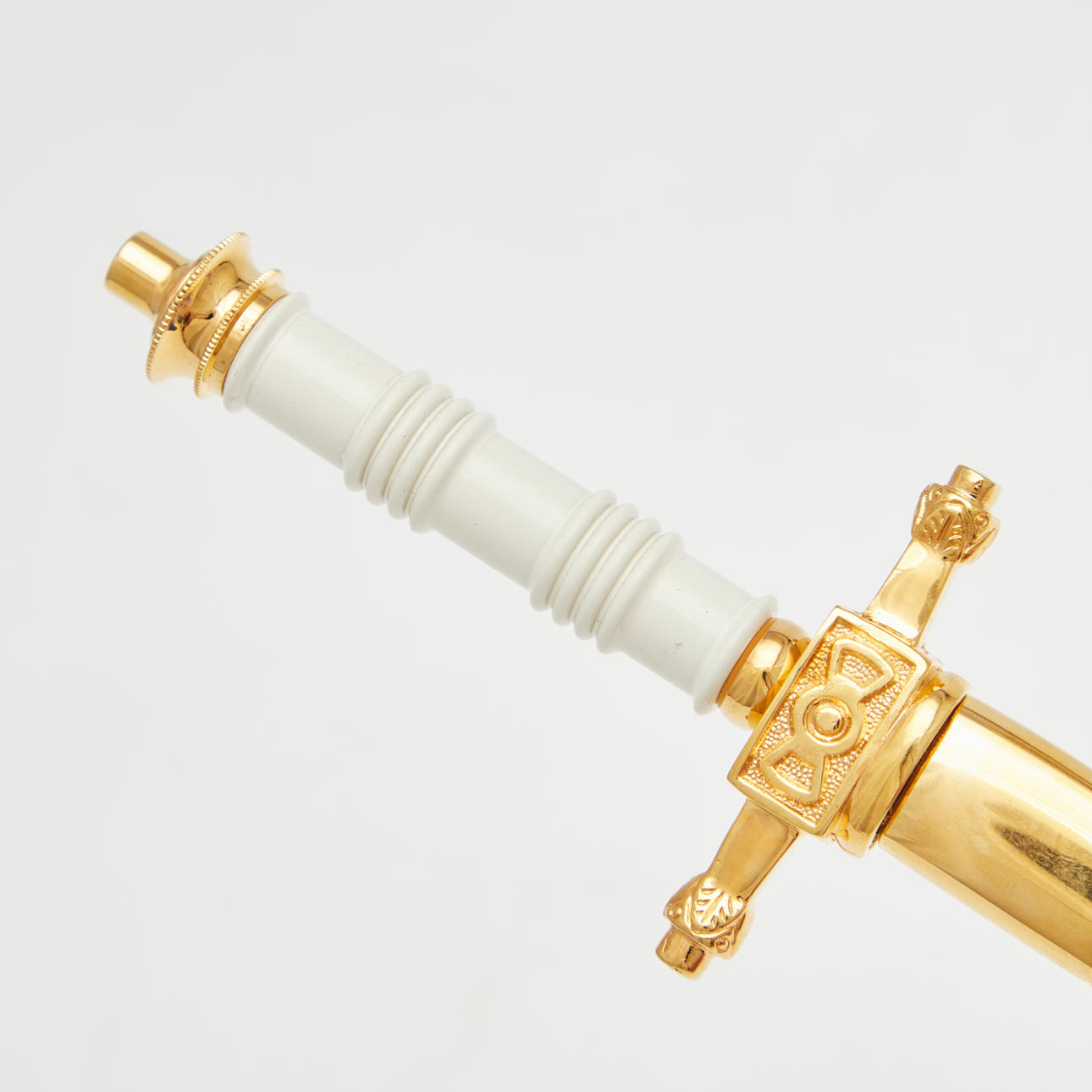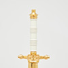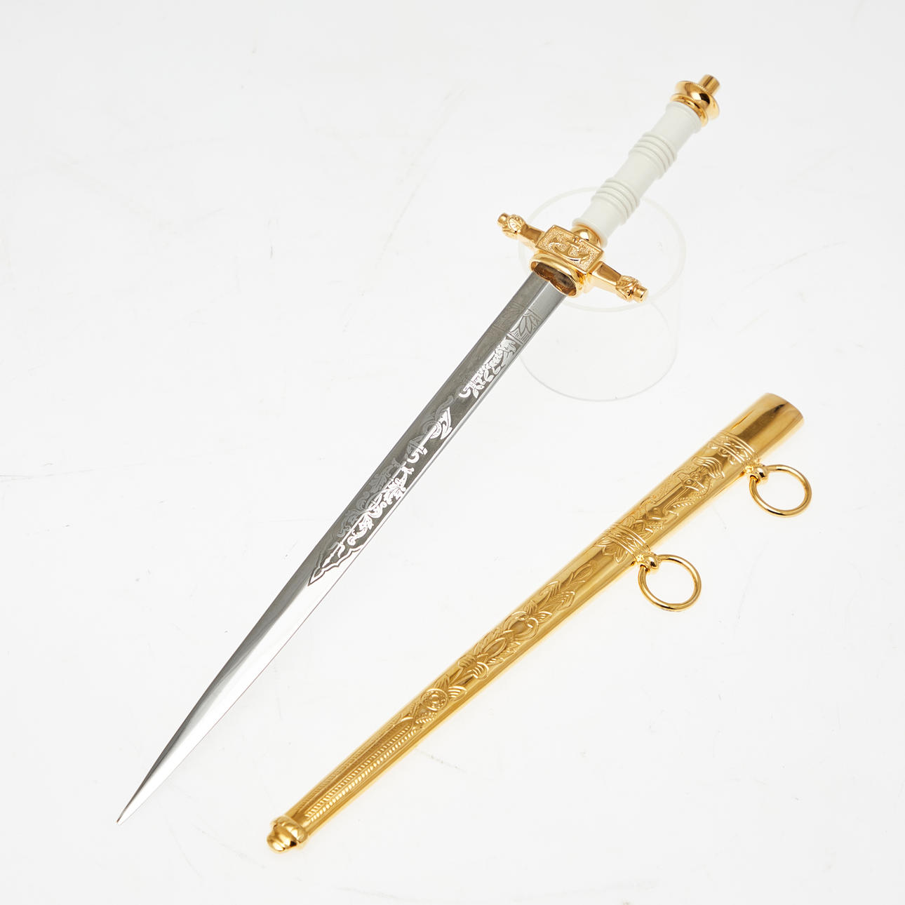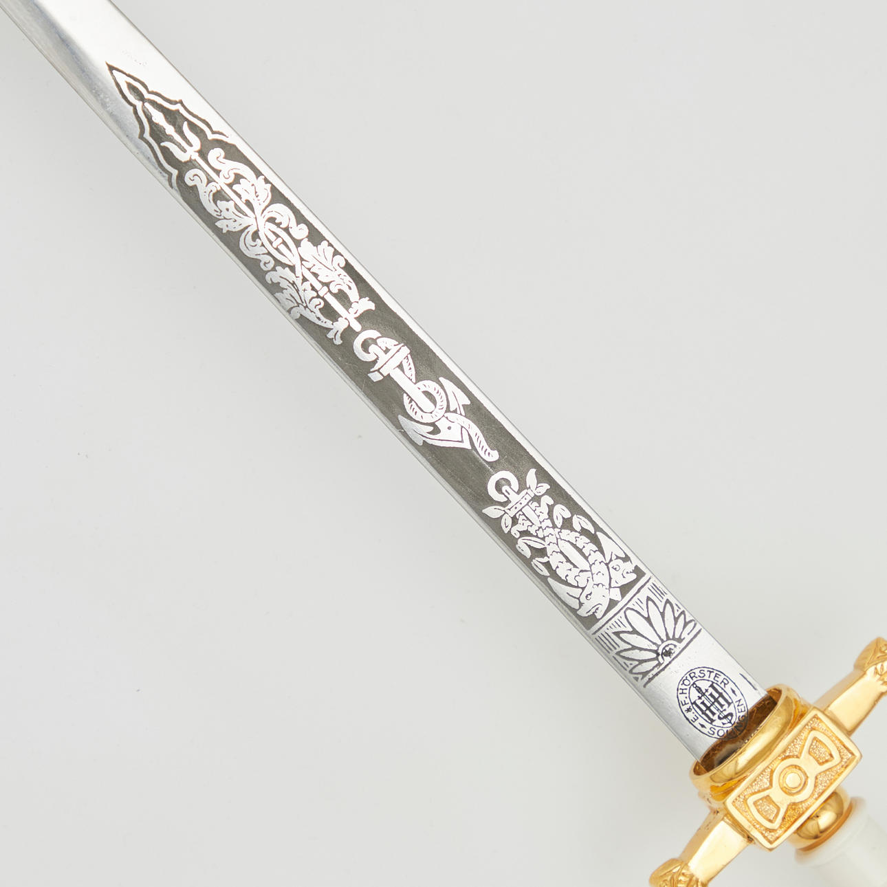 E & F. Hörster Solingen, Dutch Navy dagger, 20th century. Dagger with a blade etched on both sides, profiled handle made of white plastic, ornamentally decorated scabbard made of gilded metal with a hanger made of blackened leather, below the crossguard with manufacturer's stamp, L.37cm, blade width: 16mm.