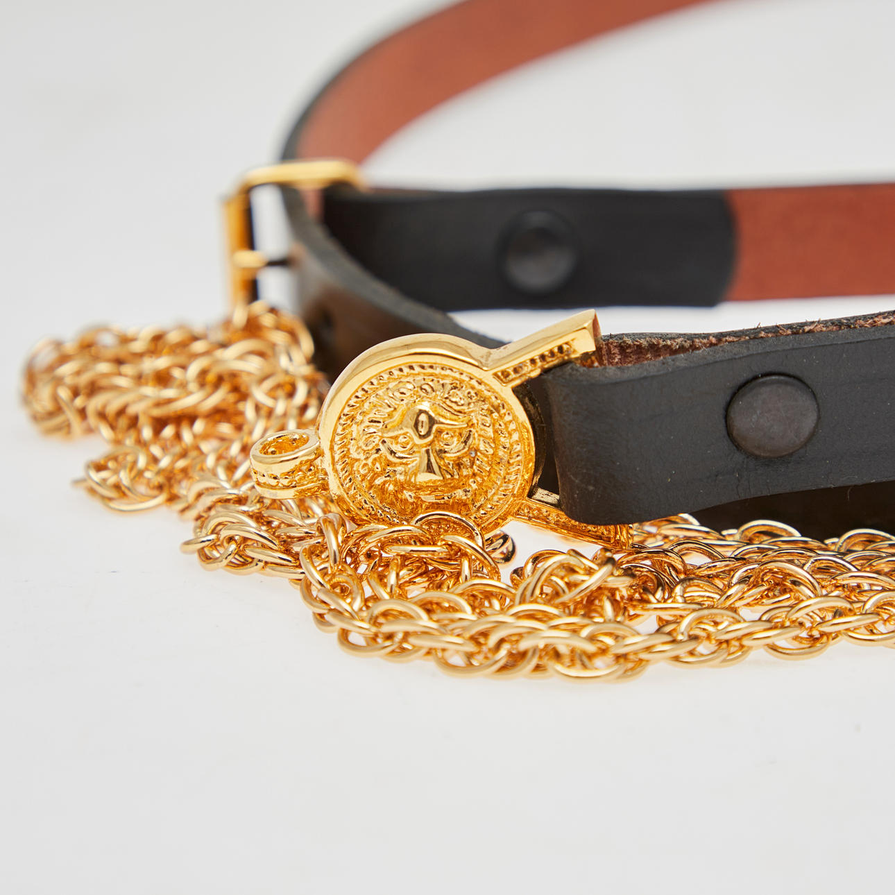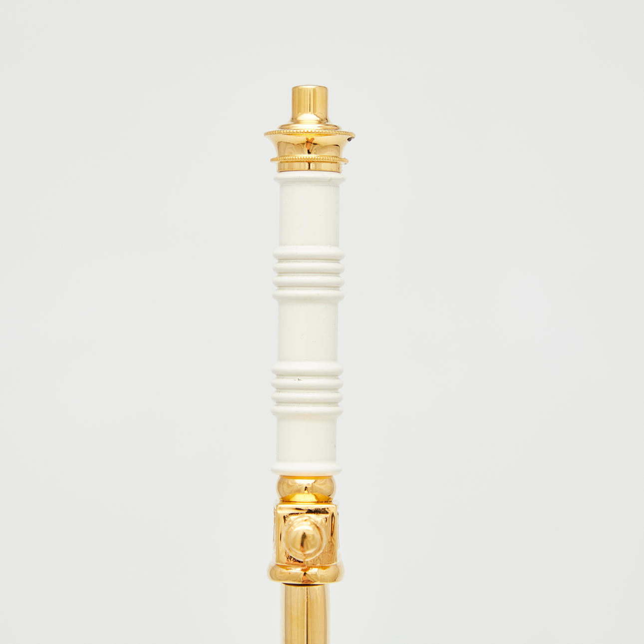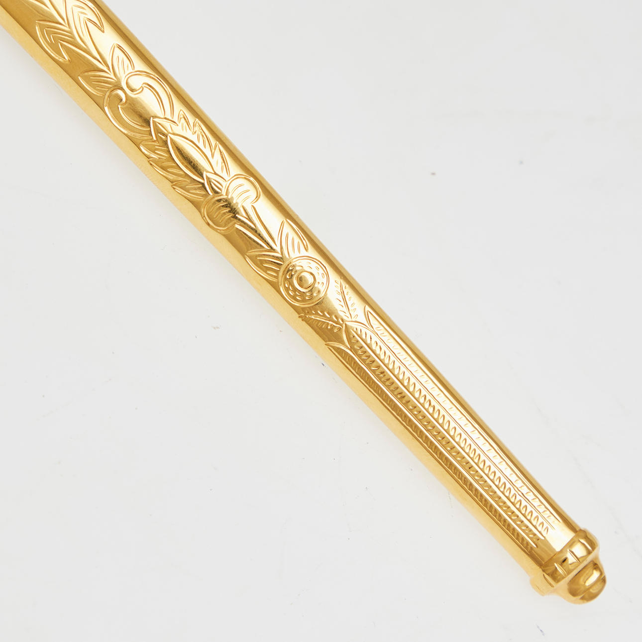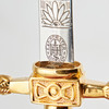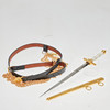 E & F. Hörster Solingen, Dutch Navy dagger, 20th century. Dagger with a blade etched on both sides, profiled handle made of white plastic, ornamentally decorated scabbard made of gilded metal with a hanger made of blackened leather, below the crossguard with manufacturer's stamp, L.37cm, blade width: 16mm.