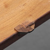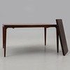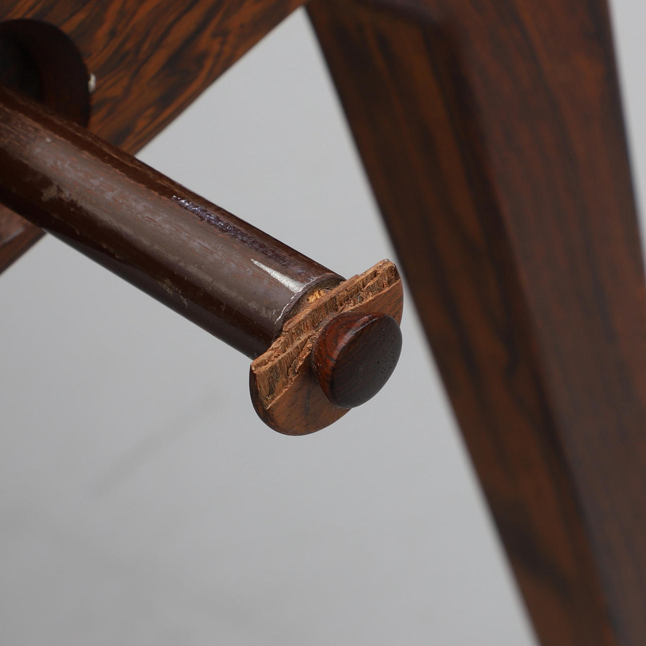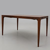 Rosewood. Rectangular disc, straight legs. Two extension leaves of 49 cm. Length 140, width 90, height 74 cm.