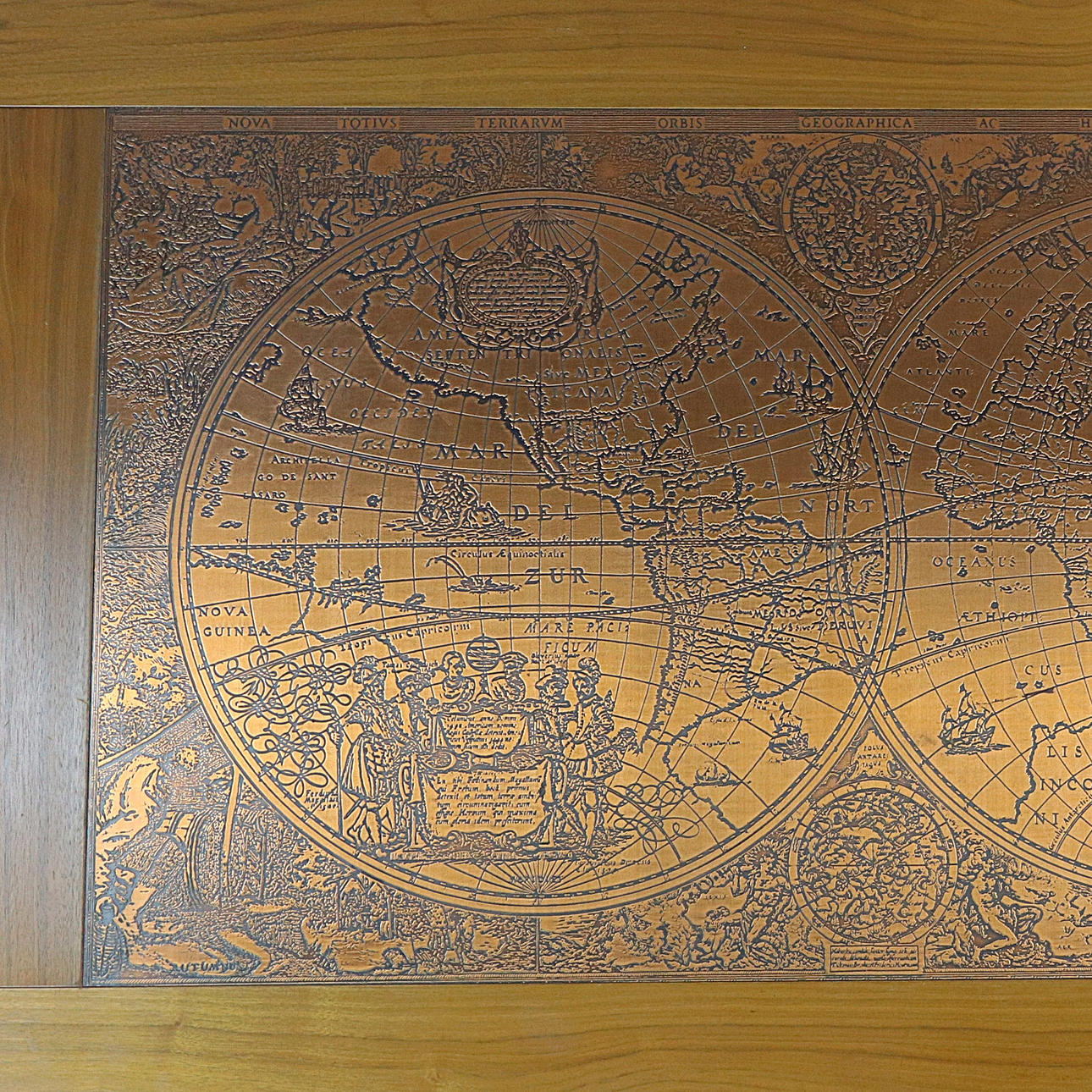 2348100. Teak coffee table, embossed copper plate with world map, 1970-80s.