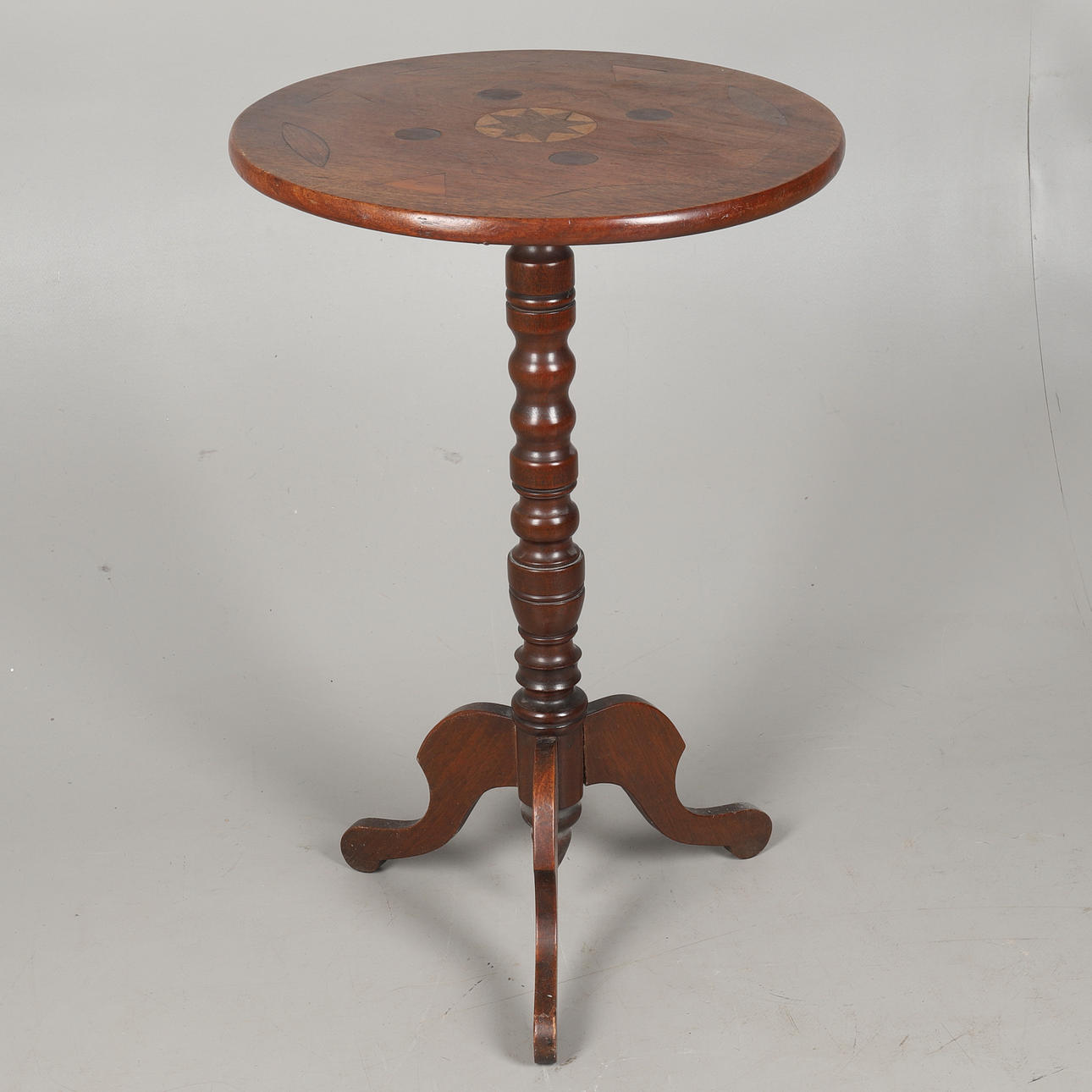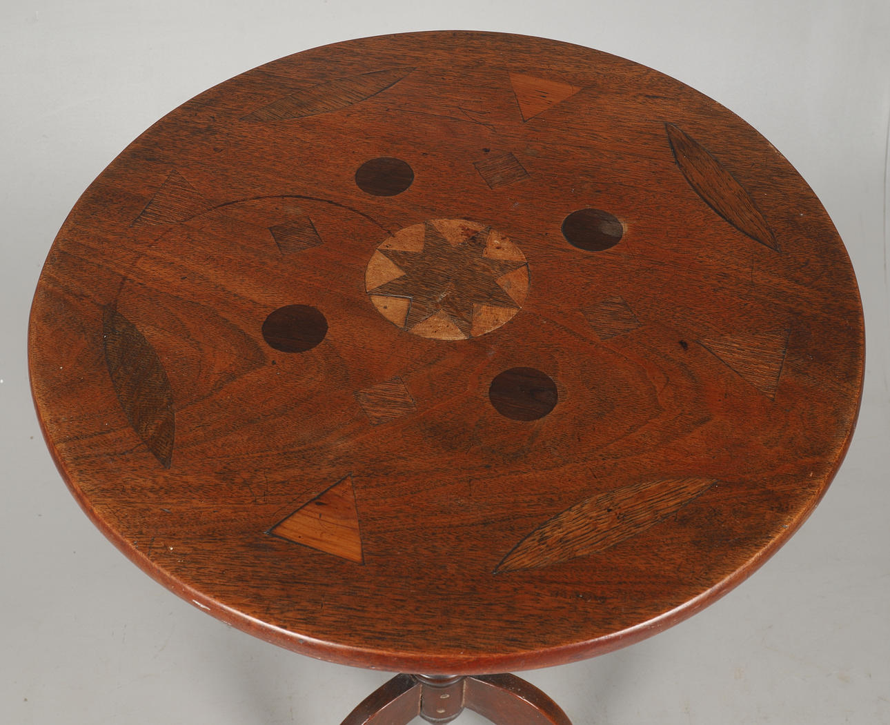 A Nineteenth century inlaid top tripod table, 75 cm height x 50 cm diameter.