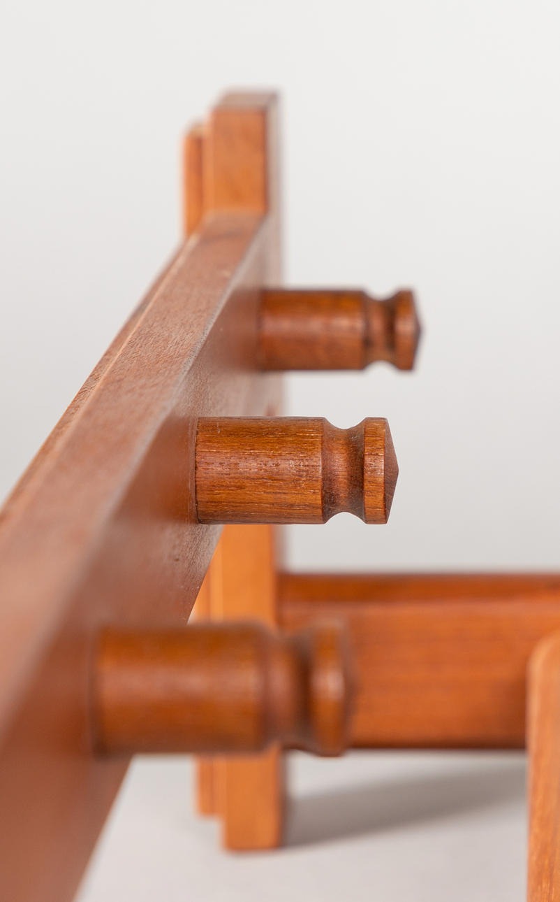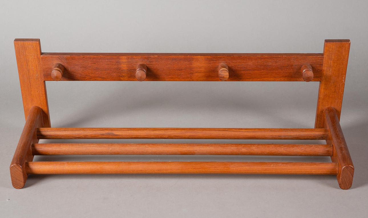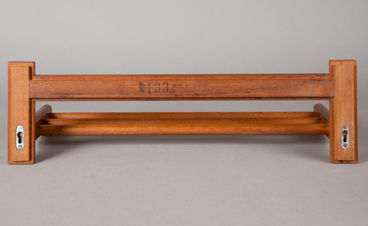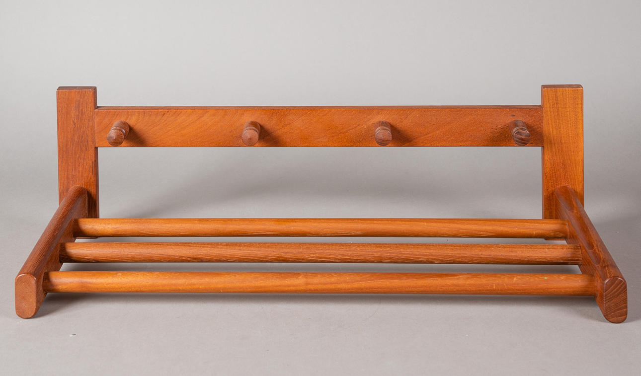 2 coat racks designed by Aksel Kjersgaard for Odder. Denmark, 1960s. Teak wall wardrobes. Hat racks made of round wood, each with 4 coat hooks. Stamped by the manufacturer on the back.