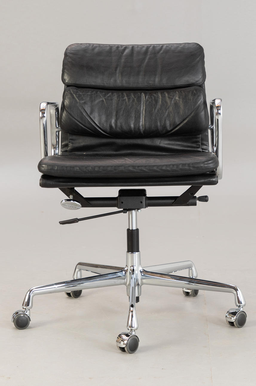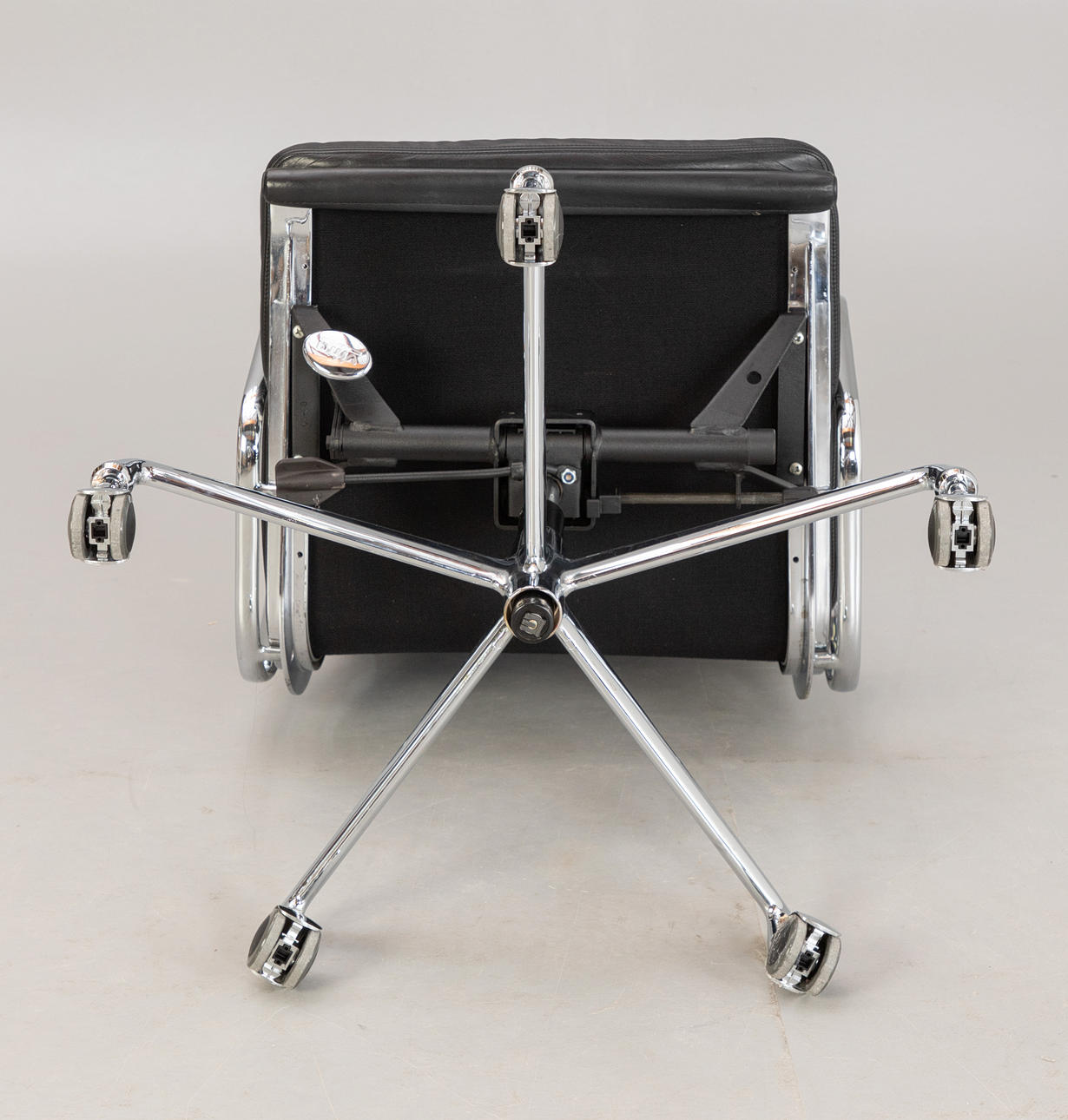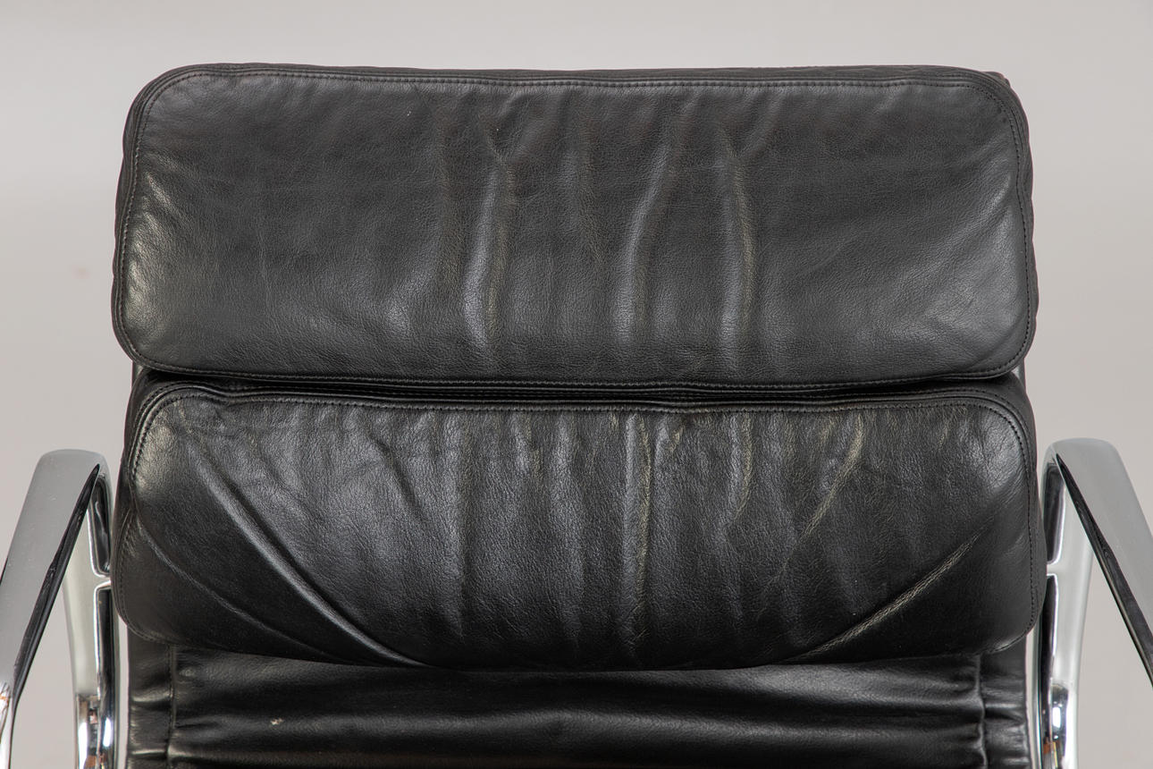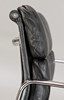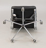 Draft: 1969. Mid-high back. Underframe and armrests, chrome-plated. With roles. Height adjustable. Black leather cover.