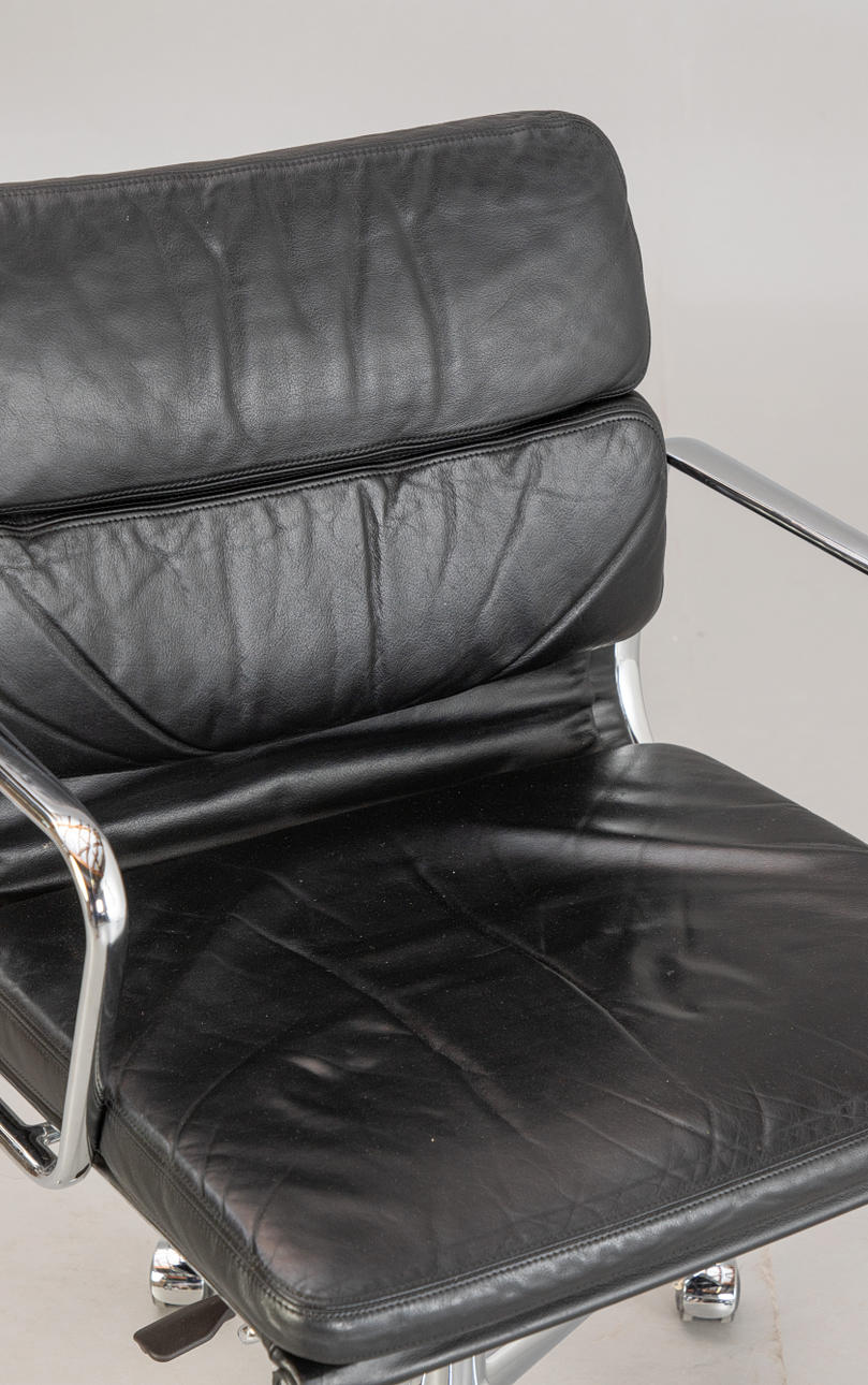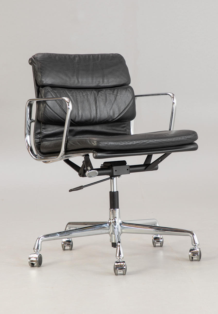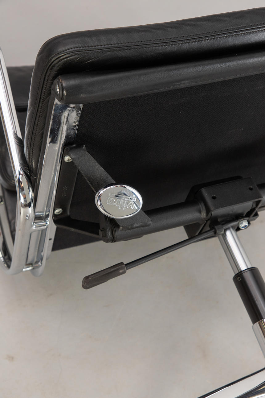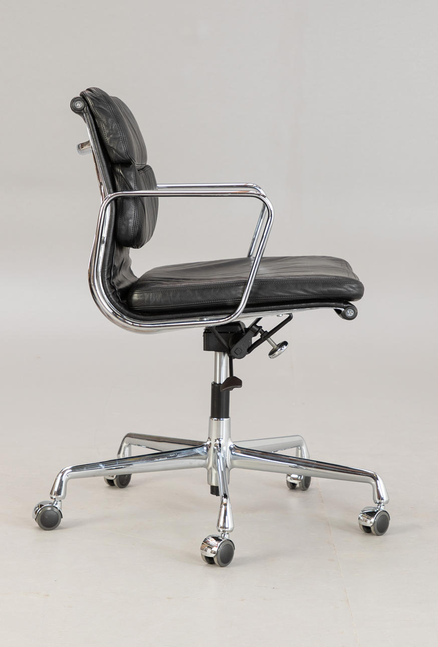 Draft: 1969. Mid-high back. Underframe and armrests, chrome-plated. With roles. Height adjustable. Black leather cover.