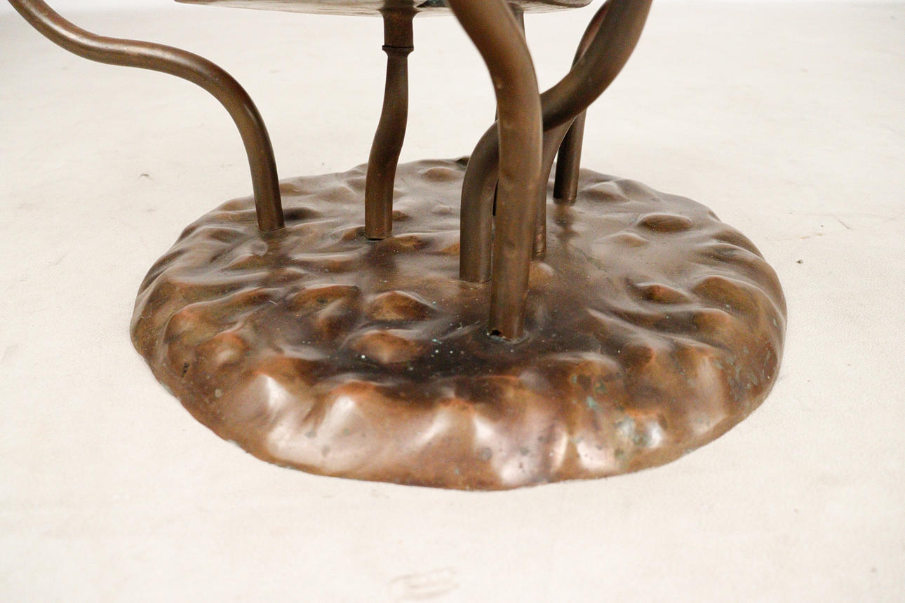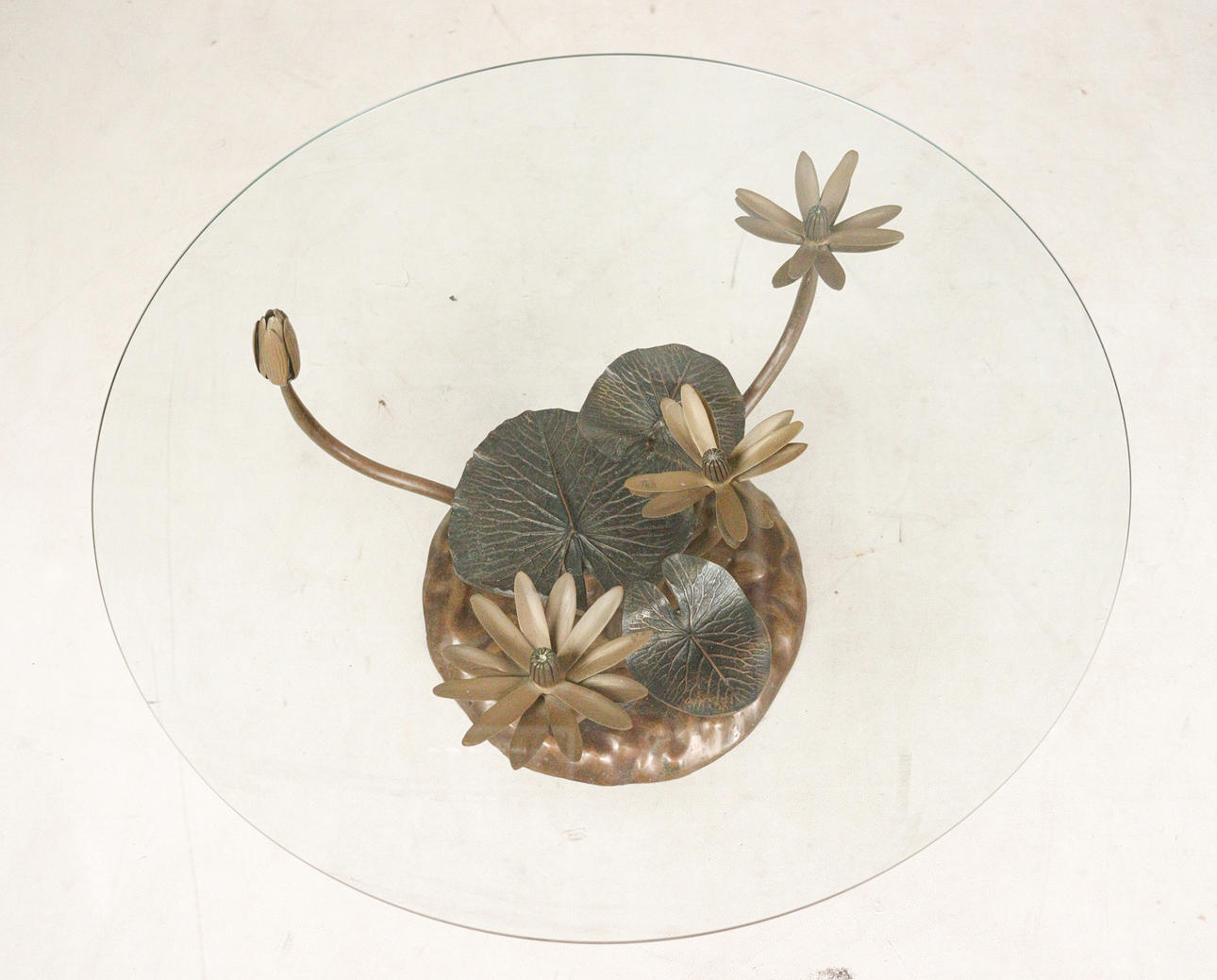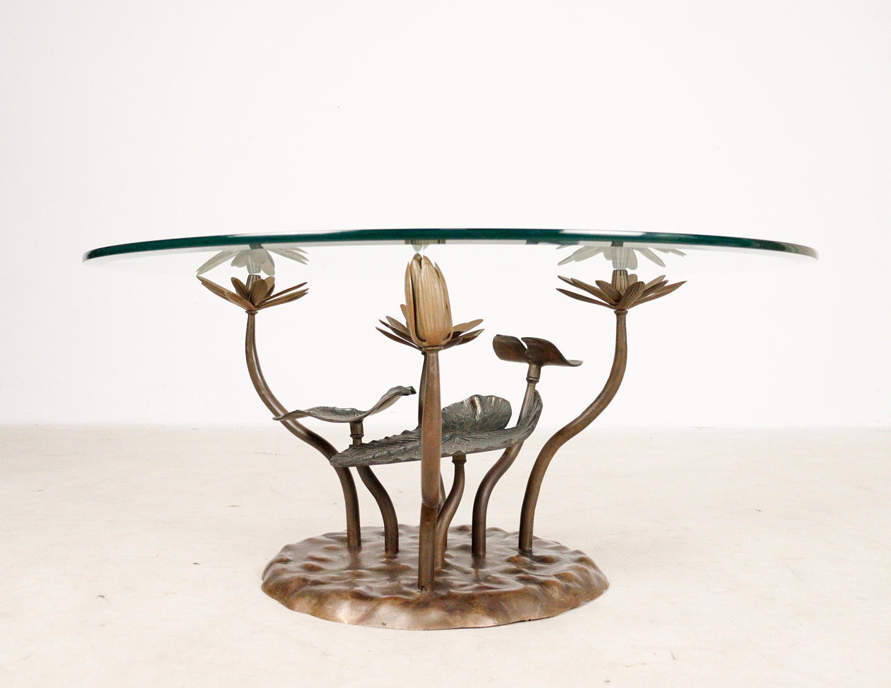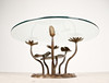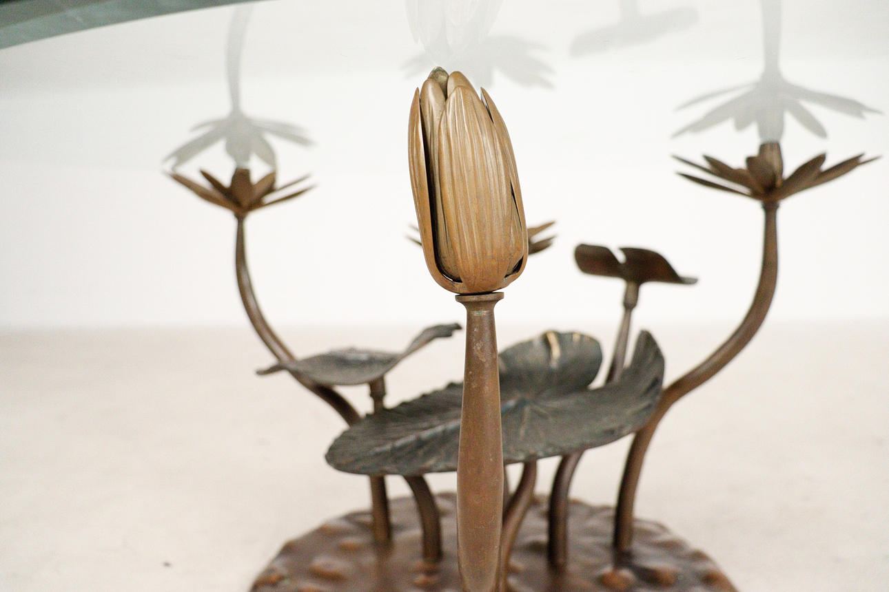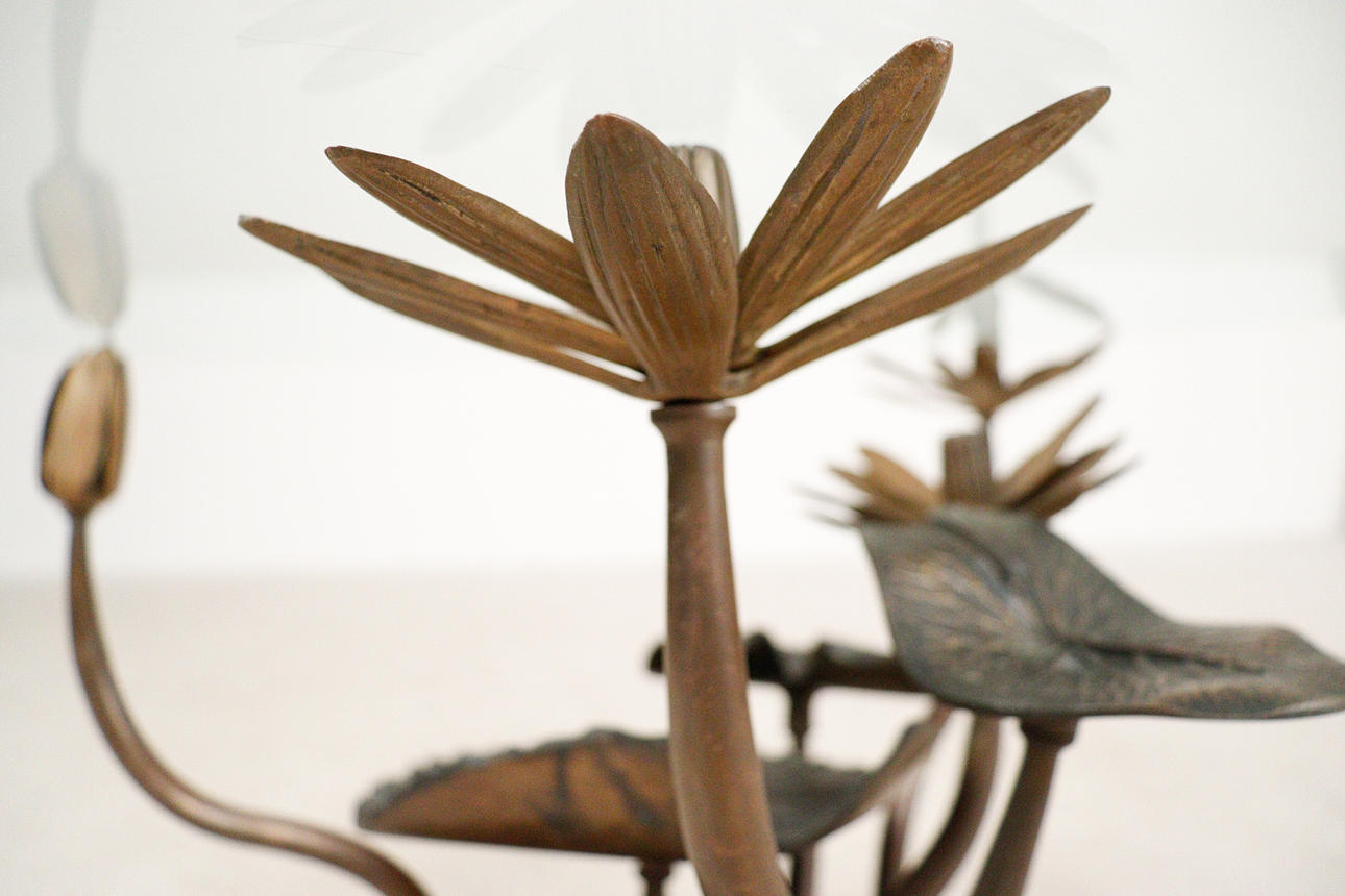Willy Daro, coffee table, 'Lotus', 1970s, solid brass construction, dark patina, loose, round shaped glass plate, dimensions approx.: H. 42 cm, Ø: 90 cm.