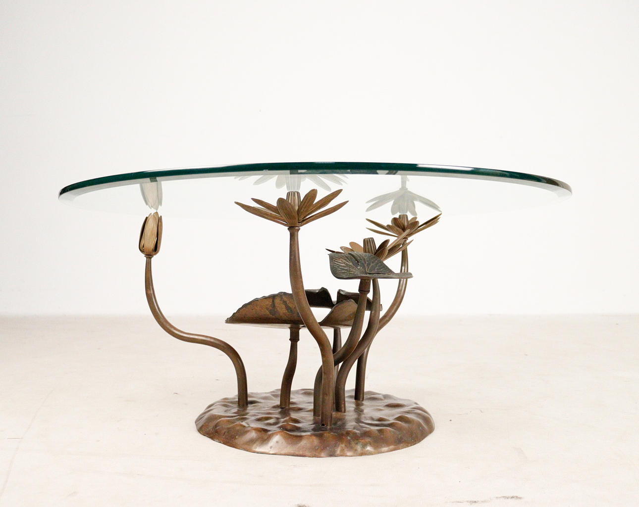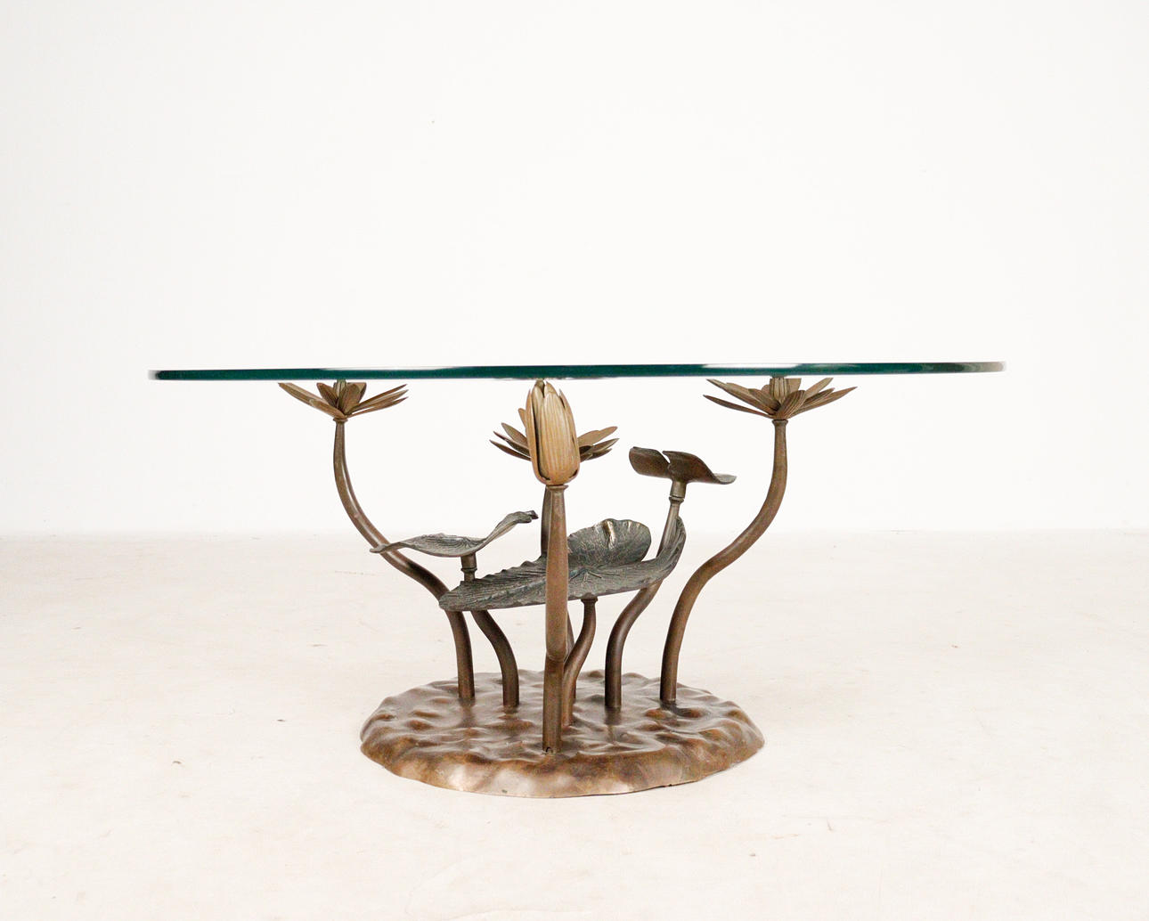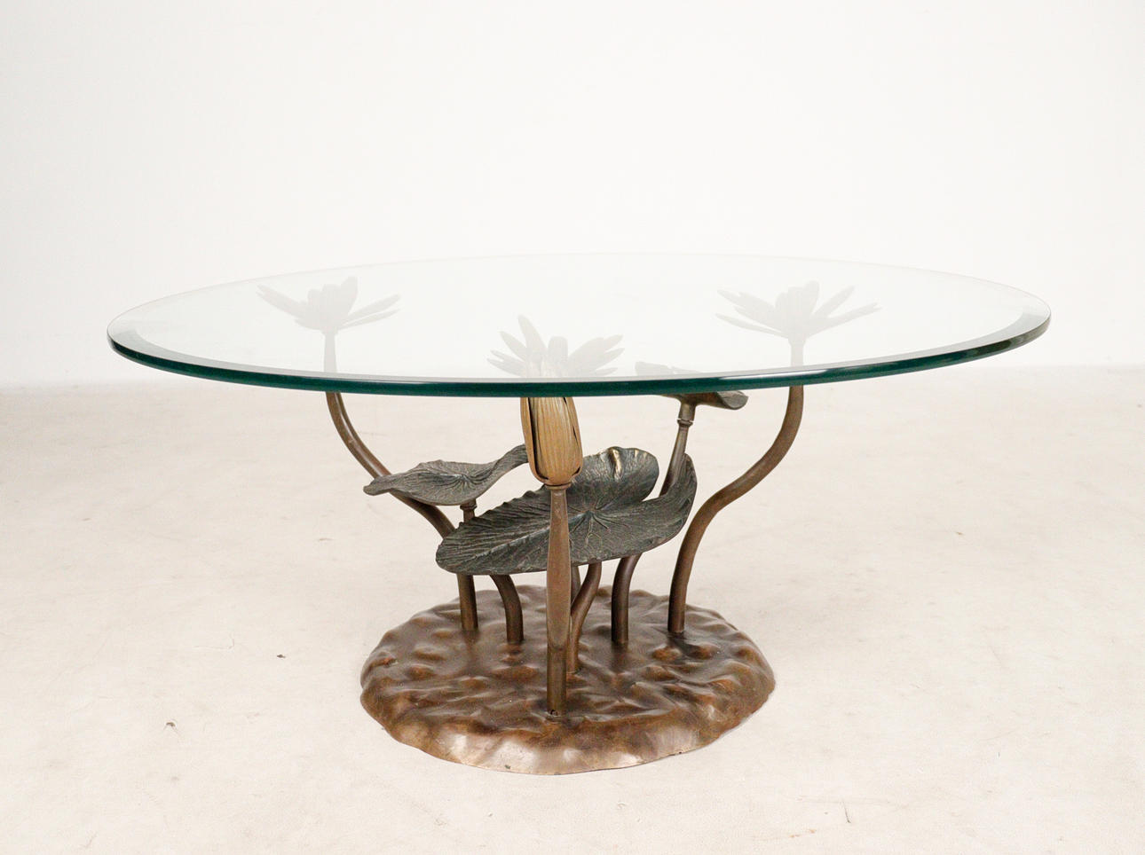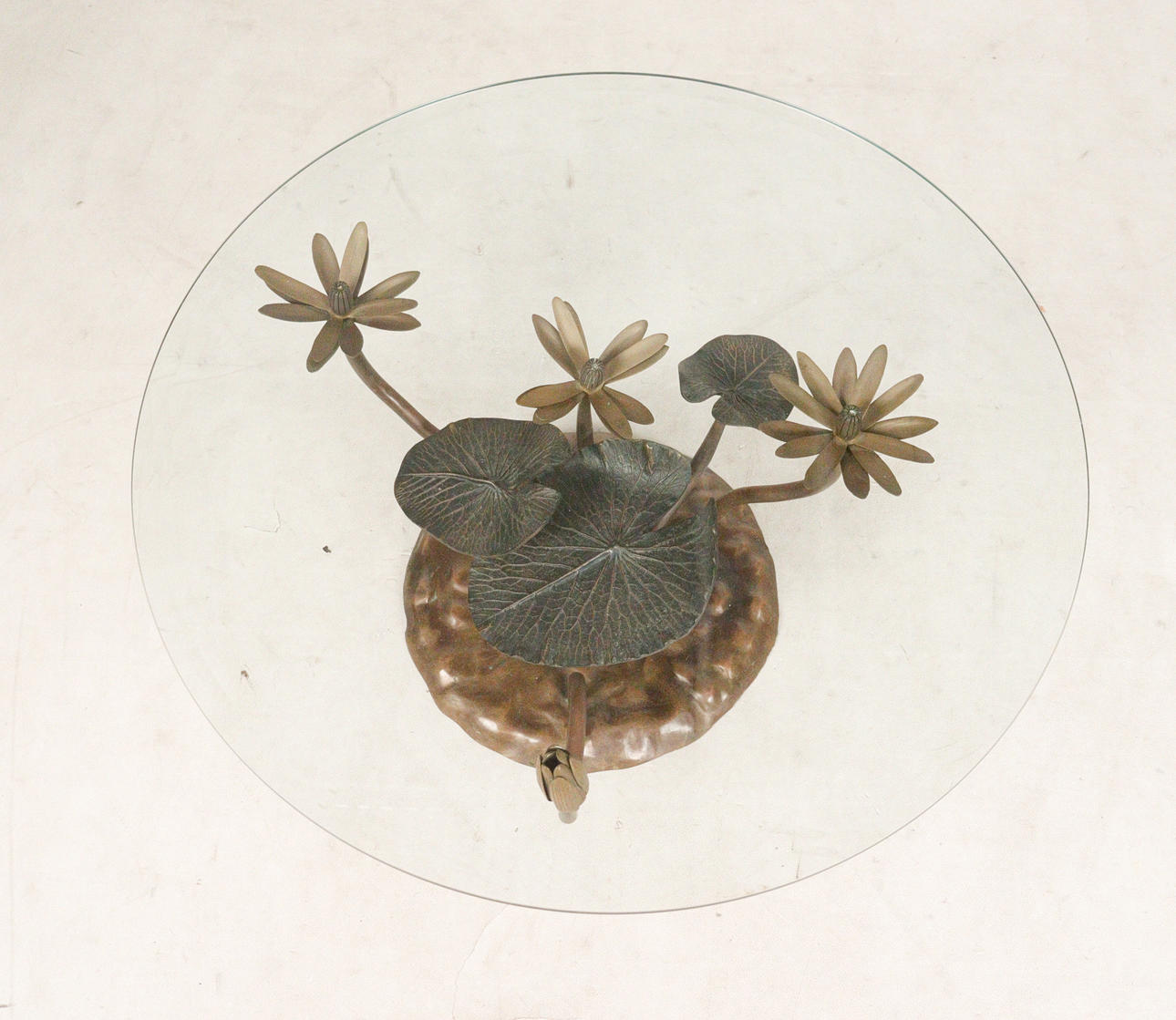 Willy Daro, coffee table, 'Lotus', 1970s, solid brass construction, dark patina, loose, round shaped glass plate, dimensions approx.: H. 42 cm, Ø: 90 cm.