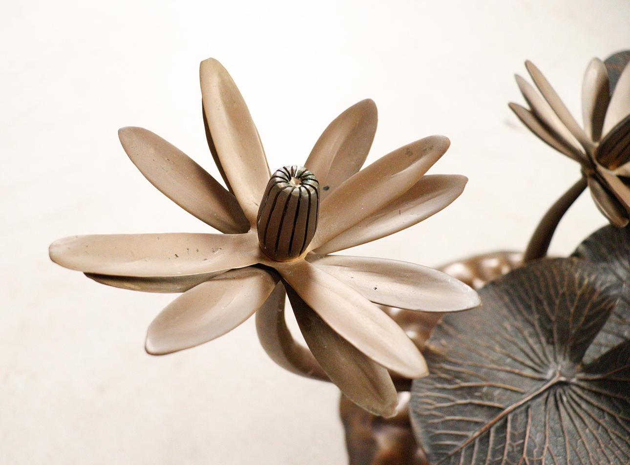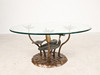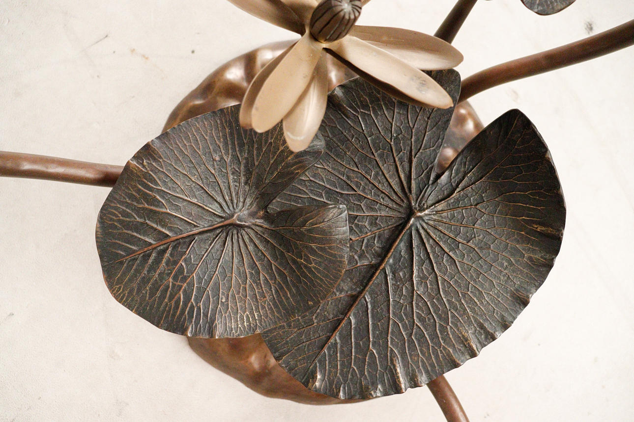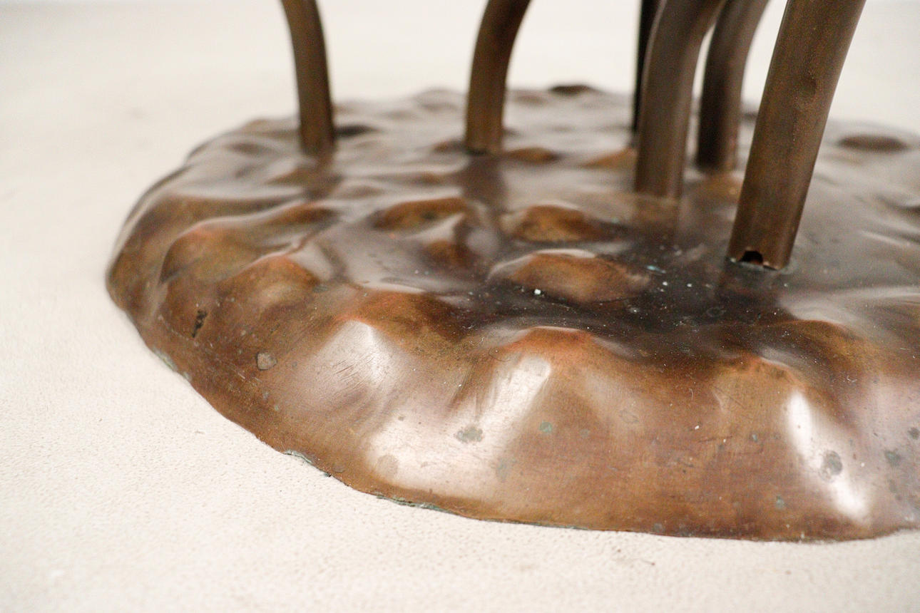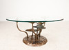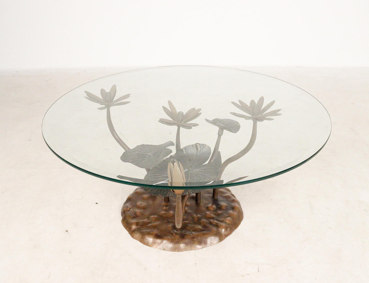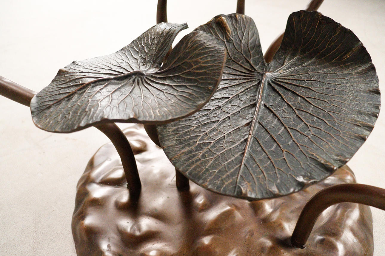 Willy Daro, coffee table, 'Lotus', 1970s, solid brass construction, dark patina, loose, round shaped glass plate, dimensions approx.: H. 42 cm, Ø: 90 cm.