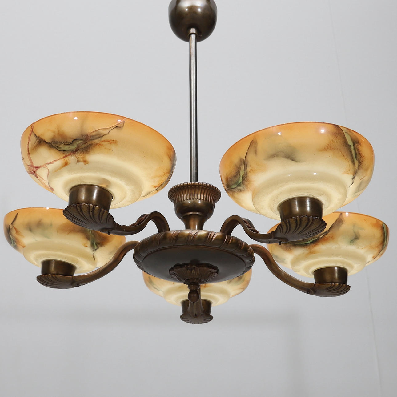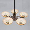 Frame in patinated metal. Glass cups. Five light points, Diameter approx. 60, height 56 cm. Prisms loose, but included.