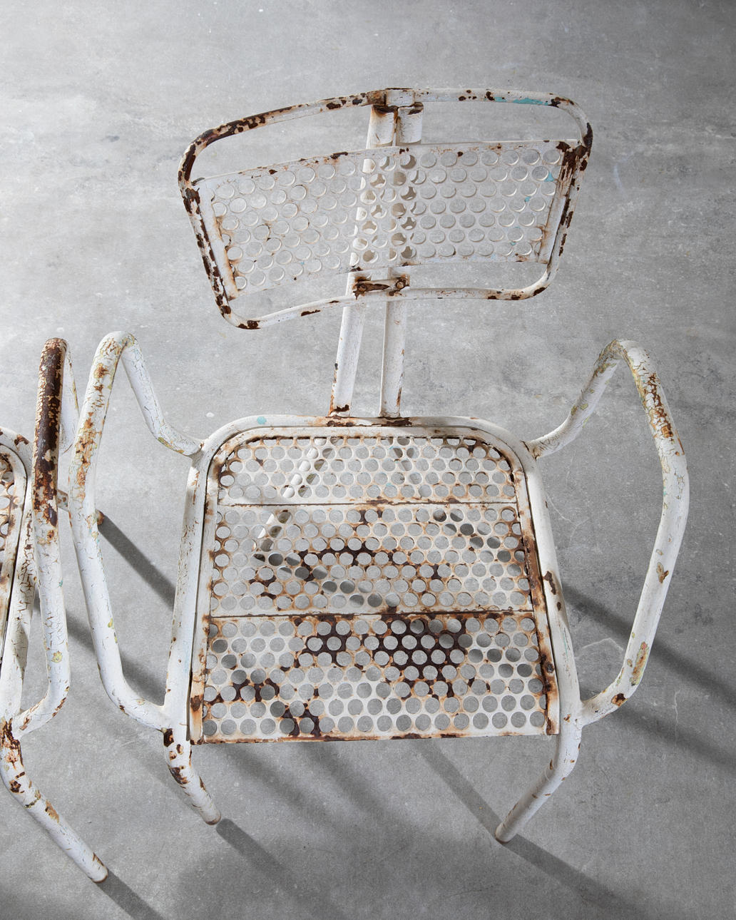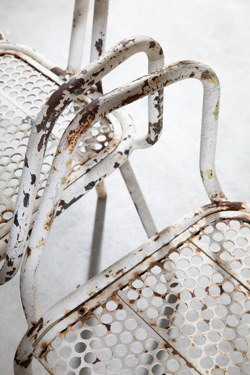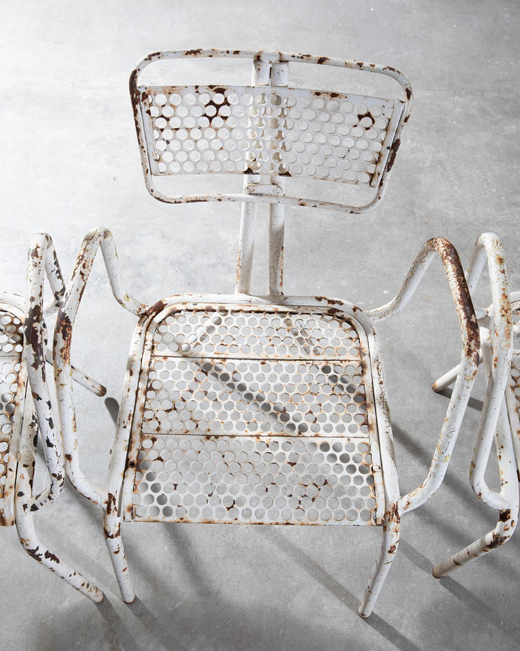 3 chairs. model radar. 1940s. Perforated metal backrests/seats, tubular steel legs painted white. 79x39x53cm.