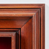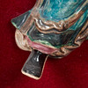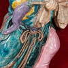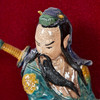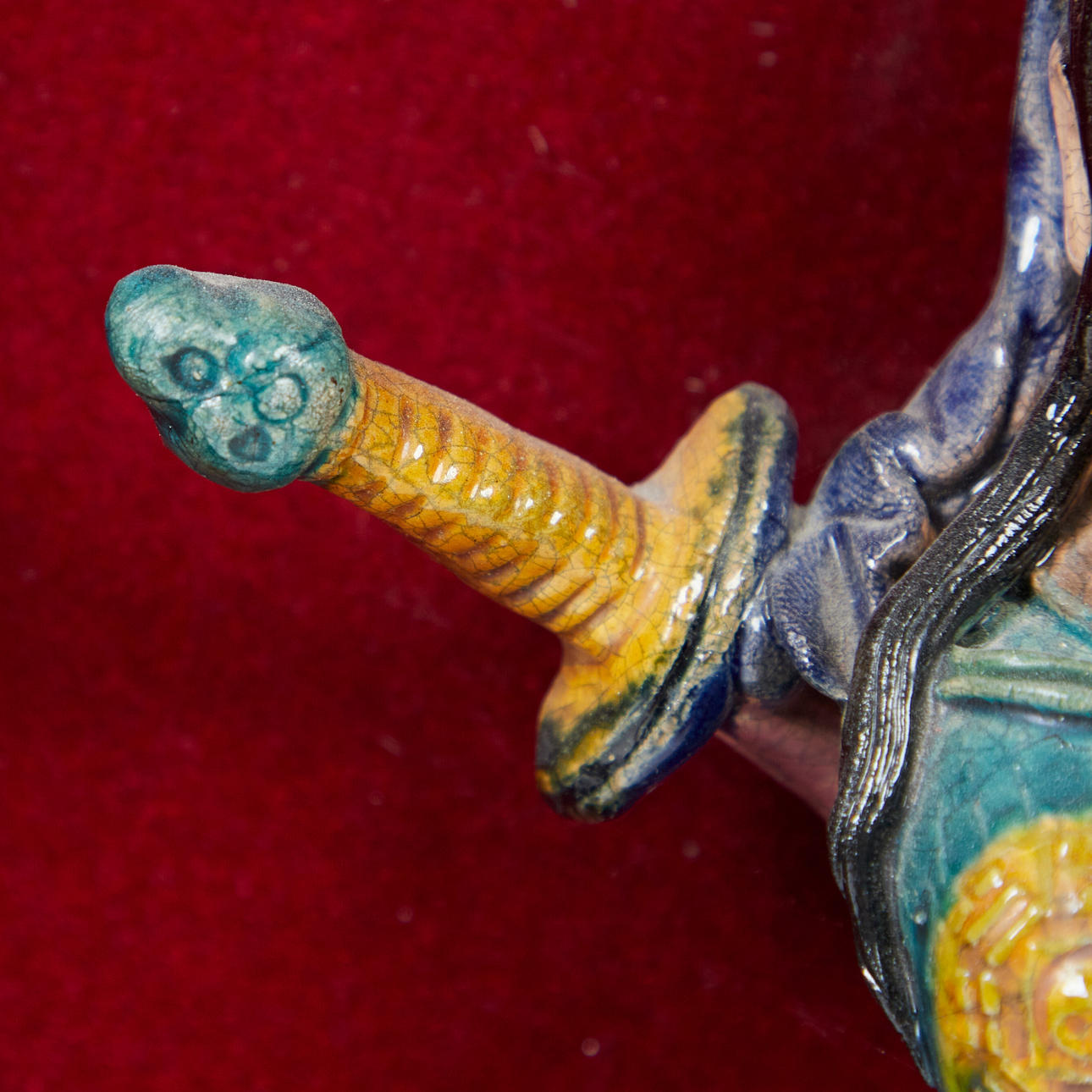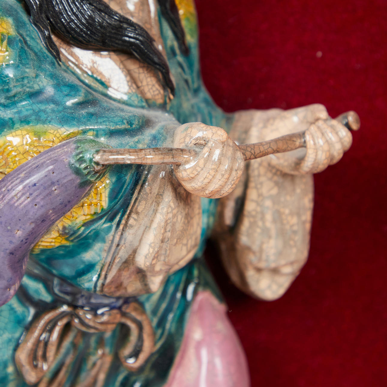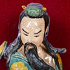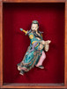 Ceramic figure / sculpture, ceramic, wood, China. Ceramic figure depicting a Chinese god, dressed in a traditional Chinese robe, equipped with a sword, in a floating position, with colorful lacquer staffage, placed inside a wooden frame on a red fabric background, H.28cm, W.15cm, D. 6cm, frame dimensions: H.64cm, W.54cm, D.9cm.