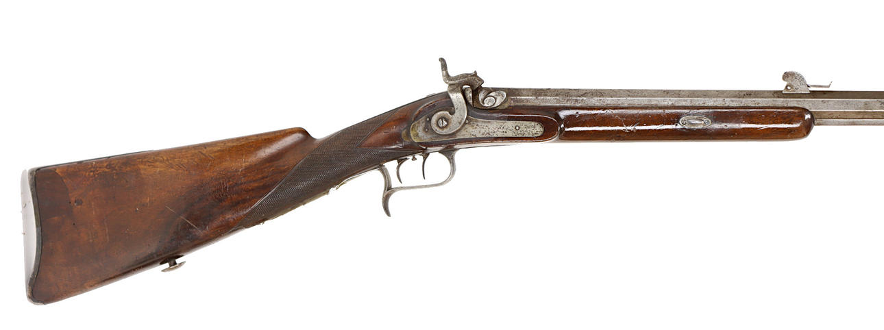 Barrel length 77 cm. Octagonal barrel with sight, spirally fluted barrel approx. 16 mm, fine print, wooden butt with steel buttplate.