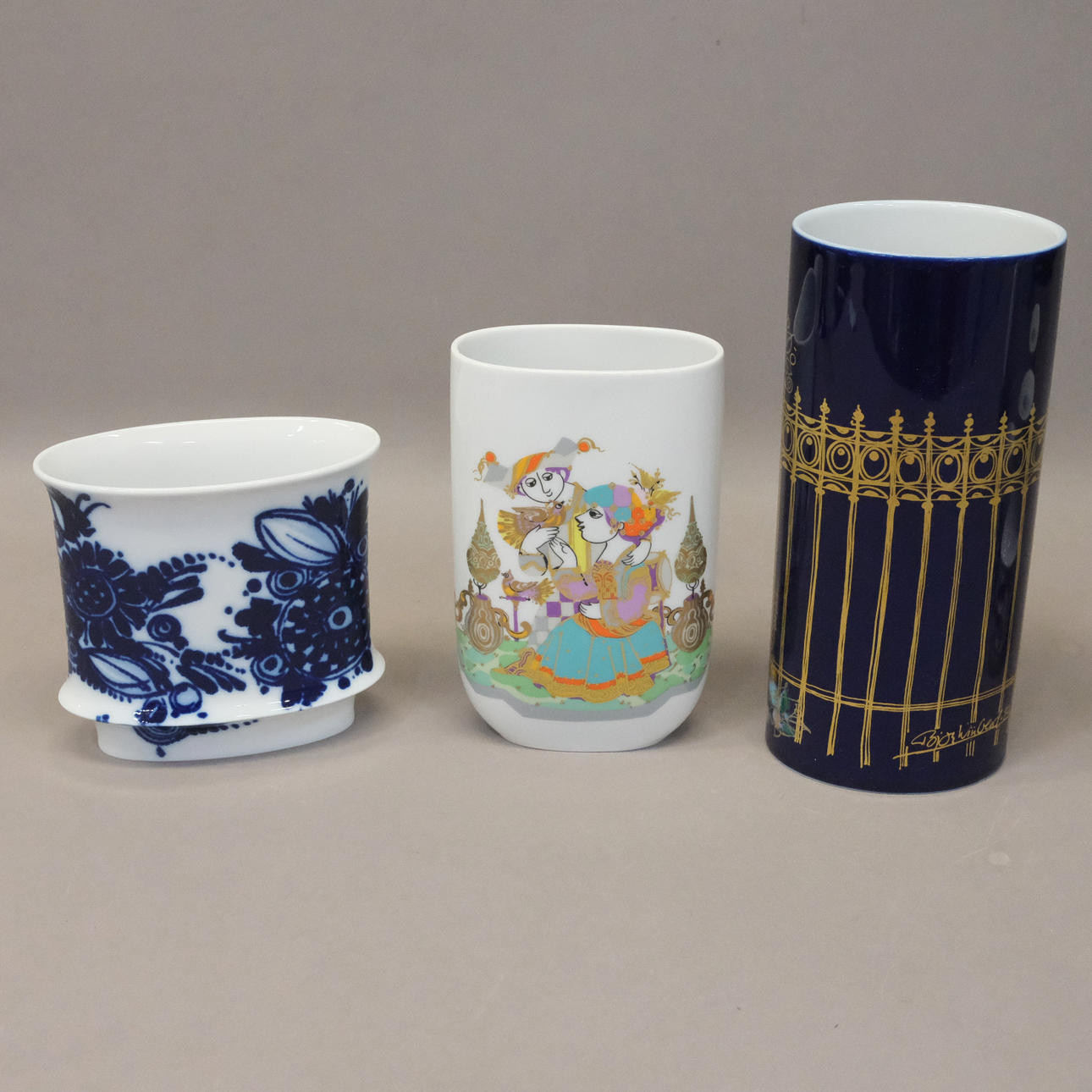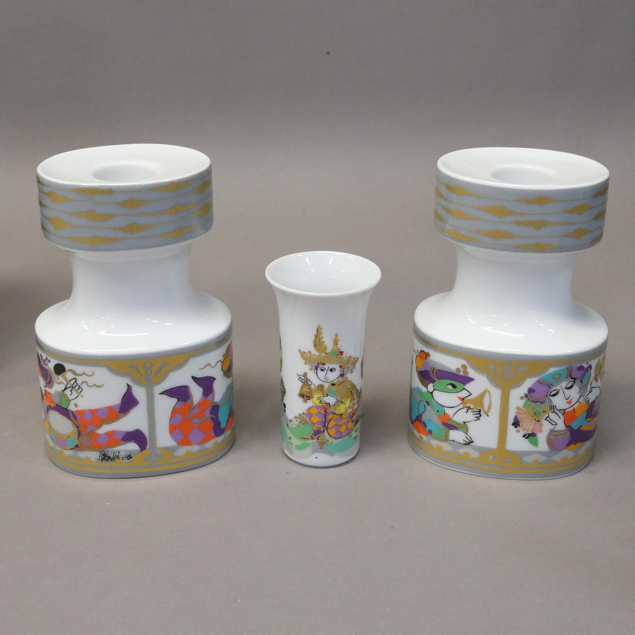 Björn Wiinblad six parts: vase, 1001 Nacht. Height: 24 cm. With labeling at the bottom; dish with motif, Commedia dell' arte. Dimensions of the dish: 22 x 17 cm; vase, height: approx. 8.5 cm; two candlesticks, height: approx. 13 cm; vase approx. 18 cm, marked Commedia dell' arte.