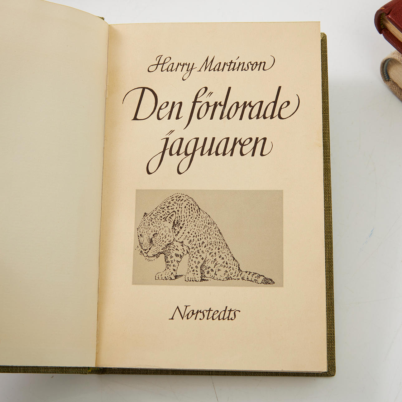 The lost jaguar. Stockholm, 1941 (green ball binding with dark red leather label, yellow top section and bound cover, signed GC on the inside of the back cover.