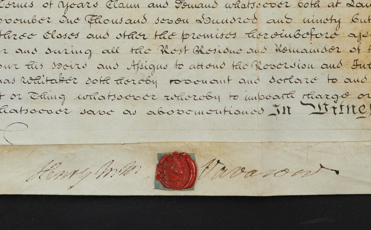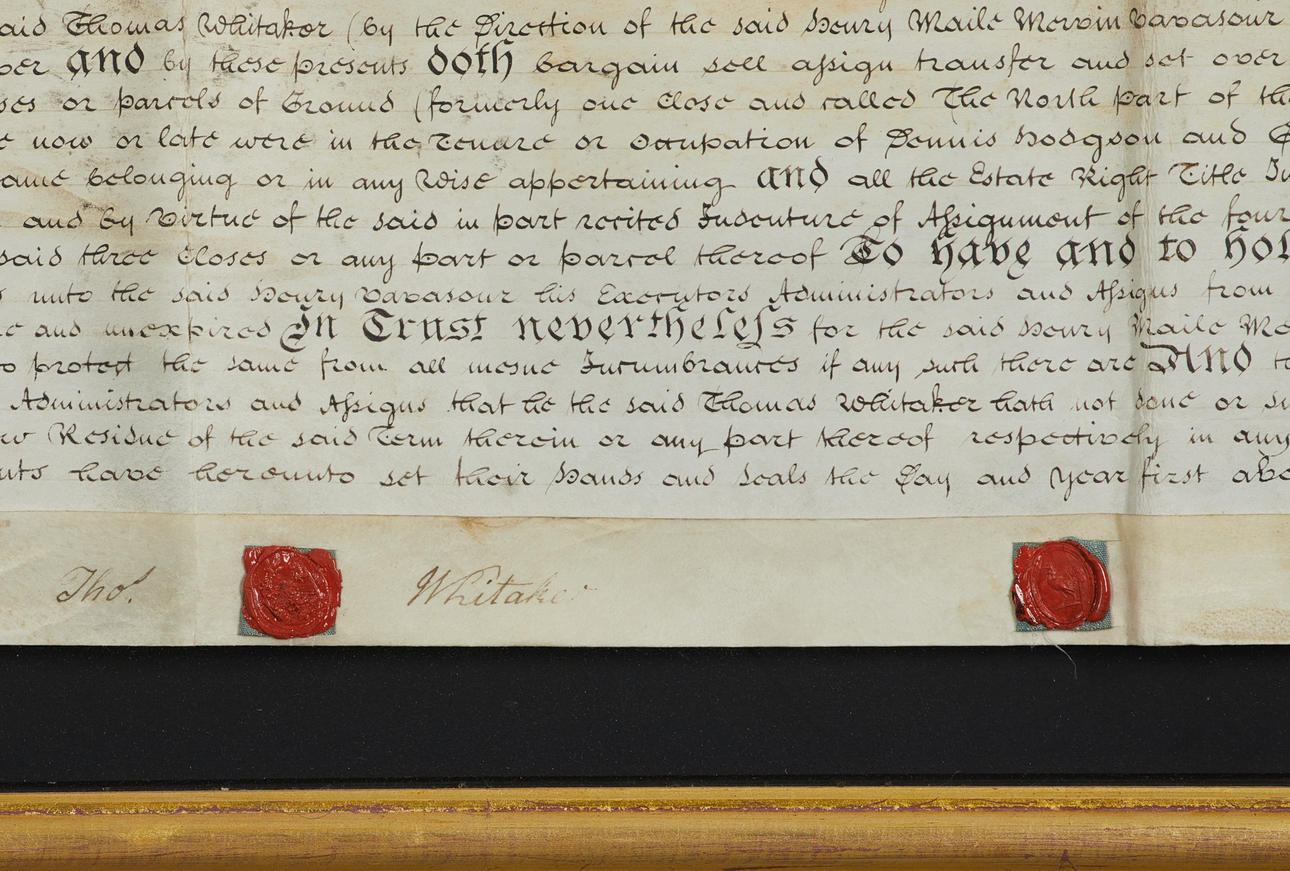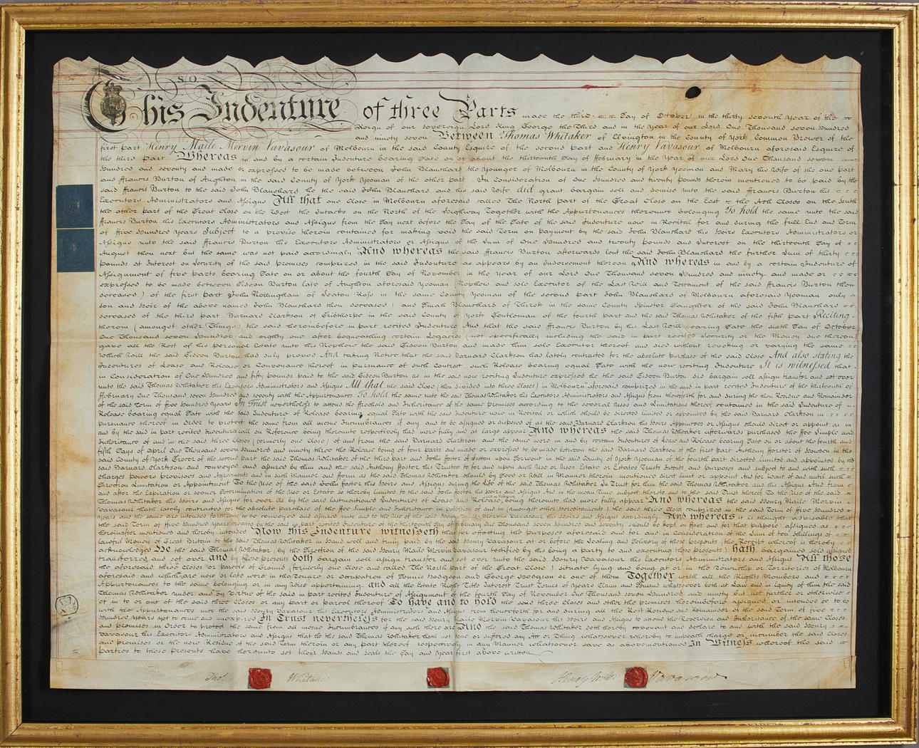 Large document / handwritten British assignment with seal dated 1797 at York made in three parts signed Thomas Whitaker and Sir Henry Vasasour of Melbourne Hall.