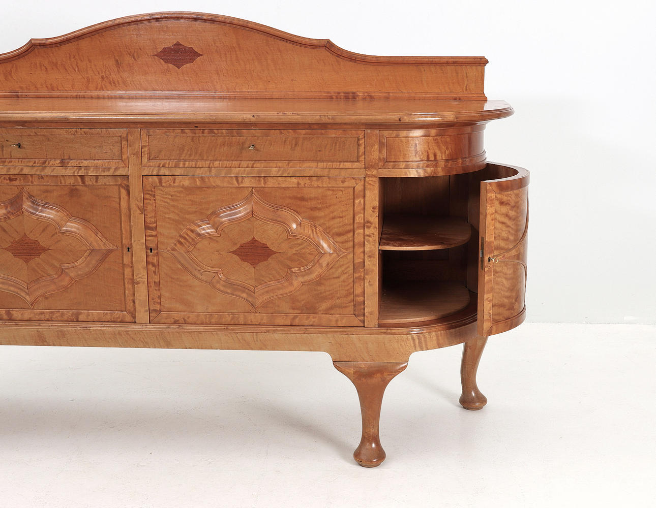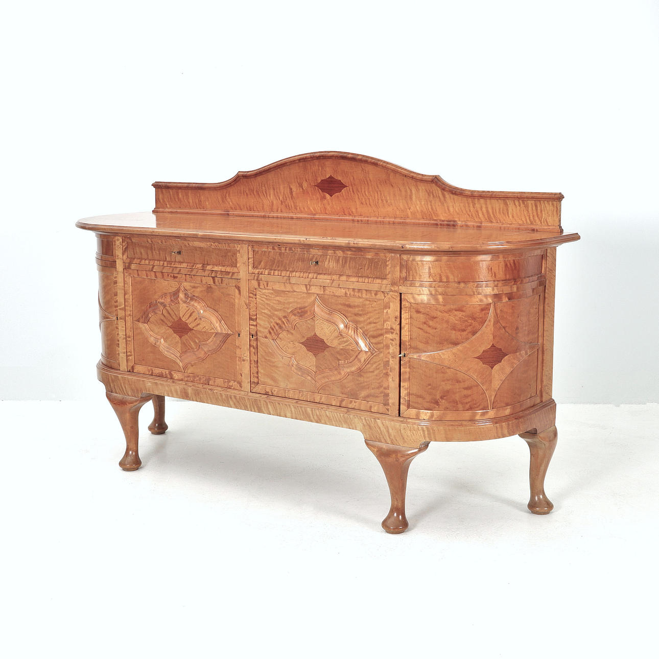 Large serving sideboard/buffet, birch, marquetry, Queen Anne style foot end. 1920s. Mobilia AB, Malmö. 3 keys included.