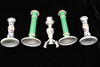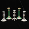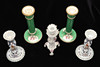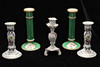 All 20th century, the first a green painted pair of candlesticks decorated sprays of flowers within gilt borders, each 22cm high,