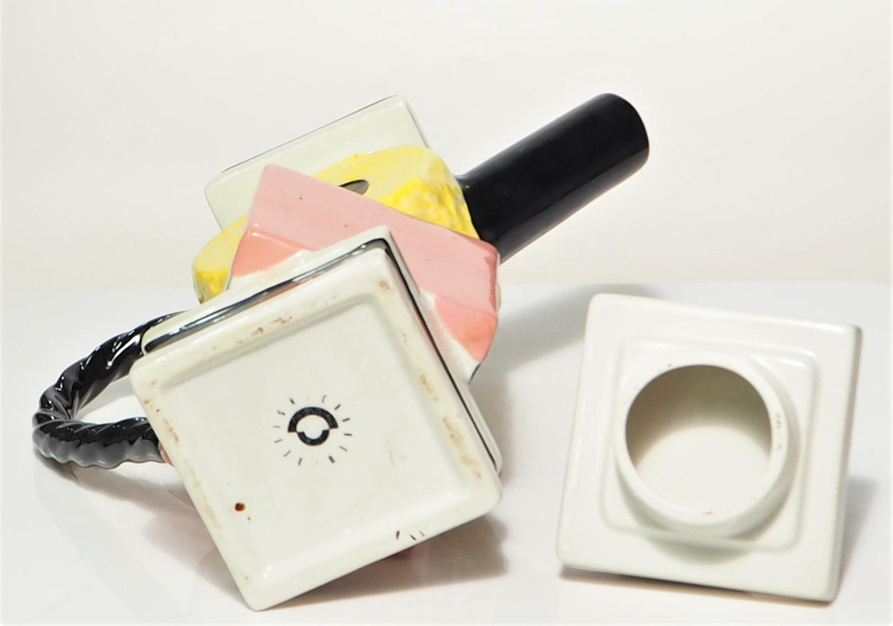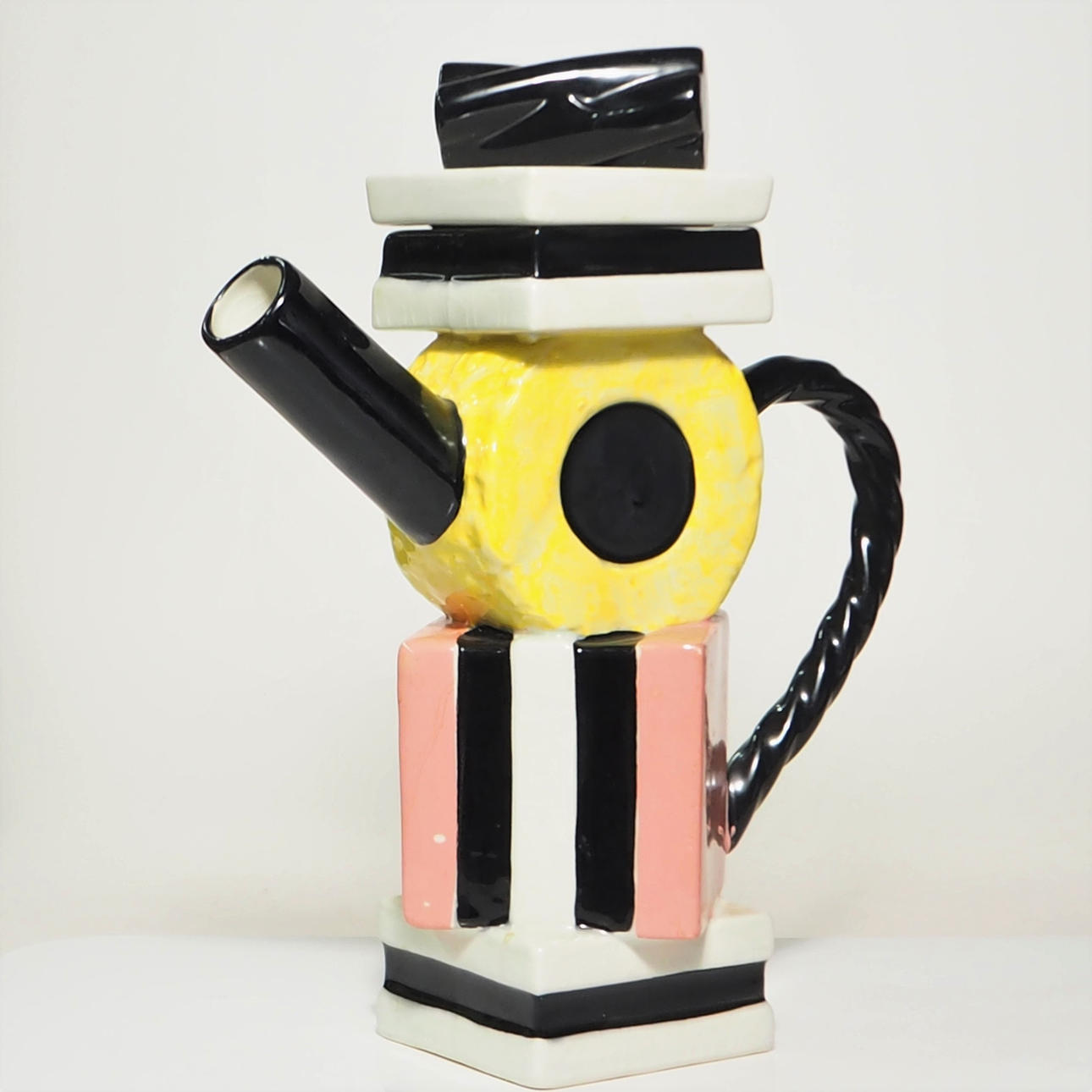 South West Ceramics (early Paul Cardew) design teapot originally produced from the 1980s. Features an arrangement of 'licorice varieties' placed on top of each other with a licorice twist as a handle.