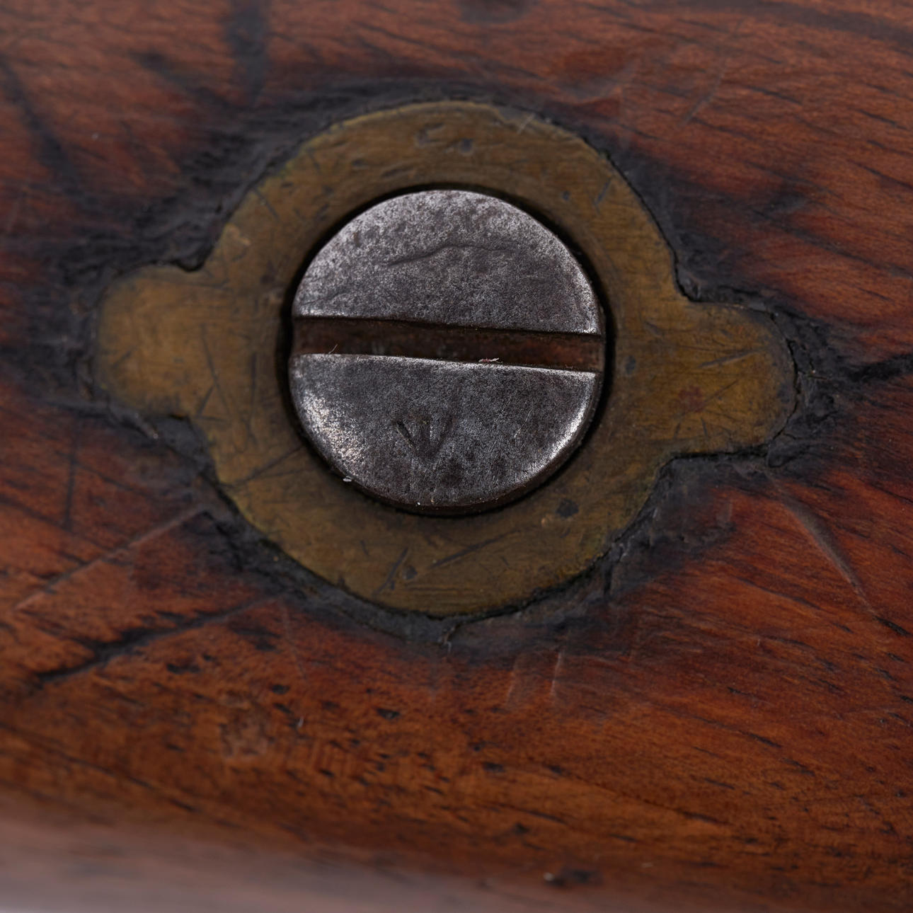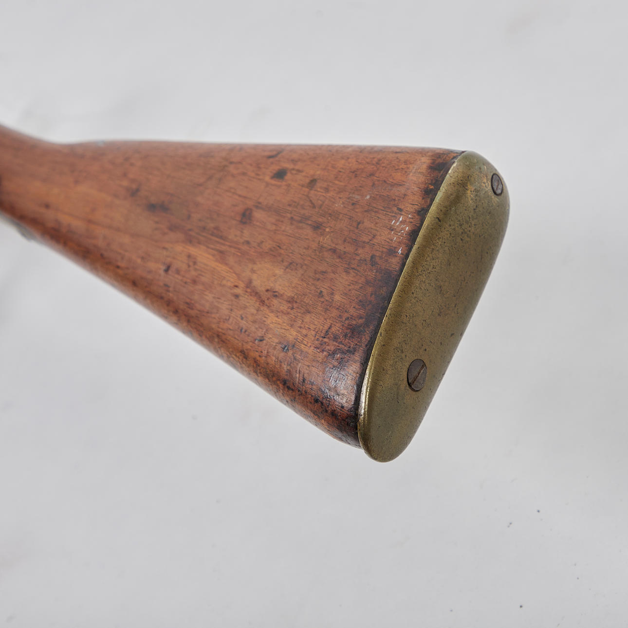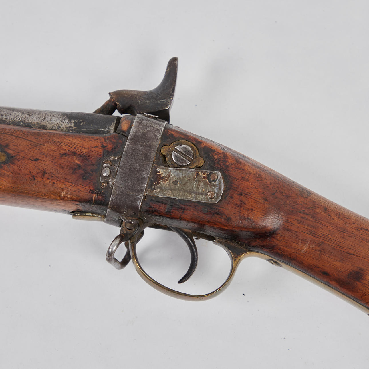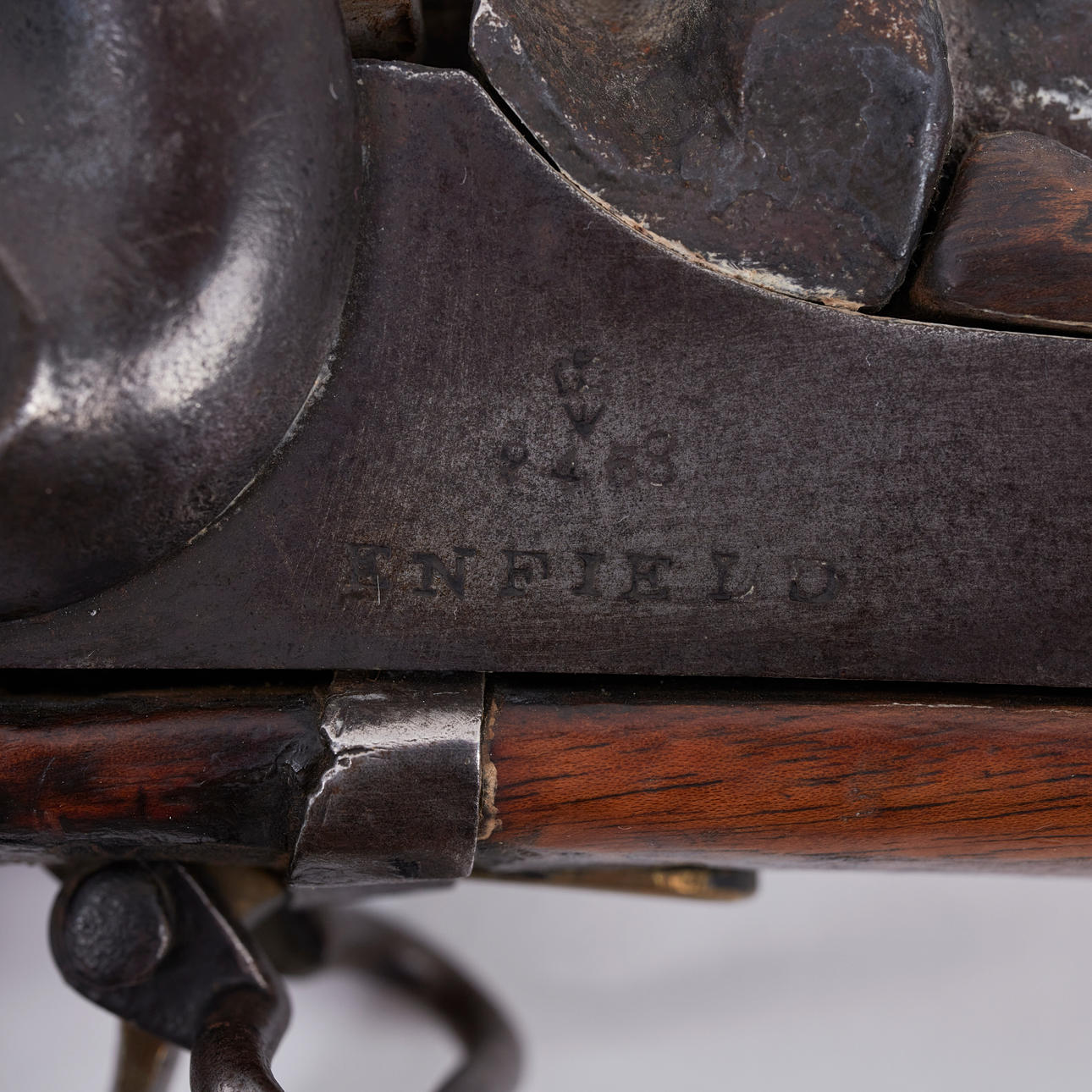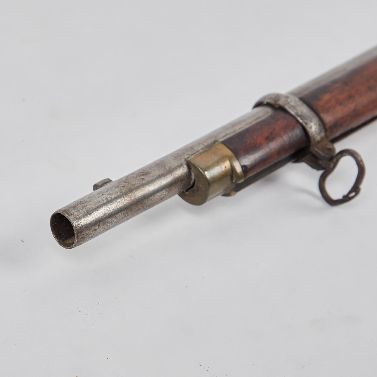 Enfield, British cavalry muzzle-loading rifle, mid 19th century. Rifle with percussion mechanism, walnut stock with iron fittings, two barrel rings, trigger guard and forearm cap made of brass, lock plate embossed with national emblem, 'Enfield' and '2468 under crown', welded, cannot fire, L.113cm, barrel length: 76cm.