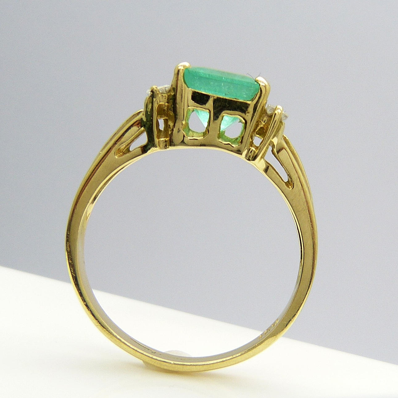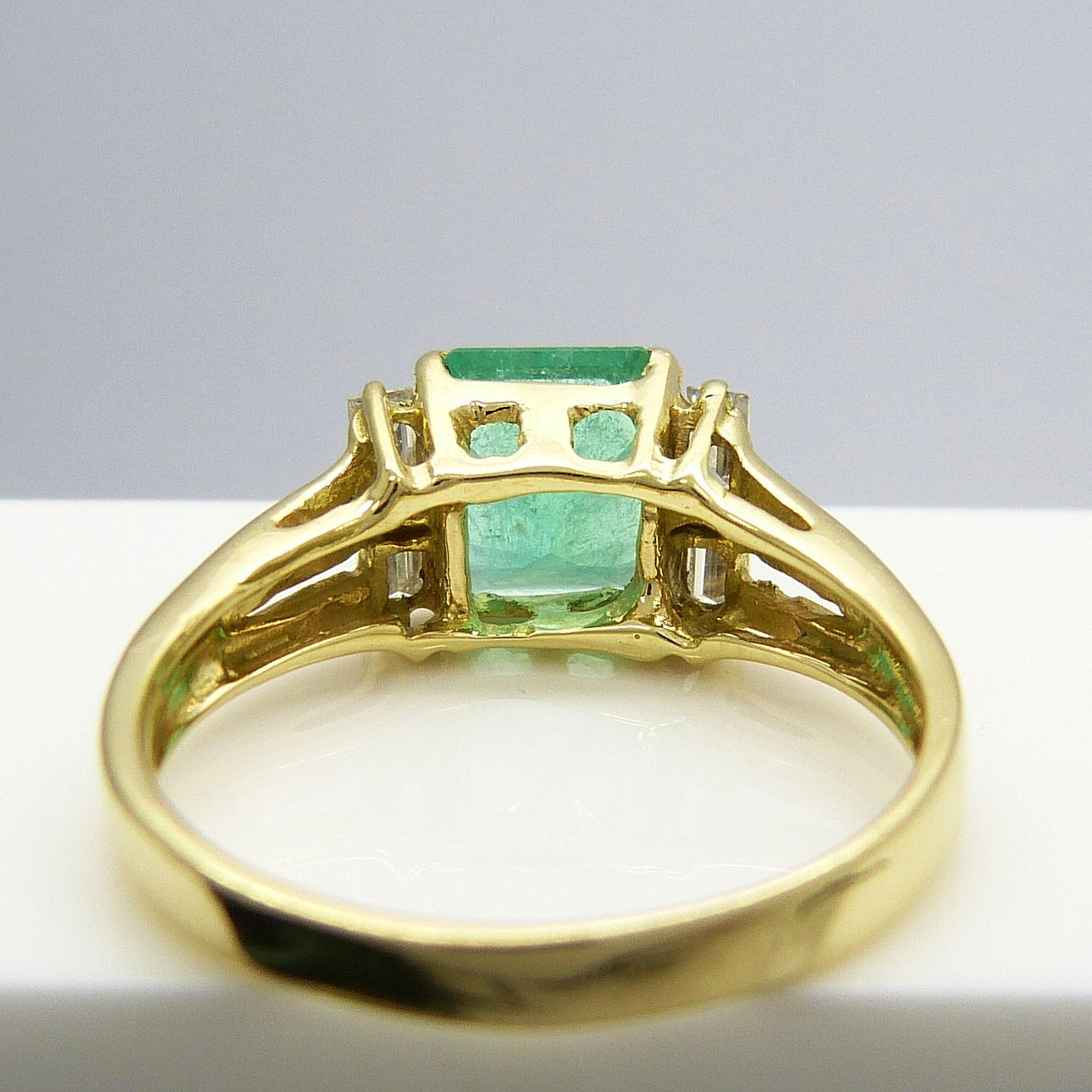 Claw set to the centre of this ring is a square-cut naturally-flawed green emerald gemstone weighing 1.73 carats, approx.